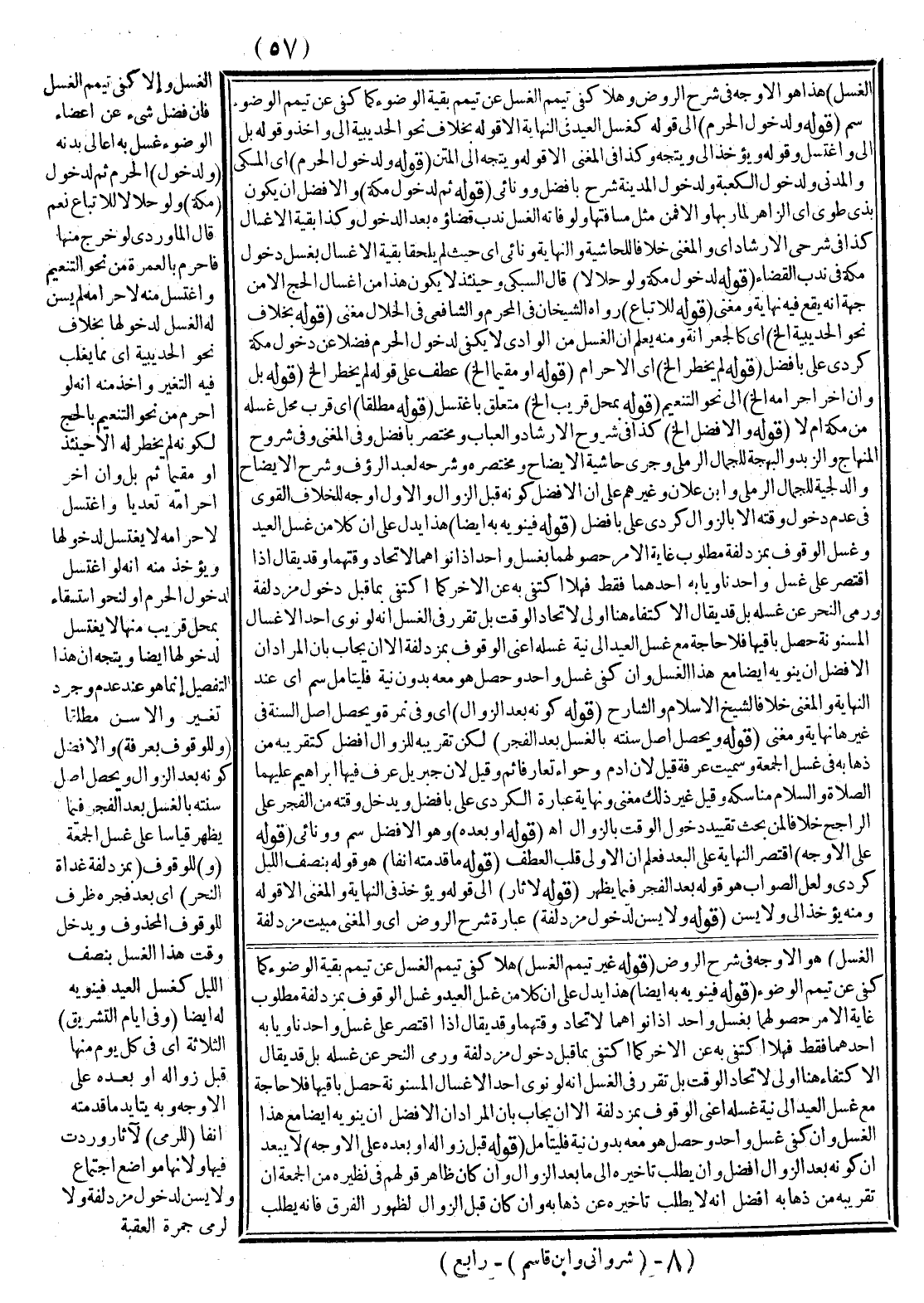 الْغُسْلِ وَإِلَّا كَفَى تَيَمُّمُ الْغُسْلِ، فَإِنْ فَضَلَ شَيْءٌ عَنْ أَعْضَاءِ الْوُضُوءِ غَسَلَ بِهِ أَعَالِيَ بَدَنِهِ (وَلِدُخُولِ) الْحَرَمِ ثُمَّ لِدُخُولِ (مَكَّةَ) وَلَوْ حَلَالًا لِلِاتِّبَاعِ نَعَمْ قَالَ الْمَاوَرْدِيُّ لَوْ خَرَجَ مِنْهَا فَأَحْرَمَ بِالْعُمْرَةِ مِنْ نَحْوِ التَّنْعِيمِ وَاغْتَسَلَ مِنْهُ لِإِحْرَامِهِ لَمْ يُسَنَّ لَهُ الْغُسْلُ لِدُخُولِهَا بِخِلَافِ نَحْوِ الْحُدَيْبِيَةِ أَيْ مِمَّا يَغْلِبُ فِيهِ التَّغَيُّرُ وَأُخِذَ مِنْهُ أَنَّهُ لَوْ أَحْرَمَ مِنْ نَحْوِ التَّنْعِيمِ بِالْحَجِّ لِكَوْنِهِ لَمْ يَخْطِرْ لَهُ إلَّا حِينَئِذٍ أَوْ مُقِيمًا ثُمَّ بُلَّ، وَإِنْ أَخَّرَ إحْرَامَهُ تَعَدِّيًا وَاغْتَسَلَ لِإِحْرَامِهِ لَا يَغْتَسِلُ لِدُخُولِهَا وَيُؤْخَذُ مِنْهُ أَنَّهُ لَوْ اغْتَسَلَ لِدُخُولِ الْحَرَمِ أَوْ لِنَحْوِ اسْتِسْقَاءٍ بِمَحَلٍّ قَرِيبٍ مِنْهَا لَا يَغْتَسِلُ لِدُخُولِهَا أَيْضًا وَيَتَّجِهُ أَنَّ هَذَا التَّفْصِيلَ إنَّمَا هُوَ عِنْدَ عَدَمِ وُجُودِ تَغَيُّرٍ وَإِلَّا سُنَّ مُطْلَقًا (وَلِلْوُقُوفِ بِعَرَفَةَ) وَالْأَفْضَلُ كَوْنُهُ بَعْدَ الزَّوَالِ وَيَحْصُلُ أَصْلُ سُنَّتِهِ بِالْغُسْلِ بَعْدَ الْفَجْرِ فِيمَا يَظْهَرُ قِيَاسًا عَلَى غُسْلِ الْجُمُعَةِ (و) لِلْوُقُوفِ (بِمُزْدَلِفَةَ غَدَاةَ النَّحْرِ) أَيْ بَعْدَ فَجْرِهِ ظَرْفٌ لِلْوُقُوفِ الْمَحْذُوفِ وَيَدْخُلُ وَقْتُ هَذَا الْغُسْلِ بِنِصْفِ اللَّيْلِ كَغُسْلِ الْعِيدِ فَيَنْوِيهِ بِهِ أَيْضًا (وَفِي أَيَّامِ التَّشْرِيقِ) الثَّلَاثَةِ أَيْ فِي كُلِّ يَوْمٍ مِنْهَا قَبْلَ زَوَالِهِ أَوْ بَعْدَهُ عَلَى الْأَوْجَهِ وَبِهِ يَتَأَيَّدُ مَا قَدَّمْته آنِفًا (لِلرَّمْيِ) لِآثَارٍ وَرَدَتْ فِيهَا وَلِأَنَّهَا مَوَاضِعُ اجْتِمَاعٍ وَلَا يُسَنُّ لِدُخُولِ مُزْدَلِفَةَ وَلَا لِرَمْيِ جَمْرَةِ الْعَقَبَةِ