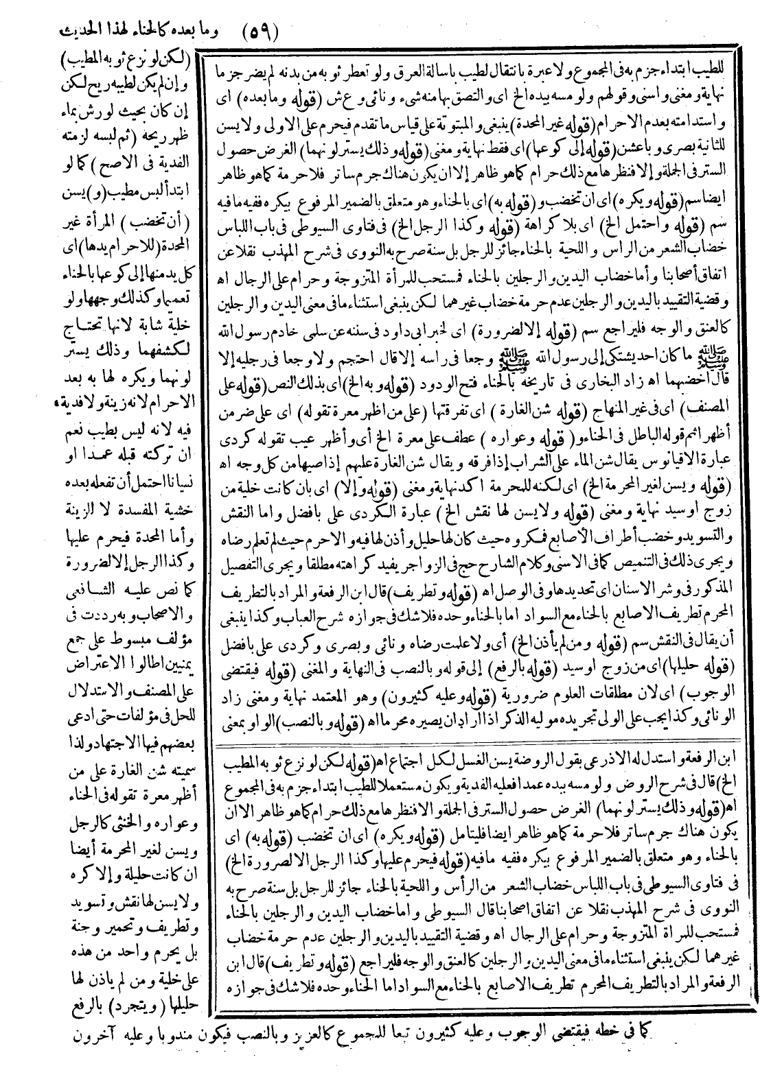 (قَوْلُهُ: وَاحْتُمِلَ إلَخْ) أَيْ بِلَا كَرَاهَةٍ (قَوْلُهُ: وَكَذَا الرَّجُلُ إلَخْ) فِي فَتَاوَى السُّيُوطِيّ فِي بَابِ اللِّبَاسِ خِضَابُ الشَّعْرِ مِنْ الرَّأْسِ وَاللِّحْيَةِ بِالْحِنَّاءِ جَائِزٌ لِلرَّجُلِ بَلْ سُنَّةٌ صَرَّحَ بِهِ النَّوَوِيُّ فِي شَرْحِ الْمُهَذَّبِ نَقْلًا عَنْ اتِّفَاقِ أَصْحَابِنَا وَأَمَّا خِضَابُ الْيَدَيْنِ وَالرِّجْلَيْنِ بِالْحِنَّاءِ فَمُسْتَحَبٌّ لِلْمَرْأَةِ الْمُتَزَوِّجَةِ وَحَرَامٌ عَلَى الرِّجَالِ انْتَهَى وَقَضِيَّةُ التَّقْيِيدِ بِالْيَدَيْنِ وَالرِّجْلَيْنِ عَدَمُ حُرْمَةِ خِضَابِ غَيْرِهِمَا لَكِنْ يَنْبَغِي اسْتِثْنَاءُ مَا فِي مَعْنَى الْيَدَيْنِ وَالرِّجْلَيْنِ كَالْعُنُقِ وَالْوَجْهِ فَلْيُرَاجَعْ سم (قَوْلُهُ: إلَّا لِضَرُورَةٍ) أَيْ لِخَبَرِ أَبِي دَاوُد فِي سُنَنِهِ عَنْ سَلْمَى خَادِمِ رَسُولِ اللَّهِ - صَلَّى اللَّهُ عَلَيْهِ وَسَلَّمَ - «مَا كَانَ أَحَدٌ يَشْتَكِي إلَى رَسُولِ اللَّهِ - صَلَّى اللَّهُ عَلَيْهِ وَسَلَّمَ - وَجَعًا فِي رَأْسِهِ إلَّا قَالَ احْتَجِمْ وَلَا وَجَعًا فِي رِجْلَيْهِ إلَّا قَالَ خَضِّبْهُمَا» اهـ زَادَ الْبُخَارِيُّ فِي تَارِيخِهِ «بِالْحِنَّاءِ» فَتْحُ الْوَدُودِ (قَوْلُهُ: وَبِهِ إلَخْ) أَيْ بِذَلِكَ النَّصِّ (قَوْلُهُ: عَلَى الْمُصَنِّفِ) أَيْ فِي غَيْرِ الْمِنْهَاجِ (قَوْلُهُ: شَنُّ الْغَارَةِ) أَيْ تَفْرِقَتُهَا (عَلَى مَنْ أَظْهَرَ مَعَرَّةَ تَقَوُّلِهِ) أَيْ عَلَى ضُرِّ مَنْ أَظْهَرَ إثْمَ قَوْلِهِ الْبَاطِلِ فِي الْحِنَّاءِ وَ (قَوْلُهُ: وَعَوَارَهُ) عُطِفَ عَلَى مَعَرَّةٍ إلَخْ أَيْ وَأَظْهَرَ عَيْبَ تَقَوُّلٍ كُرْدِيٌّ عِبَارَةُ الْأُقْيَانُوسِ يُقَالُ شَنَّ الْمَاءَ عَلَى الشَّرَابِ إذَا فَرَّقَهُ وَيُقَالُ شَنَّ الْغَارَةَ عَلَيْهِمْ إذَا صَبَّهَا مِنْ كُلِّ وَجْهٍ اهـ.