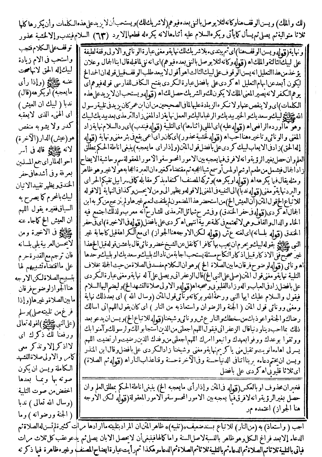 (لَك وَالْمُلْكُ) وَيُسَنُّ الْوَقْفُ هُنَا وَكَأَنَّهُ لِئَلَّا يُوصِلَ بِالنَّفْيِ بَعْدَهُ فَيُوهِمَ (لَا شَرِيكَ لَك) وَيُسْتَحَبُّ أَنْ لَا يَزِيدَ عَلَى هَذِهِ الْكَلِمَاتِ وَأَنْ يُكَرِّرَهَا كُلَّهَا ثَلَاثًا مُتَوَالِيَةً ثُمَّ يُصَلِّيَ ثُمَّ يَسْأَلَ كَمَا يَأْتِي وَيُكْرَهُ السَّلَامُ عَلَيْهِ أَثْنَاءَهَا؛ لِأَنَّهُ يُكْرَهُ لَهُ قَطْعُهَا إلَّا بِرَدِّ السَّلَامِ فَيُنْدَبُ وَإِلَّا لِخَشْيَةِ مَحْذُورٍ تَوَقَّفَ عَلَى الْكَلَامِ فَتَجِبُ وَاسْتَحَبَّ فِي الْأُمِّ زِيَادَةَ لَبَّيْكَ إلَهَ الْحَقِّ؛ لِأَنَّهَا صَحَّتْ عَنْهُ - صَلَّى اللَّهُ عَلَيْهِ وَسَلَّمَ - (وَإِذَا رَأَى مَا يُعْجِبُهُ) أَوْ يَكْرَهُهُ (قَالَ) نَدْبًا (لَبَّيْكَ إنَّ الْعَيْشَ) أَيْ الْهَنِيءَ الَّذِي لَا يَعْقُبُهُ كَدَرٌ وَلَا يَشُوبُهُ مُنَغِّصٌ هُوَ (عَيْشُ) الدَّارِ (الْآخِرَةِ) ؛ لِأَنَّهُ - صَلَّى اللَّهُ عَلَيْهِ وَسَلَّمَ - قَالَهُ فِي أَسَرِّ أَحْوَالِهِ «لَمَّا رَأَى جَمْعَ الْمُسْلِمِينَ بِعَرَفَةَ وَفِي أَشَدِّهَا فِي حَفْرِ الْخَنْدَقِ» وَيَظْهَرُ تَقْيِيدُ الْإِتْيَانِ بِلَبَّيْكَ بِالْمُحْرِمِ كَمَا يُصَرِّحُ بِهِ السِّيَاقُ فَغَيْرُهُ يَقُولُ اللَّهُمَّ إنَّ الْعَيْشَ إلَخْ كَمَا جَاءَ عَنْهُ - صَلَّى اللَّهُ عَلَيْهِ وَسَلَّمَ - فِي الْأَخِيرَةِ وَمَنْ لَا يُحْسِنُ الْعَرَبِيَّةَ يُلَبِّي بِلِسَانِهِ، فَإِنْ تَرْجَمَ بِهِ مَعَ الْقُدْرَةِ حَرُمَ عَلَى مَا اقْتَضَاهُ تَشْبِيهُهُمْ لَهَا بِتَسْبِيحِ الصَّلَاةِ لَكِنَّ الْأَوْجَهَ هُنَا الْجَوَازُ لِوُضُوحِ فُرْقَانِ مَا بَيْنَ الصَّلَاةِ وَغَيْرِهَا (وَإِذَا فَرَغَ مِنْ تَلْبِيَتِهِ صَلَّى) وَسَلَّمَ (عَلَى النَّبِيِّ - صَلَّى اللَّهُ عَلَيْهِ وَسَلَّمَ -) لِقَوْلِهِ تَعَالَى {وَرَفَعْنَا لَكَ ذِكْرَكَ} [الشرح: 4] أَيْ لَا أُذْكَرُ إلَّا وَتُذْكَرُ مَعِي كَمَا مَرَّ وَالْأَوْلَى صَلَاةُ التَّشَهُّدِ الْكَامِلَةِ وَيُسَنُّ أَنْ يَكُونَ صَوْتُهُ بِهَا وَبِمَا بَعْدَهَا أَخْفَضَ مِنْ صَوْتِ التَّلْبِيَةِ (وَسَأَلَ اللَّهَ تَعَالَى) نَدْبًا (الْجَنَّةَ وَرِضْوَانَهُ) وَمَا أَحَبَّ (وَاسْتَعَاذَ) بِهِ (مِنْ النَّارِ) لِلِاتِّبَاعِ بِسَنَدٍ ضَعِيفٍ (تَنْبِيهٌ) ظَاهِرُ الْمَتْنِ أَنَّ الْمُرَادَ بِتَلْبِيَتِهِ مَا أَرَادَهَا فَلَوْ أَرَادَهَا مَرَّاتٍ كَثِيرَةً لَمْ تُسَنَّ لَهُ الصَّلَاةُ ثُمَّ الدُّعَاءُ إلَّا بَعْدَ فَرَاغِ الْكُلِّ، وَهُوَ ظَاهِرٌ بِالنِّسْبَةِ لِأَصْلِ السُّنَّةِ وَأَمَّا كُلُّهَا فَيَنْبَغِي أَنْ لَا يَحْصُلَ إلَّا بِأَنْ يُصَلِّيَ ثُمَّ يَدْعُوَ عَقِبَ كُلٍّ ثَلَاثَ مَرَّاتٍ فَيَأْتِيَ بِالتَّلْبِيَةِ ثَلَاثًا ثُمَّ الصَّلَاةِ ثُمَّ الدُّعَاءِ ثُمَّ بِالتَّلْبِيَةِ ثَلَاثًا ثُمَّ الصَّلَاةِ ثُمَّ الدُّعَاءِ وَهَكَذَا ثُمَّ رَأَيْت عِبَارَةَ إيضَاحِ الْمُصَنِّفِ وَغَيْرُهُ ظَاهِرُهُ فِيمَا ذَكَرْته