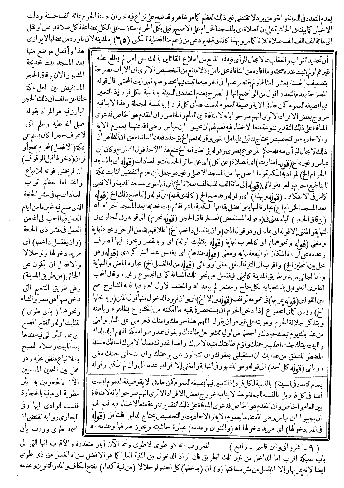 بِعَدَمِ التَّعَدُّدِ فِي السَّيِّئَةِ وَآيَةُ {وَمَنْ يُرِدْ} [الحج: 25] لَا تَقْتَضِي غَيْرَ ذَلِكَ الْعِظَمِ كَمَا هُوَ ظَاهِرٌ وَقَدْ صَحَّ عَلَى نِزَاعٍ فِيهِ خَبَرُ «أَنَّ حَسَنَةَ الْحَرَمِ بِمِائَةِ أَلْفِ حَسَنَةٍ» وَدَلَّتْ الْأَخْبَارُ كَمَا بَيَّنَتْهُ فِي الْحَاشِيَةِ عَلَى أَنَّ الصَّلَاةَ أَيْ بِالْمَسْجِدِ الْحَرَامِ عَلَى الْأَصَحِّ وَقِيلَ بِكُلِّ الْحَرَمِ امْتَازَتْ عَلَى الْكُلِّ بِمُضَاعَفَةِ كُلِّ صَلَاةٍ فَرْضٍ أَوْ نَفْلٍ إلَى مِائَةِ أَلْفِ أَلْفِ أَلْفِ صَلَاةٍ ثَلَاثًا كَمَا مَرَّ وَبِهَذَا كَاَلَّذِي قَبْلَهُ يَرُدُّ عَلَى مَنْ زَعَمَ مِنَّا أَفْضَلِيَّةَ السُّكْنَى بِالْمَدِينَةِ؛ لِأَنَّ مَا وَرَدَ مِنْ فَضْلِهَا لَا يُوَازِي هَذَا وَأَفْضَلُ مَوْضِعٍ مِنْهَا بَعْدَ الْمَسْجِدِ بَيْتُ خَدِيجَةَ الْمَشْهُورُ الْآنَ بِزُقَاقِ الْحَجَرِ الْمُسْتَفِيضُ بَيْنَ أَهْلِ مَكَّةَ خَلَفًا عَنْ سَلَفٍ أَنَّ ذَلِكَ الْحَجَرَ الْبَارِز فِيهِ هُوَ الْمُرَادُ بِقَوْلِهِ - صَلَّى اللَّهُ عَلَيْهِ وَسَلَّمَ - «إنِّي لَأَعْرِفُ حَجَرًا كَانَ يُسَلِّمُ عَلَيَّ بِمَكَّةَ» (الْأَفْضَلُ) لِمُحْرِمٍ بِحَجٍّ أَوْ قِرَانٍ (دُخُولُهَا قَبْلَ الْوُقُوفِ) إنْ لَمْ يَخْشَ فَوْتَهُ لِلِاتِّبَاعِ وَاغْتِنَامًا لِعِظَمِ ثَوَابِ الْعِبَادَاتِ بِهَا فِي عَشْرِ الْحِجَّةِ الَّذِي صَحَّ فِيهِ خَبَرُ «مَا مِنْ أَيَّامٍ الْعَمَلُ فِيهَا أَحَبُّ إلَى اللَّهِ تَعَالَى مِنْ الْعَمَلِ فِي عَشْرِ ذِي الْحِجَّةِ» (وَأَنْ يَغْتَسِلَ دَاخِلَهَا) أَيْ مَرِيدُ دُخُولِهَا وَلَوْ حَلَالًا وَالْأَفْضَلُ أَنْ يَكُونَ غُسْلُ الْجَائِي (مِنْ طَرِيقِ الْمَدِينَةِ) ، وَهِيَ طَرِيقُ التَّنْعِيمِ الَّتِي يَدْخُلُ مِنْهَا أَهْلِ مِصْرَ وَالشَّامِ وَنَحْوِهِمَا (بِذِي طَوًى) بِتَثْلِيثِ أَوَّلِهِ وَالْفَتْحُ أَفْصَحُ أَيْ بِمَاءِ الْبِئْرِ الَّتِي فِيهِ عِنْدَهَا بَعْدَ الْمَبِيتِ وَصَلَاةِ الصُّبْحِ بِهِ لِلِاتِّبَاعِ مُتَّفَقٌ عَلَيْهِ، وَهُوَ مَحَلٌّ بَيْنَ الْمَحَلَّيْنِ الْمُسَمَّيَيْنِ الْآنَ بِالْحَجُونَيْنِ بِهِ بِئْرٌ مَطْوِيَّةٌ أَيْ مَبْنِيَّةٌ بِالْحِجَارَةِ فَنُسِبَ الْوَادِي إلَيْهَا وَفِي الْبُخَارِيِّ رِوَايَةٌ تَقْتَضِي أَنَّ اسْمَهُ طُوًى وَرُدَّتْ بِأَنَّ الْمَعْرُوفَ أَنَّهُ ذُو طُوًى لَا طُوًى وَثَمَّ الْآنَ آبَارٌ مُتَعَدِّدَةٌ وَالْأَقْرَبُ أَنَّهَا الَّتِي إلَى بَابِ سَبِيكَةٍ أَقْرَبَ أَمَّا الدَّاخِلُ مِنْ غَيْرِ تِلْكَ الطُّرُقِ، فَإِنْ أَرَادَ الدُّخُولَ مِنْ الثَّنِيَّةِ الْعُلْيَا كَمَا هُوَ الْأَفْضَلُ سُنَّ لَهُ الْغُسْلُ مِنْ ذِي طُوًى أَيْضًا؛ لِأَنَّهُ يَمُرُّ بِهَا وَإِلَّا اغْتَسَلَ مِنْ مِثْلِ مَسَافَتِهَا (و) أَنْ (يَدْخُلَهَا) كُلُّ أَحَدٍ وَلَوْ حَلَالًا (مِنْ ثَنِيَّةِ كَدَاءٍ) بِفَتْحِ الْكَافِ وَالْمَدِّ وَالتَّنْوِينِ وَعَدَمِهِ