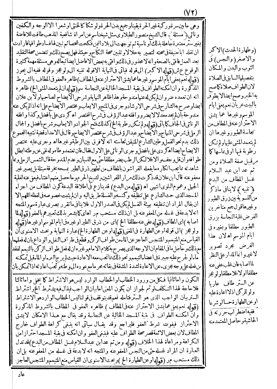 (قَوْلُهُ: نَعَمْ يُعْفَى عَمَّا يَشُقُّ الِاحْتِرَازُ عَنْهُ فِي الْمَطَافِ) ظَاهِرُهُ الْعَفْوُ فِي الْمَطَافِ بِالشُّرُوطِ الْمَذْكُورَةِ، وَإِنْ أَمْكَنَهُ الطَّوَافُ فِي بَقِيَّةِ الْمَسْجِدِ الْخَالِيَةِ عَنْ النَّجَاسَةِ، وَقَدْ يُقَالُ مَعَ هَذَا الْإِمْكَانِ لَا يَشُقُّ الِاحْتِرَازُ فَيَفُوتُ شَرْطُ الْعَفْوِ فَلْيُرَاجَعْ، وَقَدْ يُقَالُ سَيَأْتِي أَنَّهُ يَنْبَغِي كَرَاهَةُ الطَّوَافِ خَارِجِ الْمَطَافِ؛ لِأَنَّ بَعْضَ الْأَئِمَّةِ قَصَرَ صِحَّةَ الطَّوَافِ عَلَيْهِ فَيَنْبَغِي الْعَفْوُ، وَإِنْ أَمْكَنَهُ فِي بَقِيَّةِ الْمَسْجِدِ احْتِرَازًا مِنْ الْكَرَاهَةِ وَمُرَاعَاةً لِهَذَا الْخِلَافِ (قَوْلُهُ: وَمِنْ ثَمَّ عَدَّ ابْنُ عَبْدِ السَّلَامِ غُسْلَ الْمَطَافِ مِنْ الْبِدَعِ) قَدْ تَدُلُّ الْعِبَارَةُ أَنَّ الْمُرَادَ غُسْلُهُ حَتَّى مِنْ النَّجَسِ الْمَعْفُوِّ عَنْهُ وَالْمُتَّجَهُ أَنَّهُ لَا بِدْعَةَ فِي غُسْلِهِ مِنْ الْمَعْفُوِّ عَنْهُ بَلْ إنَّ ذَلِكَ مُسْتَحَبٌّ م ر (قَوْلُهُ: أَوْ عَنْ الطَّهَارَةِ إلَخْ) وَبَحَثَ الْإِسْنَوِيُّ أَنَّ الْقِيَاسَ مَنْعُ الْمُتَيَمِّمِ وَالْمُتَنَجِّسِ الْعَاجِزِ
