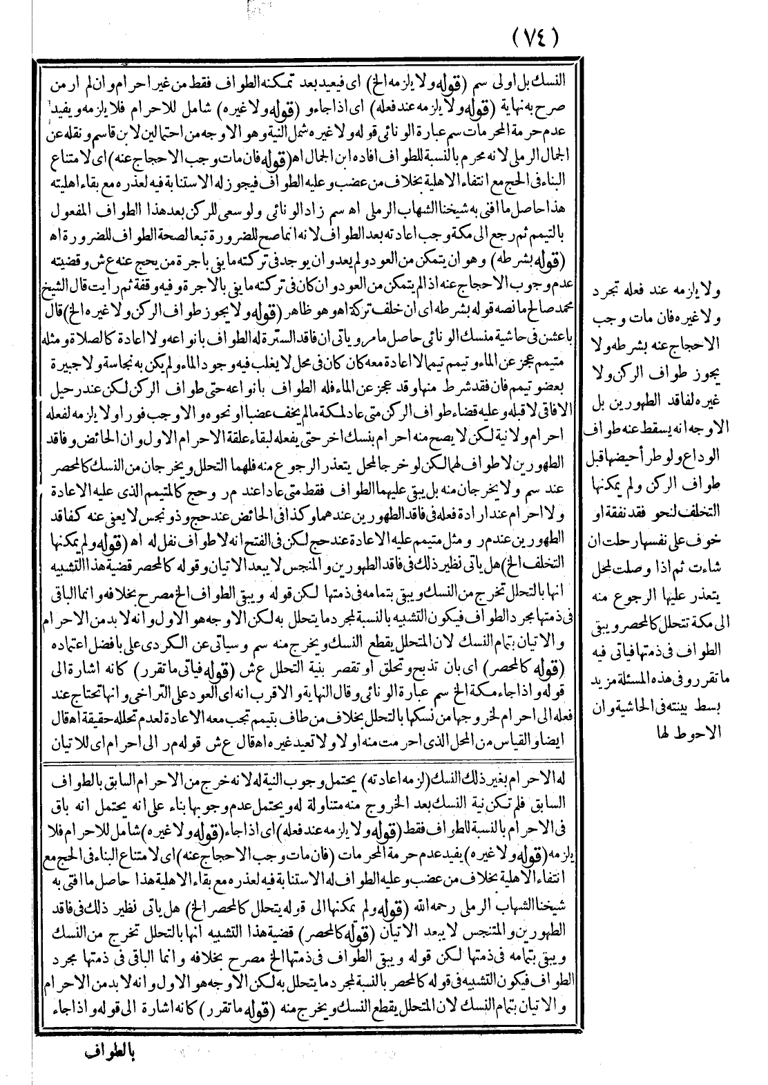 وَلَا يَلْزَمُهُ عِنْدَ فِعْلِهِ تَجَرُّدٌ وَلَا غَيْرُهُ، فَإِنْ مَاتَ وَجَبَ الْإِحْجَاجُ عَنْهُ بِشَرْطِهِ وَلَا يَجُوزُ طَوَافُ الرُّكْنِ وَلَا غَيْرُهُ لِفَاقِدِ الطَّهُورَيْنِ بَلْ الْأَوْجَهُ أَنَّهُ يَسْقُطُ عَنْهُ طَوَافُ الْوَدَاعِ وَلَوْ طَرَأَ حَيْضُهَا قَبْلَ طَوَافِ الرُّكْنِ وَلَمْ يُمْكِنْهَا التَّخَلُّفُ لِنَحْوِ فَقْدِ نَفَقَةٍ أَوْ خَوْفٍ عَلَى نَفْسِهَا رَحَلَتْ إنْ شَاءَتْ ثُمَّ إذَا وَصَلَتْ لِمَحَلٍّ يَتَعَذَّرُ عَلَيْهَا الرُّجُوعُ مِنْهُ إلَى مَكَّةَ تَتَحَلَّلُ كَالْمُحْصَرِ وَيَبْقَى الطَّوَافُ فِي ذِمَّتِهَا فَيَأْتِي فِيهِ مَا تَقَرَّرَ وَفِي هَذِهِ الْمَسْأَلَةِ مَزِيدُ بَسْطٍ بَيَّنْته فِي الْحَاشِيَةِ، وَإِنَّ الْأَحْوَطَ لَهَا