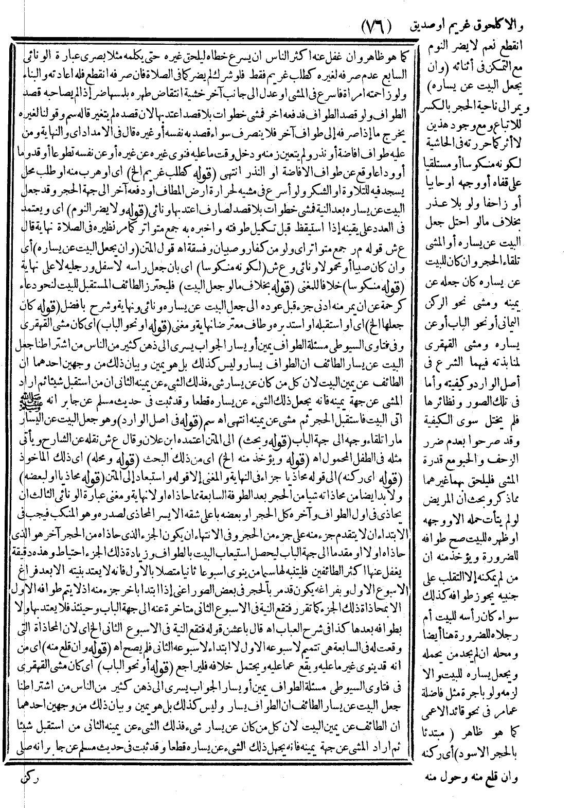 (قَوْلُهُ: أَيْ رُكْنِهِ) إلَى قَوْلِهِ مُحَاذِيًا جَاءَ فِي النِّهَايَةِ وَالْمُغْنِي إلَّا قَوْلَهُ وَاسْتِبْعَادُ إلَى الْمَتْنِ (قَوْلُهُ: مُحَاذِيًا لَهُ أَوْ لِبَعْضِهِ) وَلَا بُدَّ أَيْضًا مِنْ مُحَاذَاتِهِ شَيْئًا مِنْ الْحَجَرِ بَعْدَ الطَّوْفَةِ السَّابِعَةِ مِمَّا حَاذَاهُ أَوَّلًا نِهَايَةٌ وَمُغْنِي عِبَارَةُ الْوَنَائِيِّ الثَّالِثُ أَنْ يُحَاذِيَ فِي أَوَّلِ الطَّوَافِ وَآخِرِهِ كُلَّ الْحَجَرِ أَوْ بَعْضَهُ بِأَعْلَى شِقِّهِ الْأَيْسَرِ الْمُحَاذِي لِصَدْرِهِ، وَهُوَ الْمَنْكِبُ فَيَجِبُ فِي الِابْتِدَاءِ أَنْ لَا يَتَقَدَّمَ جَزْءٌ مِنْهُ عَلَى جَزْءٍ مِنْ الْحَجَرِ وَفِي الِانْتِهَاءِ أَنْ يَكُونَ الْجُزْءُ الَّذِي حَاذَاهُ مِنْ الْحَجَرِ آخِرًا هُوَ الَّذِي حَاذَاهُ أَوَّلًا أَوْ مُقَدَّمًا إلَى جِهَةِ الْبَابِ لِيَحْصُلَ اسْتِيعَابُ الْبَيْتِ بِالطَّوَافِ وَزِيَادَةُ ذَلِكَ الْجُزْءِ احْتِيَاطٌ وَهَذِهِ دَقِيقَةٌ يَغْفُلُ عَنْهَا أَكْثَرُ الطَّائِفِينَ فَلْيُتَنَبَّهْ لَهَا سِيَّمَا مَنْ يَنْوِي أُسْبُوعًا ثَانِيًا مُتَّصِلًا بِالْأَوَّلِ، فَإِنَّهُ لَا يُعْتَدُّ بِنِيَّتِهِ إلَّا بَعْدَ فَرَاغِ الْأُسْبُوعِ الْأَوَّلِ بِفَرَاغِهِ يَكُونُ قَدْ مَرَّ بِالْحَجَرِ فِي بَعْضِ الصُّوَرِ أَعْنِي إذَا ابْتَدَأَ بِآخِرِ جَزْءٍ مِنْهُ إذْ لَا يَتِمُّ طَوَافُهُ الْأَوَّلُ إلَّا بِمُحَاذَاةِ ذَلِكَ الْجُزْءِ كَمَا تَقَرَّرَ فَتَقَعُ النِّيَّةُ فِي الْأُسْبُوعِ الثَّانِي مُتَأَخِّرَةً عَنْهُ إلَى جِهَةِ الْبَابِ وَحِينَئِذٍ فَلَا يُعْتَدُّ بِهَا وَلَا بِطَوَافِهِ بَعْدَهَا كَذَا فِي شَرْحِ الْعُبَابِ اهـ قَالَ بَاعَشَنٍ قَوْلُهُ فَتَقَعُ النِّيَّةُ فِي الْأُسْبُوعِ الثَّانِي إلَخْ أَيْ؛ لِأَنَّ الْمُحَاذَاةَ الَّتِي وَقَعَتْ لَهُ فِي السَّابِعَةِ هِيَ تَتْمِيمٌ لِأُسْبُوعِهِ الْأَوَّلِ لَا ابْتِدَاءً لِأُسْبُوعِهِ الثَّانِي فَلَمْ يَصِحَّ اهـ.