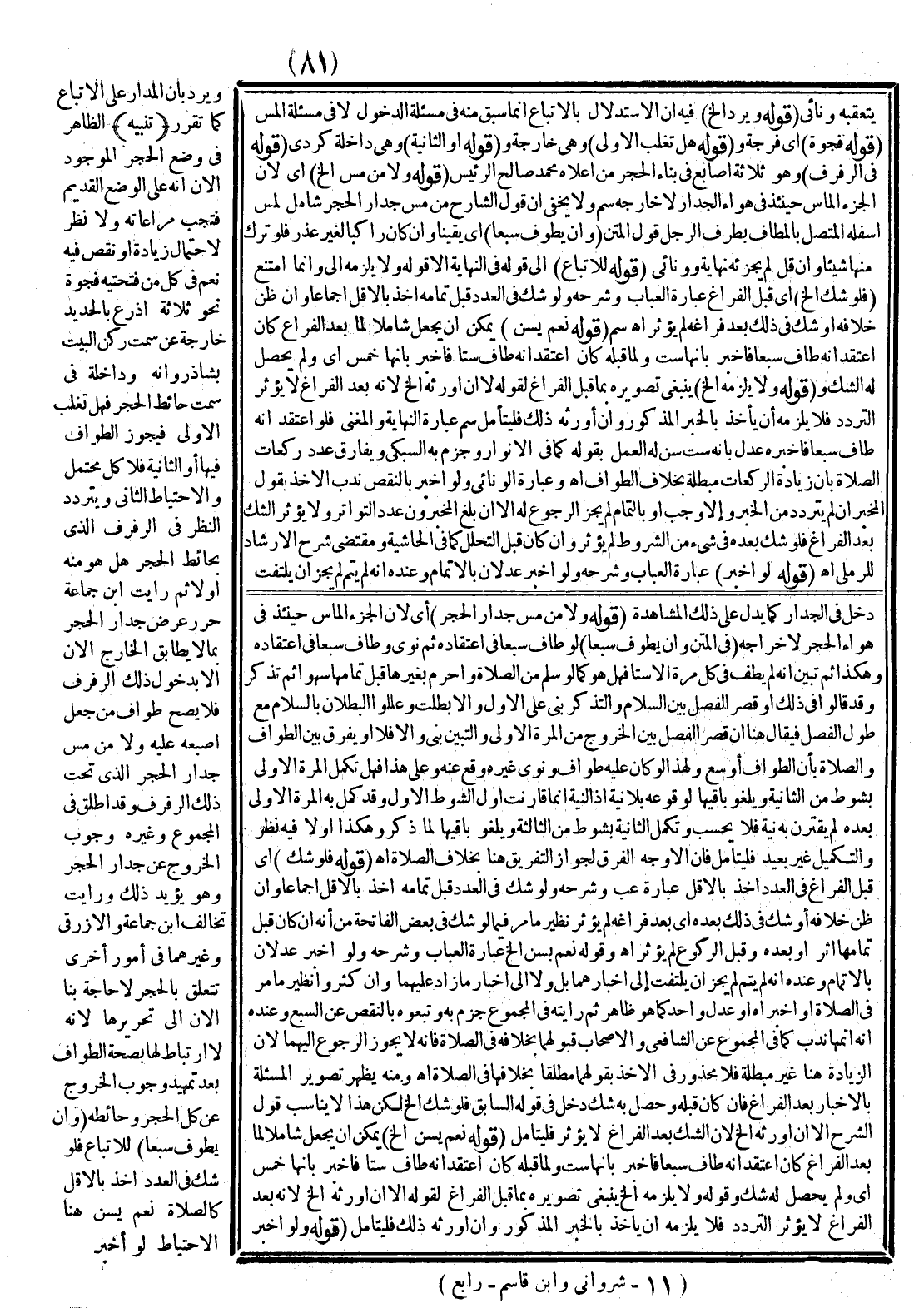 (تَنْبِيهٌ) الظَّاهِرُ فِي وَضْعِ الْحِجْرِ الْمَوْجُودِ الْآنَ أَنَّهُ عَلَى الْوَضْعِ الْقَدِيمِ فَتَجِبُ مُرَاعَاتُهُ وَلَا نَظَرَ لِاحْتِمَالِ زِيَادَةٍ أَوْ نَقْصٍ فِيهِ نَعَمْ فِي كُلٍّ مِنْ فَتْحَتَيْهِ فَجْوَةٌ نَحْوُ ثَلَاثَةِ أَذْرُعٍ بِالْحَدِيدِ خَارِجَةٍ عَنْ سَمْتِ رُكْنِ الْبَيْتِ بِشَاذَرْوَانِهِ وَدَاخِلِهِ فِي سَمْتِ حَائِطِ الْحِجْرِ فَهَلْ تَغْلِبُ الْأُولَى فَيَجُوزُ الطَّوَافُ فِيهَا أَوْ الثَّانِيَةُ فَلَا كُلٌّ مُحْتَمَلٌ، وَالِاحْتِيَاطُ الثَّانِي وَيَتَرَدَّدُ النَّظَرُ فِي الرَّفْرَفِ الَّذِي بِحَائِطِ الْحِجْرِ هَلْ هُوَ مِنْهُ أَوْ لَا ثُمَّ رَأَيْت ابْنَ جَمَاعَةَ حَرَّرَ عَرْضَ جِدَارِ الْحِجْرِ بِمَا لَا يُطَابِقُ الْخَارِجَ الْآنَ إلَّا بِدُخُولِ ذَلِكَ الرَّفْرَفِ فَلَا يَصِحُّ طَوَافُ مَنْ جَعَلَ إصْبَعَهُ عَلَيْهِ وَلَا مَنْ مَسَّ جِدَارَ الْحِجْرِ الَّذِي تَحْتَ ذَلِكَ الرَّفْرَفِ وَقَدْ أَطْلَقَ فِي الْمَجْمُوعِ وَغَيْرِهِ وُجُوبَ الْخُرُوجِ عَنْ جِدَارِ الْحِجْرِ، وَهُوَ يُؤَيِّدُ ذَلِكَ وَرَأَيْت تَخَالُفَ ابْنِ جَمَاعَةَ وَالْأَزْرَقِيِّ وَغَيْرِهِمَا فِي أُمُورٍ أُخْرَى تَتَعَلَّقُ بِالْحِجْرِ لَا حَاجَةَ بِنَا الْآنَ إلَى تَحْرِيرِهَا؛ لِأَنَّهُ لَا ارْتِبَاطَ لَهَا بِصِحَّةِ الطَّوَافِ بَعْدَ تَمْهِيدِ وُجُوبِ الْخُرُوجِ عَنْ كُلِّ الْحِجْرِ وَحَائِطِهِ.