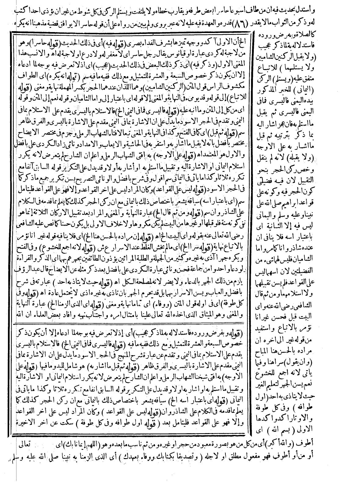 وَاسْتَدَلَّ بِحَدِيثِ فِيهِ أَنَّ «مَنْ طَافَ أُسْبُوعًا حَاسِرًا بَعْضَ طَوْفِهِ وَيُقَارِبُ خُطَاهُ وَلَا يَلْتَفِتُ وَيَسْتَلِمُ الرُّكْنَ فِي كُلِّ شَوْطٍ مِنْ غَيْرِ أَنْ يُؤْذِيَ أَحَدًا كُتِبَ لَهُ وَذَكَرَ مِنْ الثَّوَابِ مَا لَا يُقْدَرُ قَدْرُهُ» وَالْعُهْدَةُ فِيهِ عَلَيْهِ؛ لِأَنَّهُ عَبَّرَ بِرُوِيَ وَلَمْ يُبَيِّنْ مَنْ رَوَاهُ عَلَى أَنَّ قَوْلَهُ حَاسِرًا لَا يُوَافِقُ قَضِيَّةَ مَذْهَبِنَا أَنَّهُ يُكْرَهُ كَالصَّلَاةِ وَبِفَرْضِ وُرُودِهِ فَاسْتِدْلَالُهُ بِهِ لِمَا ذُكِرَ عَجِيبٌ.