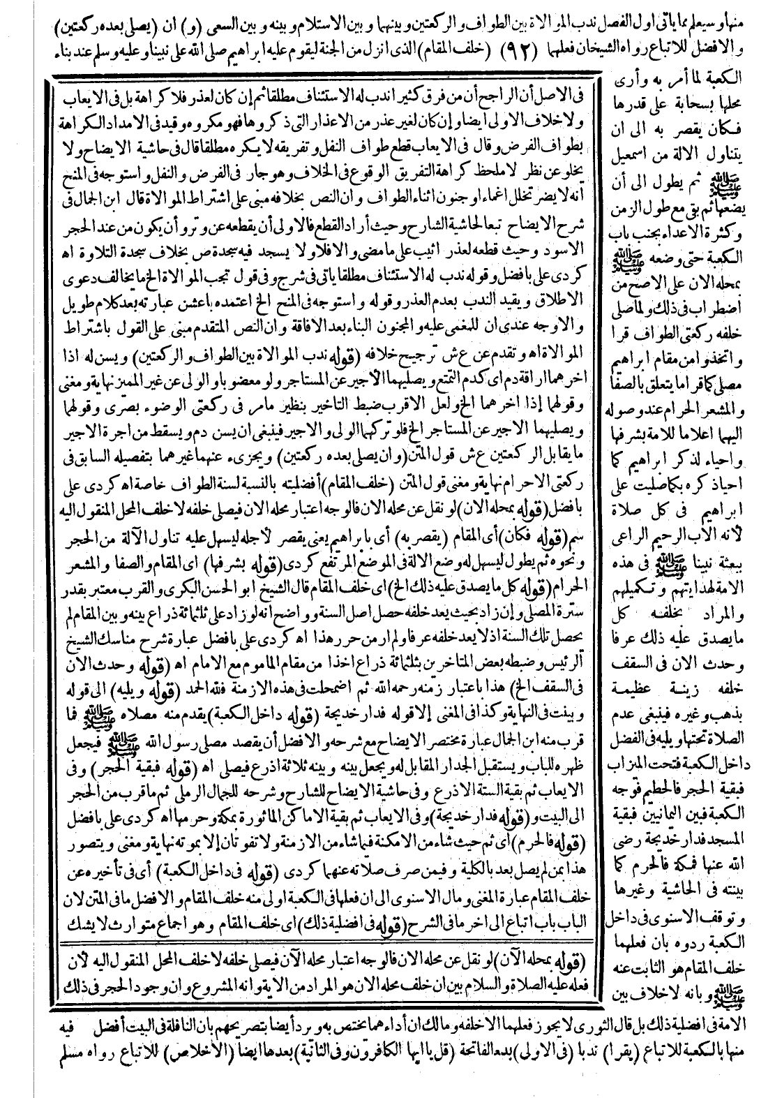 (قَوْلُهُ: بِمَحَلِّهِ الْآنَ) لَوْ نُقِلَ عَنْ مَحَلِّهِ الْآنَ فَالْوَجْهُ اعْتِبَارُ مَحَلِّهِ الْآنَ فَيُصَلِّي خَلْفَهُ لَا خَلْفَ الْمَحَلِّ الْمَنْقُولِ إلَيْهِ سم (قَوْلُهُ: فَكَانَ) أَيْ الْمَقَامُ (يُقَصِّرُ بِهِ) أَيْ بِإِبْرَاهِيمَ يَعْنِي يُقَصِّرُ لِأَجْلِهِ لِيَسْهُلَ عَلَيْهِ تَنَاوُلُ الْآلَةِ مِنْ الْحَجَرِ وَنَحْوِهِ ثُمَّ يُطَوِّلُ لِيَسْهُلَ لَهُ وَضْعُ الْآلَةِ فِي الْمَوْضِعِ الْمُرْتَفِعِ كُرْدِيٌّ (قَوْلُهُ: بِشَرَفِهَا) أَيْ الْمَقَامِ وَالصَّفَا وَالْمَشْعَرِ الْحَرَامِ (قَوْلُهُ: كُلُّ مَا يَصْدُقُ عَلَيْهِ ذَلِكَ إلَخْ) أَيْ خَلْفَ الْمَقَامِ قَالَ الشَّيْخُ أَبُو الْحَسَنِ الْبَكْرِيُّ وَالْقُرْبُ مُعْتَبَرٌ بِقَدْرِ سُتْرَةِ الْمُصَلِّي، وَإِنْ زَادَ بِحَيْثُ يُعَدُّ خَلْفَهُ حَصَلَ أَصْلُ السُّنَّةِ وَوَاضِحٌ أَنَّهُ لَوْ زَادَ عَلَى ثَلَثِمِائَةِ ذِرَاعٍ بَيْنَهُ وَبَيْنَ الْمَقَامِ لَمْ تَحْصُلْ تِلْكَ السُّنَّةُ إذْ لَا يُعَدُّ خَلْفَهُ عُرْفًا وَلَمْ أَرَ مَنْ حَرَّرَ هَذَا انْتَهَى اهـ كُرْدِيٌّ عَلَى بَافَضْلٍ عِبَارَةُ شَرْحِ مَنَاسِكِ الشَّيْخِ الرَّئِيسِ وَضَبَطَهُ بَعْضُ الْمُتَأَخِّرِينَ بِثَلَثِمِائَةِ ذِرَاعٍ أَخْذًا مِنْ مَقَامِ الْمَأْمُورِ مَعَ الْإِمَامِ اهـ.