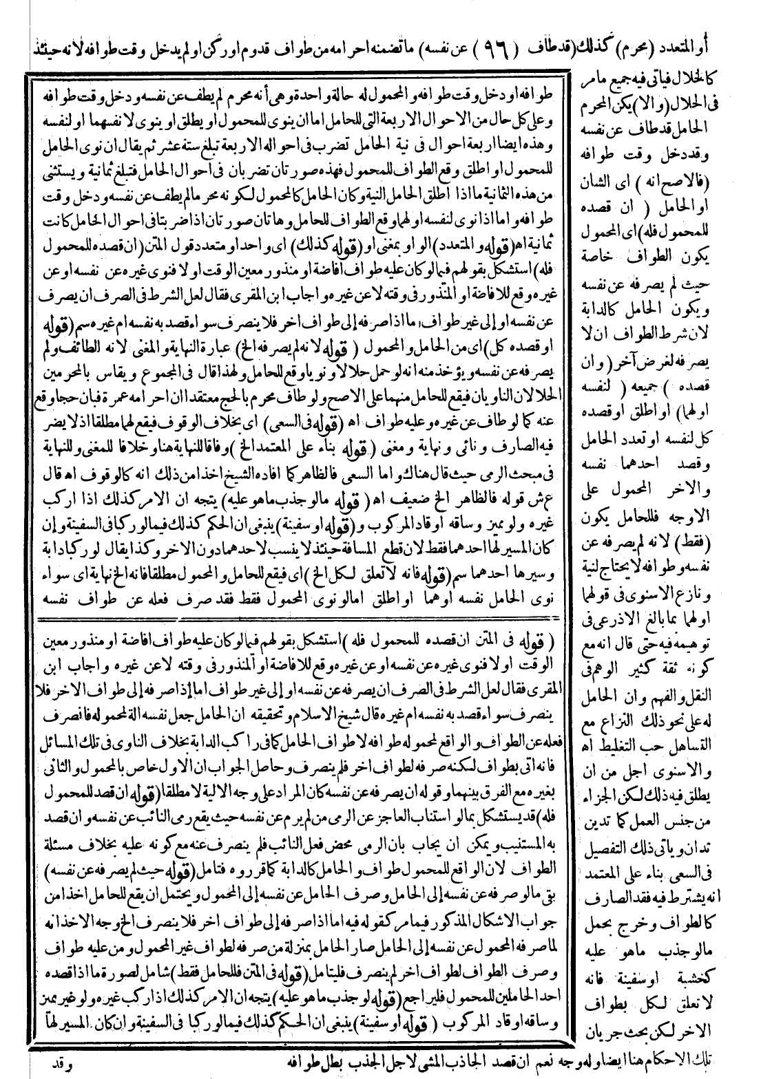 ـــــــــــــــــــــــــــــQطَوَافِهِ أَوْ دَخَلَ وَقْتُ طَوَافِهِ وَالْمَحْمُولُ لَهُ حَالَةٌ وَاحِدَةٌ، وَهِيَ أَنَّهُ مُحْرِمٌ لَمْ يَطُفْ عَنْ نَفْسِهِ وَدَخَلَ وَقْتُ طَوَافِهِ وَعَلَى كُلِّ حَالٍ مِنْ الْأَحْوَالِ الْأَرْبَعَةِ الَّتِي لِلْحَامِلِ إمَّا أَنْ يَنْوِيَ لِلْمَحْمُولِ أَوْ يُطْلِقَ أَوْ يَنْوِي لِأَنْفُسِهِمَا أَوْ لِنَفْسِهِ وَهَذِهِ أَيْضًا أَرْبَعَةُ أَحْوَالٍ فِي نِيَّةِ الْحَامِلِ تُضْرَبُ فِي أَحْوَالِهِ الْأَرْبَعَةِ تَبْلُغُ سِتَّةَ عَشَرَ ثُمَّ يُقَالُ إنْ نَوَى الْحَامِلُ لِلْمَحْمُولِ أَوْ أَطْلَقَ وَقَعَ الطَّوَافُ لِلْمَحْمُولِ فَهَذِهِ صُورَتَانِ تُضْرَبَانِ فِي أَحْوَالِ الْحَامِلِ فَتَبْلُغُ ثَمَانِيَةً وَيُسْتَثْنَى مِنْ هَذِهِ الثَّمَانِيَةِ مَا إذَا أَطْلَقَ الْحَامِلُ النِّيَّةَ، وَكَانَ الْحَامِلُ كَالْمَحْمُولِ لِكَوْنِهِ مُحْرِمًا لَمْ يَطُفْ عَنْ نَفْسِهِ وَدَخَلَ وَقْتُ طَوَافِهِ وَأَمَّا إذَا نَوَى لِنَفْسِهِ أَوْ لَهُمَا وَقَعَ الطَّوَافُ لِلْحَامِلِ وَهَاتَانِ صُورَتَانِ إذَا ضُرِبَتَا فِي أَحْوَالِ الْحَامِلِ كَانَتْ ثَمَانِيَةً. اهـ.