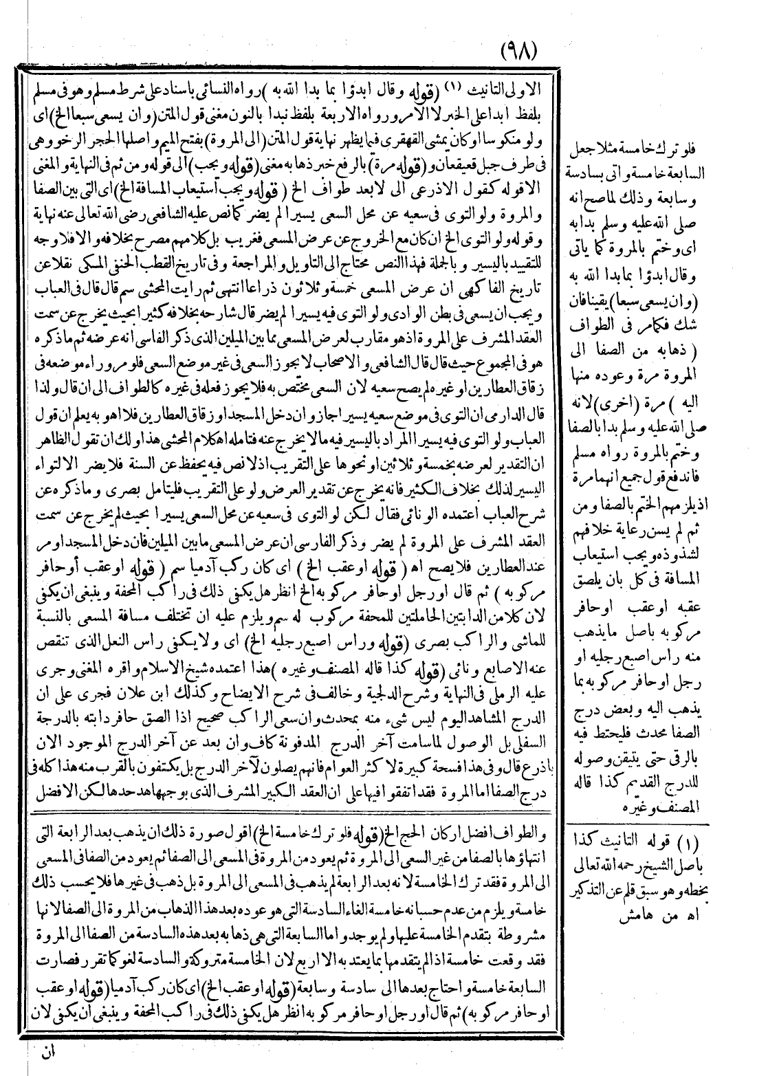 وَبِهِ يُعْلَمُ أَنَّ قَوْلَ الْعُبَابِ وَلَوْ الْتَوَى فِيهِ يَسِيرًا الْمُرَادُ بِالْيَسِيرِ فِيهِ مَا لَا يَخْرُجُ عَنْهُ فَتَأَمَّلْهُ. انْتَهَى كَلَامُ الْمُحَشِّي. هَذَا وَلَك أَنْ تَقُولَ الظَّاهِرُ أَنَّ التَّقْدِيرَ لِعَرْضِهِ بِخَمْسَةٍ وَثَلَاثِينَ أَوْ نَحْوِهَا عَلَى التَّقْرِيبِ إذْ لَا نَصَّ فِيهِ يُحْفَظُ عَنْ السُّنَّةِ فَلَا يَضُرُّ الِالْتِوَاءُ الْيَسِيرُ لِذَلِكَ بِخِلَافِ الْكَثِيرِ، فَإِنَّهُ يَخْرُجُ عَنْ تَقْدِيرِ الْعَرْضِ وَلَوْ عَلَى التَّقْرِيبِ فَلْيُتَأَمَّلْ بَصْرِيٌّ وَمَا ذَكَرَهُ عَنْ شَرْحِ الْعُبَابِ اعْتَمَدَهُ الْوَنَائِيُّ فَقَالَ لَكِنْ لَوْ الْتَوَى فِي سَعْيِهِ عَنْ مَحَلِّ السَّعْيِ يَسِيرًا بِحَيْثُ لَمْ يَخْرُجْ عَنْ سَمْتِ الْعَقْدِ الْمُشْرِفِ عَلَى الْمَرْوَةِ لَمْ يَضُرَّ وَذَكَرَ الْفَارِسِيُّ أَنَّ عَرْضَ الْمَسْعَى مَا بَيْنَ الْمِيلَيْنِ، فَإِنْ دَخَلَ الْمَسْجِدَ أَوْ مَرَّ عِنْدَ الْعَطَّارِينَ فَلَا يَصِحُّ. اهـ.