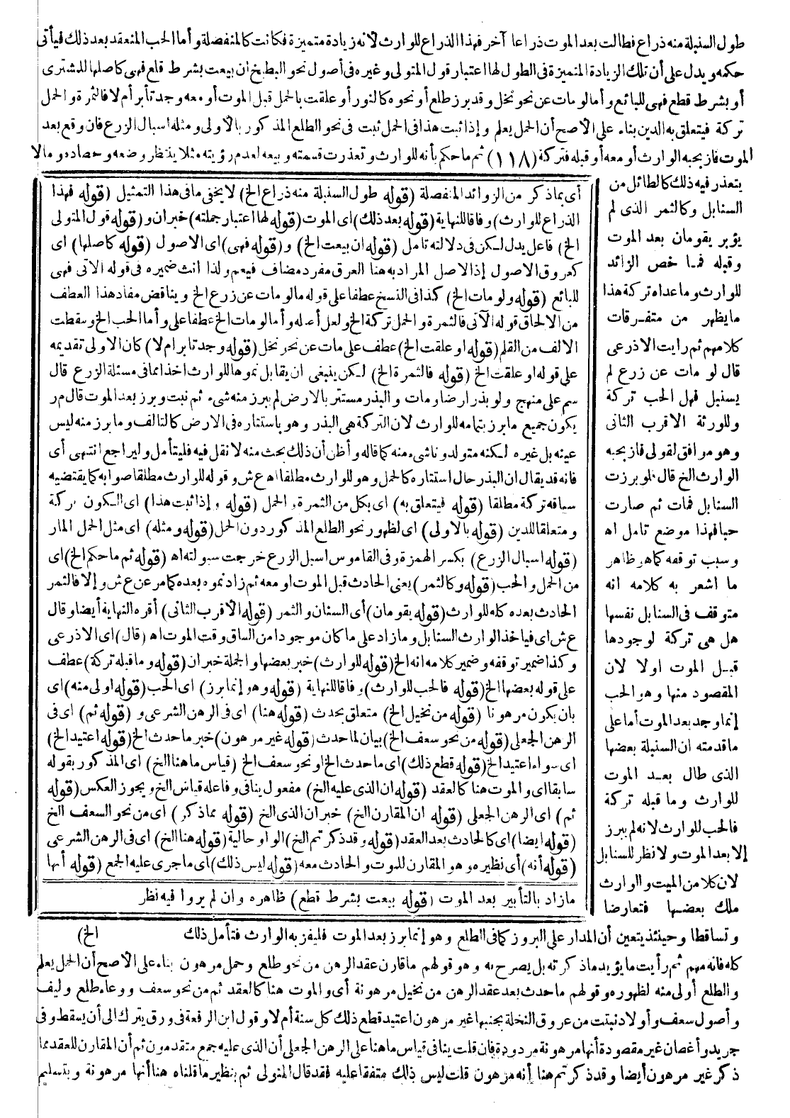 (قَالَ) أَيْ: الْأَذْرَعِيُّ وَكَذَا ضَمِيرُ تَوَقُّفِهِ وَضَمِيرُ كَلَامِهِ أَنَّهُ إلَخْ (قَوْلُهُ لِلْوَارِثِ) خَبَرُ بَعْضُهَا وَالْجُمْلَةُ خَبَرُ إنَّ (قَوْلُهُ وَمَا قَبْلَهُ تَرِكَةٌ) عَطْفٌ عَلَى قَوْلِهِ بَعْضُهَا إلَخْ (قَوْلُهُ فَالْحَبُّ لِلْوَارِثِ) وِفَاقًا لِلنِّهَايَةِ (قَوْلُهُ وَهُوَ إنَّمَا بَرَزَ) أَيْ الْحَبُّ (قَوْلُهُ أَوْلَى مِنْهُ) أَيْ: بِأَنْ يَكُونَ مَرْهُونًا (قَوْلُهُ مِنْ نَخِيلٍ إلَخْ) مُتَعَلِّقٌ بِحَدَثَ (قَوْلُهُ هُنَا) أَيْ: فِي الرَّهْنِ الشَّرْعِيِّ وَ (قَوْلُهُ ثُمَّ) أَيْ: فِي الرَّهْنِ الْجَعْلِيِّ (قَوْلُهُ مِنْ نَحْوِ سَعَفٍ إلَخْ) بَيَانٌ لِمَا حَدَثَ (قَوْلُهُ غَيْرُ مَرْهُونٍ) خَبَرُ مَا حَدَثَ إلَخْ (قَوْلُهُ اُعْتِيدَ إلَخْ) أَيْ: سَوَاءٌ اُعْتِيدَ إلَخْ (قَوْلُهُ قَطَعَ ذَلِكَ) أَيْ: مَا حَدَثَ إلَخْ أَوْ نَحْوُ سَعَفٍ إلَخْ (قِيَاسُ مَا هُنَا إلَخْ) أَيْ الْمَذْكُورُ بِقَوْلِهِ سَابِقًا أَيْ وَالْمَوْتُ هُنَا كَالْعَقْدِ (قَوْلُهُ إنَّ الَّذِي عَلَيْهِ إلَخْ) مَفْعُولُ يُنَافِي وَفَاعِلُهُ قِيَاسُ إلَخْ وَيَجُوزُ الْعَكْسُ (قَوْلُهُ ثُمَّ) أَيْ: فِي الرَّهْنِ الْجَعْلِيِّ (قَوْلُهُ إنَّ الْمُقَارِنَ إلَخْ) خَبَرُ إنَّ الَّذِي إلَخْ (قَوْلُهُ مِمَّا ذُكِرَ) أَيْ: مِنْ نَحْوِ السَّعَفِ إلَخْ (قَوْلُهُ أَيْضًا) أَيْ: كَالْحَادِثِ بَعْدَ الْعَقْدِ (قَوْلُهُ وَقَدْ ذَكَرْتُمْ إلَخْ) الْوَاوُ حَالِيَّةٌ (قَوْلُهُ هُنَا إلَخْ) أَيْ: فِي الرَّهْنِ الشَّرْعِيِّ (قَوْلُهُ إنَّهُ) أَيْ: إنَّ نَظِيرَهُ وَهُوَ الْمُقَارِنُ لِلْمَوْتِ وَالْحَادِثُ مَعَهُ (قَوْلُهُ لَيْسَ ذَلِكَ) أَيْ مَا جَرَى عَلَيْهِ الْجَمْعُ (قَوْلُهُ إنَّهَا