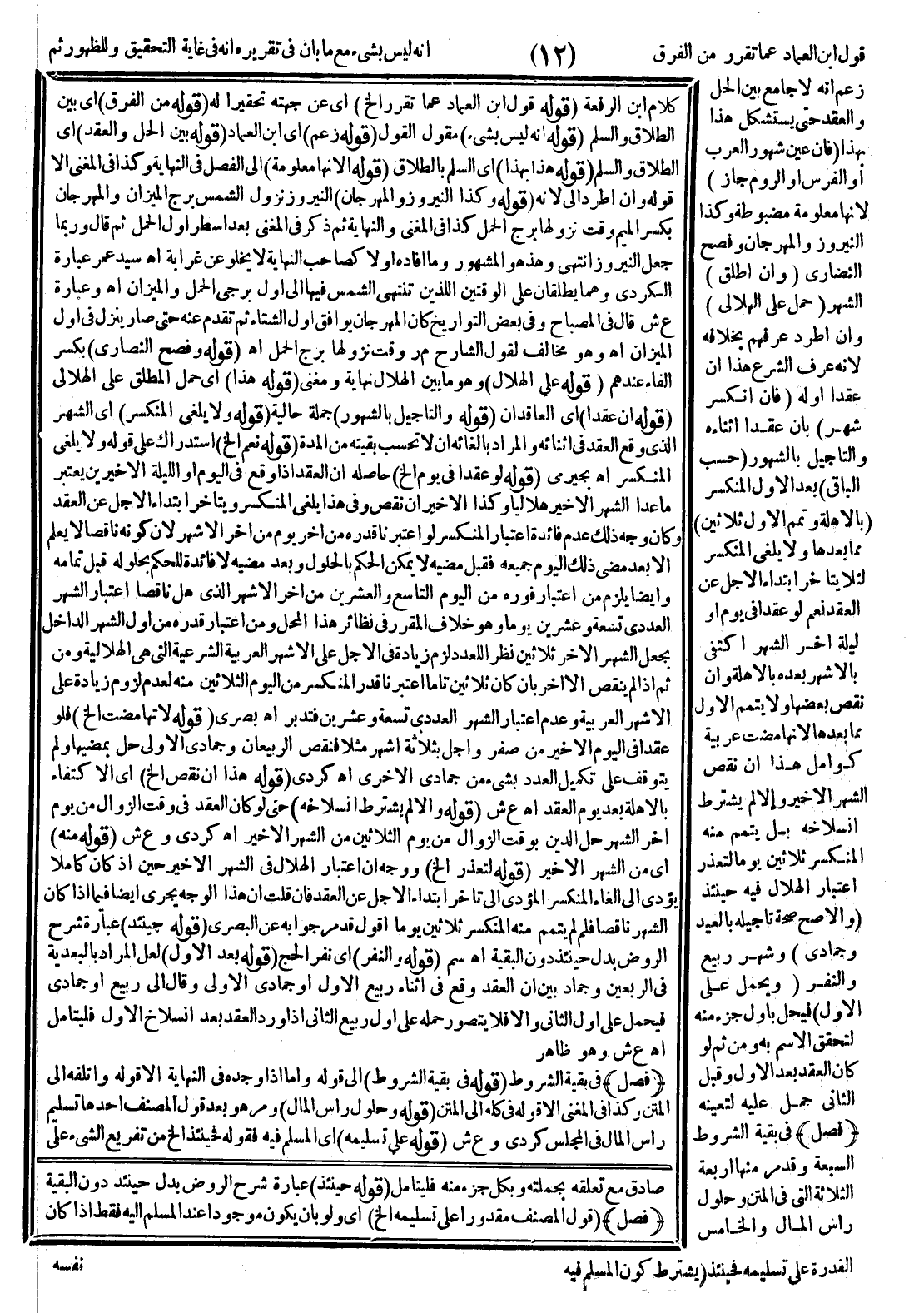 قَوْلُ ابْنِ الْعِمَادِ عَمَّا تَقَرَّرَ مِنْ الْفَرْقِ أَنَّهُ لَيْسَ بِشَيْءٍ مَعَ مَا بَانَ فِي تَقْرِيرِهِ أَنَّهُ فِي غَايَةِ التَّحْقِيقِ وَالظُّهُورِ ثُمَّ زَعَمَ أَنَّهُ لَا جَامِعَ بَيْنَ الْحِلِّ وَالْعَقْدِ حَتَّى يَسْتَشْكِلَ هَذَا بِهَذَا (فَإِنْ عَيَّنَ شُهُورَ الْعَرَبِ أَوْ الْفُرْسِ أَوْ الرُّومِ جَازَ) ؛ لِأَنَّهَا مَعْلُومَةٌ مَضْبُوطَةٌ وَكَذَا النَّيْرُوزُ وَالْمِهْرَجَانُ وَفِصْحُ النَّصَارَى (وَإِنْ أَطْلَقَ) الشَّهْرَ (حُمِلَ عَلَى الْهِلَالِيِّ) وَإِنْ اطَّرَدَ عُرْفُهُمْ بِخِلَافِهِ؛ لِأَنَّهُ عُرْفُ الشَّرْعِ. هَذَا إنْ عَقَدَا أَوَّلَهُ (فَإِنْ انْكَسَرَ شَهْرٌ) بِأَنْ عَقَدَا أَثْنَاءَهُ وَالتَّأْجِيلُ بِالشُّهُورِ (حَسْبُ الْبَاقِي) بَعْدَ الْأَوَّلِ الْمُنْكَسِرِ (بِالْأَهِلَّةِ وَتَمَّمَ الْأَوَّلَ ثَلَاثِينَ) مِمَّا بَعْدَهَا وَلَا يُلْغِي الْمُنْكَسِرَ لِئَلَّا يَتَأَخَّرَ ابْتِدَاءُ الْأَجَلِ عَنْ الْعَقْدِ نَعَمْ لَوْ عَقَدَا فِي يَوْمٍ أَوْ لَيْلَةٍ آخِرَ الشَّهْرِ اُكْتُفِيَ بِالْأَشْهُرِ بَعْدَهُ بِالْأَهِلَّةِ وَإِنْ نَقَصَ بَعْضُهَا وَلَا يُتَمِّمُ الْأَوَّلَ مِمَّا بَعْدَهَا؛ لِأَنَّهَا مَضَتْ عَرَبِيَّةً كَوَامِلَ هَذَا إنْ نَقَصَ الشَّهْرُ الْأَخِيرُ وَإِلَّا لَمْ يُشْتَرَطْ انْسِلَاخُهُ بَلْ يُتَمَّمُ مِنْهُ الْمُنْكَسِرَ ثَلَاثِينَ يَوْمًا لِتَعَذُّرِ اعْتِبَارِ الْهِلَالِ فِيهِ حِينَئِذٍ (وَالْأَصَحُّ صِحَّةُ تَأْجِيلِهِ بِالْعِيدِ وَجُمَادَى) وَشَهْرِ رَبِيعٍ وَالنَّفْرِ (وَيُحْمَلُ عَلَى الْأَوَّلِ) فَيَحِلُّ بِأَوَّلِ جُزْءٍ مِنْهُ لِتَحَقُّقِ الِاسْمِ بِهِ وَمِنْ ثَمَّ لَوْ كَانَ الْعَقْدُ بَعْدَ الْأَوَّلِ وَقَبْلَ الثَّانِي حُمِلَ عَلَيْهِ لِتَعَيُّنِهِ. .
