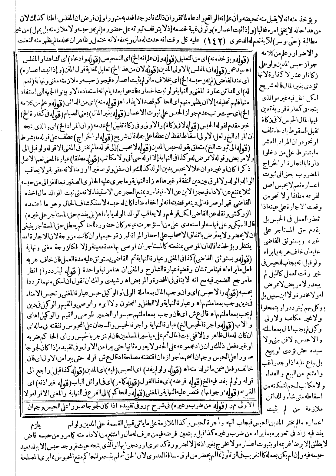 (قَوْلُهُ لَا فِي زَكَاةٍ إلَخْ) وَالْأَوْلَى فِي زَكَاةِ تُقْبَلُ إلَخْ عَدَمُهُ (قَوْلُهُ وَأَنَّ الْمُرَادَ إلَخْ) أَيْ وَاَلَّذِي يُتَّجَهُ أَنَّ الْمُرَادَ إلَخْ وَلَعَلَّ الْأَوْلَى إسْقَاطُ لَفْظِ إنْ عُطِفَا عَلَى جُمْلَةِ قَالَهُ شُرَيْحٌ (قَوْلُهُ أَوْ الْخَرَاجِ) عَطْفٌ عَلَى قَوْلِهِ مَا يُشْرَطُ إلَخْ (قَوْلُهُ إلَى ثُبُوتِ إلَخْ) مُتَعَلِّقٌ بِقَوْلِهِ حَبْسُ الْمَدِينِ (قَوْلُهُ لَا يُحْبَسُ) إلَى قَوْلِهِ مَا لَمْ يَخْتَرْ فِي الْمُغْنِي إلَّا قَوْلُهُ وَلَوْ قِيلَ إلَى وَلَا مَرِيضٍ وَقَوْلُهُ لَا مُمَرِّضَ لَهُ وَكَذَا فِي النِّهَايَةِ إلَّا قَوْلُهُ حَتَّى إلَى وَلَا مُكَاتَبَ (قَوْلُهُ مُطْلَقًا) عِبَارَةُ الْمُغْنِي نَعَمْ الْأَصْلُ ذَكَرًا كَانَ أَوْ غَيْرَهُ وَإِنْ عَلَا لَا يُحْبَسُ بِدَيْنِ الْوَلَدِ كَذَلِكَ وَإِنْ سَفَلَ وَلَوْ صَغِيرًا أَوْ زَمِنًا؛ لِأَنَّهُ عُقُوبَةٌ وَلَا يُعَاقَبُ الْوَالِدُ بِالْوَلَدِ وَلَا فَرْقَ بَيْنَ دَيْنِ النَّفَقَةِ وَغَيْرِهَا اهـ زَادَ النِّهَايَةُ وَمَا جَرَى عَلَيْهِ الْحَاوِي الصَّغِيرُ تَبَعًا لِلْغَزَالِيِّ مِنْ حَبْسِهِ لِئَلَّا يَمْتَنِعَ عَنْ الْأَدَاءِ فَيَعْجِزَ الِابْنُ عَنْ الِاسْتِيفَاءِ رُدَّ بِمَنْعِ الْعَجْزِ عَنْ الِاسْتِيفَاءِ؛ لِأَنَّهُ مَتَى ثَبَتَ لِلْوَالِدِ مَالٌ أَخَذَهُ الْقَاضِي قَهْرًا وَصَرَفَهُ إلَى دَيْنِهِ وَقَضِيَّتُهُ أَنَّهُ لَوْ أَخْفَاهُ عِنَادًا كَانَ لَهُ حَبْسُهُ لِاسْتِكْشَافِ الْحَالِ وَهُوَ مَا اعْتَمَدَهُ الزَّرْكَشِيُّ وَنَقَلَهُ عَنْ الْقَاضِي لَكِنَّ قَوْلَهُمْ وَلَا يُعَاقَبُ الْوَالِدُ بِالْوَلَدِ يَأْبَاهُ اهـ.