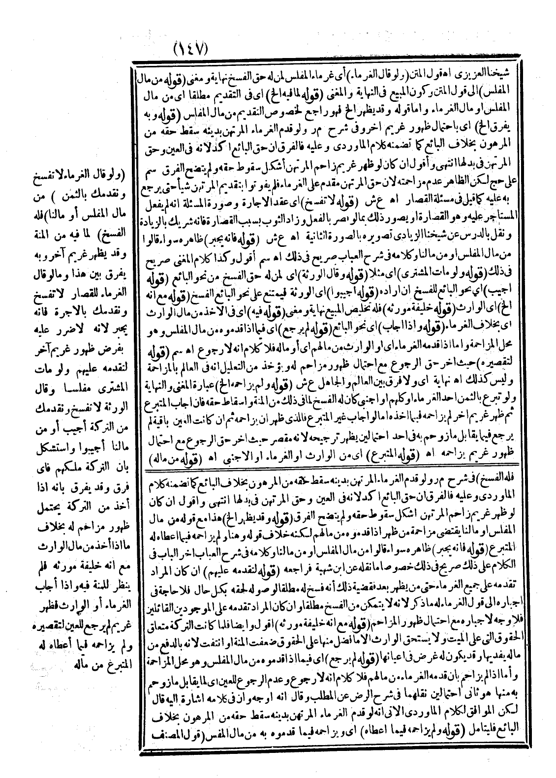 (قَوْلُهُ لِتَقَدُّمِهِ عَلَيْهِمْ) إنْ كَانَ الْمُرَادُ تَقَدُّمَهُ عَلَى جَمِيعِ الْغُرَمَاءِ حَتَّى مَنْ يَظْهَرُ بَعْدُ فَقَضِيَّةُ ذَلِكَ أَنَّهُ لَا فَسْخَ لَهُ مُطْلَقًا لِوُصُولِهِ لِحَقِّهِ بِكُلِّ حَالٍ فَلَا حَاجَةَ فِي إجْبَارِهِ إلَى قَوْلِ الْغُرَمَاءِ لَهُ مَا ذُكِرَ؛ لِأَنَّهُ لَا يَتَمَكَّنُ مِنْ الْفَسْخِ مُطْلَقًا وَإِنْ كَانَ الْمُرَادُ تَقَدُّمَهُ عَلَى الْمَوْجُودِينَ الْقَائِلِينَ فَلَا وَجْهَ لِإِجْبَارِهِ مَعَ احْتِمَالِ ظُهُورِ الْمُزَاحِمِ (قَوْلُهُ مَعَ أَنَّهُ خَلِيفَةُ مُوَرِّثِهِ) أَقُولُ وَأَيْضًا فَلَمَّا كَانَتْ التَّرِكَةُ مُتَعَلِّقَ الْحُقُوقِ الَّتِي عَلَى الْمَيِّتِ وَلَا يَسْتَحِقُّ الْوَارِثُ إلَّا مَا فَضَلَ مِنْهَا عَلَى الْحُقُوقِ ضَعُفَتْ الْمِنَّةُ أَوْ انْتَفَتْ؛ لِأَنَّهُ بِالدَّفْعِ مِنْ مَالِهِ يَفْدِيهَا وَقَدْ يَكُونُ لَهُ غَرَضٌ فِي أَعْيَانِهَا.