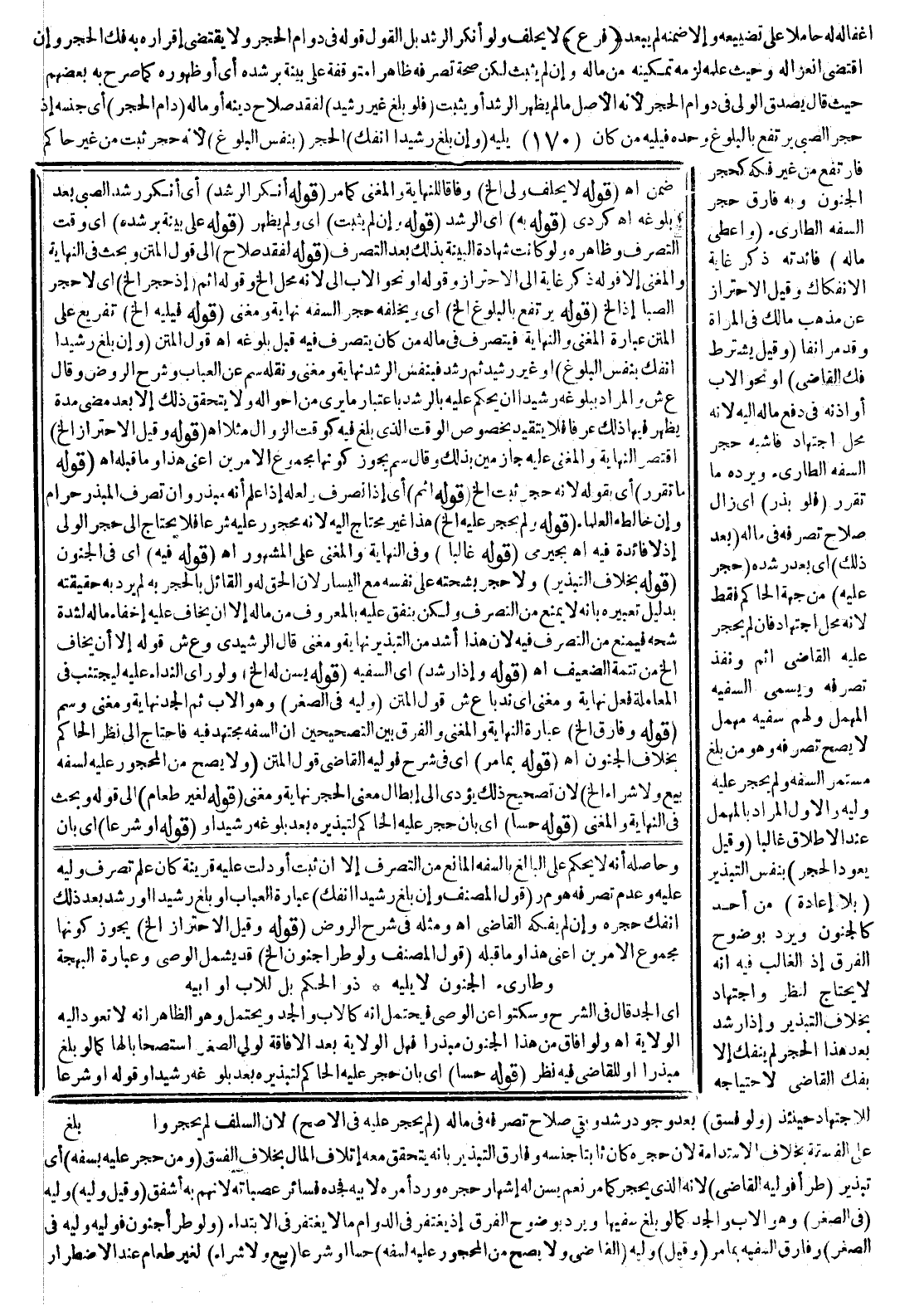 ـــــــــــــــــــــــــــــSوَحَاصِلُهُ أَنَّهُ لَا يُحْكَمُ عَلَى الْبَالِغِ بِالسَّفَهِ الْمَانِعِ مِنْ التَّصَرُّفِ إلَّا إنْ ثَبَتَ أَوْ دَلَّتْ عَلَيْهِ قَرِينَةٌ كَأَنْ عَلِمَ تَصَرُّفَ وَلِيِّهِ عَلَيْهِ وَعَدَمَ تَصَرُّفِهِ هُوَ م ر.
