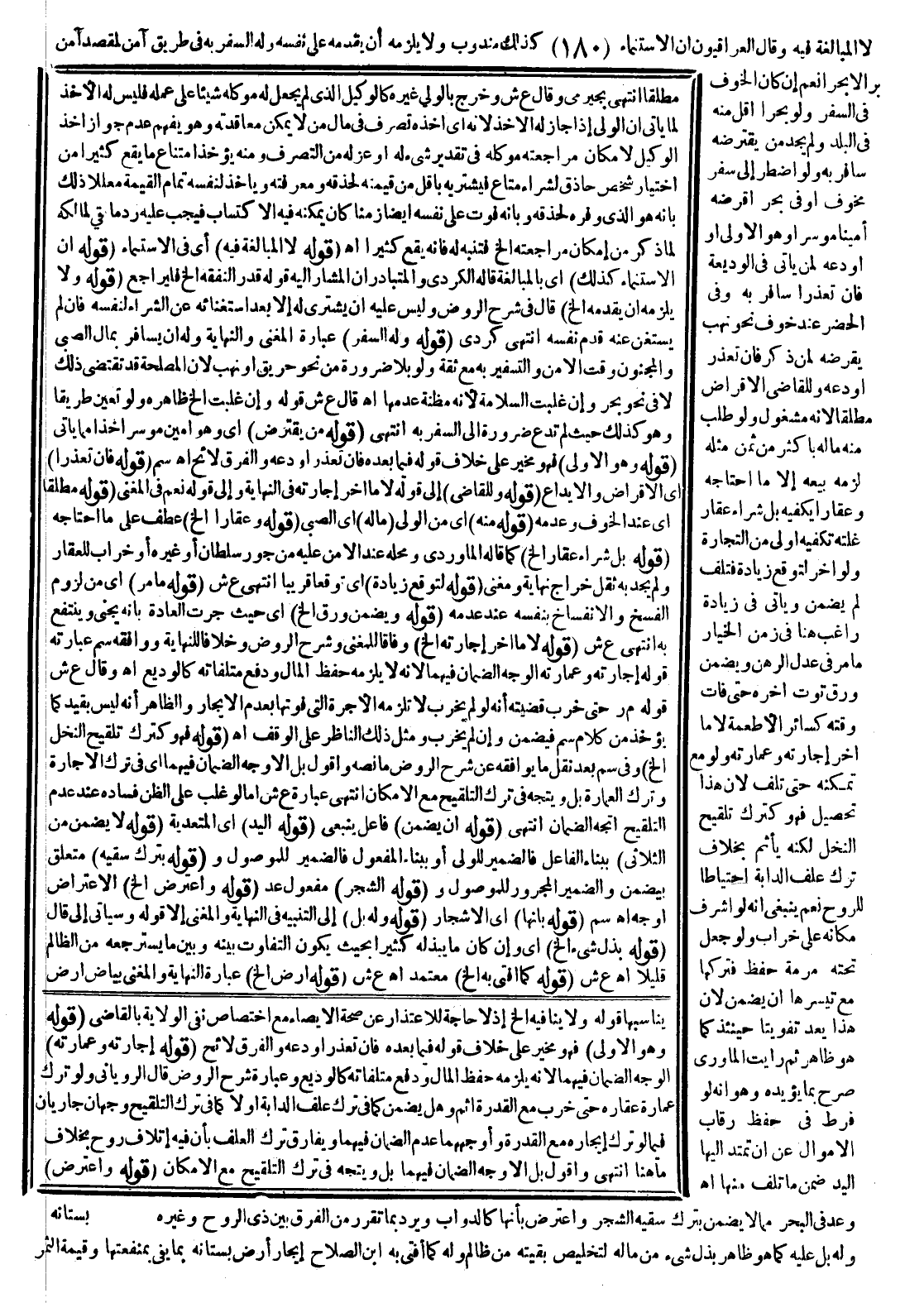 لَا الْمُبَالَغَةُ فِيهِ وَقَالَ الْعِرَاقِيُّونَ إنَّ الِاسْتِنْمَاءَ كَذَلِكَ مَنْدُوبٌ وَلَا يَلْزَمُهُ أَنْ يُقَدِّمَهُ عَلَى نَفْسِهِ وَلَهُ السَّفَرُ بِهِ فِي طَرِيقٍ آمِنٍ لِمَقْصَدٍ آمِنٍ بَرًّا لَا بَحْرًا نَعَمْ إنْ كَانَ الْخَوْفُ فِي السَّفَرِ وَلَوْ بَحْرًا أَقَلَّ مِنْهُ فِي الْبَلَدِ وَلَمْ يَجِدْ مَنْ يَقْتَرِضُهُ سَافَرَ بِهِ وَلَوْ اُضْطُرَّ إلَى سَفَرٍ مَخُوفٍ أَوْ فِي بَحْرٍ أَقْرَضَهُ أَمِينًا مُوسِرًا وَهُوَ الْأَوْلَى أَوْ أَوْدَعَهُ لِمَنْ يَأْتِي فِي الْوَدِيعَةِ فَإِنْ تَعَذَّرَ سَافَرَ بِهِ وَفِي الْحَضَرِ عِنْدَ خَوْفِ نَحْوِ نَهْبٍ يُقْرِضُهُ لِمَنْ ذَكَرَ فَإِنْ تَعَذَّرَ أَوْدَعَهُ وَلِلْقَاضِي الْإِقْرَاضُ مُطْلَقًا؛ لِأَنَّهُ مَشْغُولٌ، وَلَوْ طَلَبَ مِنْهُ مَالَهُ بِأَكْثَرَ مِنْ ثَمَنِ مِثْلِهِ لَزِمَهُ بَيْعُهُ إلَّا مَا احْتَاجَهُ وَعَقَارًا يَكْفِيهِ بَلْ شِرَاءُ عَقَارٍ غَلَّتُهُ تَكْفِيهِ أَوْلَى مِنْ التِّجَارَةِ، وَلَوْ أَخَّرَ لِتَوَقُّعِ زِيَادَةٍ فَتَلِفَ لَمْ يَضْمَنْ وَيَأْتِي فِي زِيَادَةِ رَاغِبٍ هُنَا فِي زَمَنِ الْخِيَارِ مَا مَرَّ فِي عَدْلِ الرَّهْنِ وَيَضْمَنُ وَرَقَ تُوتٍ أَخَّرَهُ حَتَّى فَاتَ وَقْتُهُ كَسَائِرِ الْأَطْعِمَةِ لَا مَا أَخَّرَ إجَارَتَهُ وَعِمَارَتَهُ وَلَوْ مَعَ تَمَكُّنِهِ حَتَّى تَلِفَ؛ لِأَنَّ هَذَا تَحْصِيلٌ فَهُوَ كَتَرْكِ تَلْقِيحِ النَّخْلِ لَكِنَّهُ يَأْثَمُ بِخِلَافِ تَرْكِ عَلَفِ الدَّابَّةِ احْتِيَاطًا لِلرُّوحِ نَعَمْ يَنْبَغِي أَنَّهُ لَوْ أَشْرَفَ مَكَانُهُ عَلَى خَرَابٍ وَلَوْ جَعَلَ تَحْتَهُ مَرَمَّةَ حِفْظٍ فَتَرَكَهَا مَعَ تَيَسُّرِهَا أَنْ يَضْمَنَ؛ لِأَنَّ هَذَا يُعَدُّ تَفْوِيتًا حِينَئِذٍ كَمَا هُوَ ظَاهِرٌ ثُمَّ رَأَيْت الْمَاوَرْدِيَّ صَرَّحَ بِمَا يُؤَيِّدُهُ وَهُوَ أَنَّهُ لَوْ فَرَّطَ فِي حِفْظِ رِقَابِ الْأَمْوَالِ عَنْ أَنْ تَمْتَدَّ إلَيْهَا الْيَدُ ضَمِنَ مَا تَلِفَ مِنْهَا اهـ وَعُدَّ فِي الْبَحْرِ مِمَّا لَا يَضْمَنُ بِتَرْكِ سَقْيِهِ الشَّجَرَ وَاعْتُرِضَ بِأَنَّهَا كَالدَّوَابِّ وَيُرَدُّ بِمَا تَقَرَّرَ مِنْ الْفَرْقِ بَيْنَ ذِي الرُّوحِ وَغَيْرِهِ وَلَهُ بَلْ عَلَيْهِ كَمَا هُوَ ظَاهِرُ بَذْلِ شَيْءٍ مِنْ مَالِهِ لِتَخْلِيصِ بَقِيَّتِهِ مِنْ ظَالِمٍ وَلَهُ كَمَا أَفْتَى بِهِ ابْنُ الصَّلَاحِ إيجَارُ أَرْضِ بُسْتَانِهِ بِمَا يَفِي بِمَنْفَعَتِهَا وَقِيمَةِ الثَّمَرِ