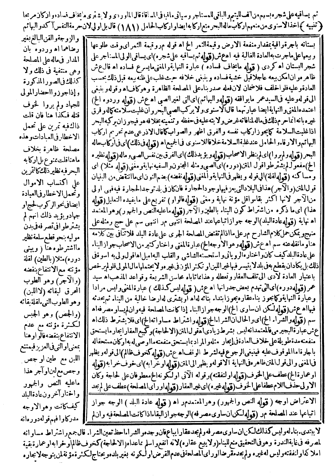 (تَنْبِيهٌ) أَخَذَ الْإِسْنَوِيُّ مِنْ مَنْعِهِمْ إرْكَابَ مَالِهِ الْبَحْرَ مَنْعُ إرْكَابِهِ أَيْضًا وَإِرْكَابَ الْحَامِلِ قَالَ بَلْ أَوْلَى؛ لِأَنَّ حُرْمَةَ النَّفْسِ آكَدُ وَالْبَهَائِمُ وَالزَّوْجَةُ وَالْقِنُّ الْبَالِغُ بِغَيْرِ رِضَاهُمَا اهـ وَرَدُّوهُ بِأَنَّ الْمَدَارَ فِي مَالِهِ عَلَى الْمَصْلَحَةِ وَهِيَ مُنْتَفِيَةٌ فِي ذَلِكَ وَلَا كَذَلِكَ فِي الصُّوَرِ الْمَذْكُورَةِ وَإِذَا جَوَّزُوا إحْضَارَ الْمَوْلَى لِلْجِهَادِ وَلَمْ يَرَوْا لِخَوْفِ قَتْلِهِ فَكَذَا هُنَا، فَإِنْ قُلْت: ذَاكَ فِيهِ تَمْرِينٌ عَلَى تَحَمُّلِ الْأَخْطَارِ فِي الْعِبَادَاتِ وَهَذِهِ مَصْلَحَةٌ ظَاهِرَةٌ بِخِلَافِ مَا هُنَا قُلْت مَمْنُوعٌ بَلْ إرْكَابُهُ الْبَحْرَ فِيهِ نَظِيرُ ذَلِكَ كَالتَّمْرِينِ عَلَى اكْتِسَابِ الْأَمْوَالِ وَتَحَمُّلِ الْأَخْطَارِ فِي الْعِبَادَةِ أَيْضًا فِي نَحْوِ الرُّكُوبِ لِحَجٍّ أَوْ جِهَادٍ، وَيُؤَيِّدُ ذَلِكَ أَنَّهُمْ لَمْ يَشْتَرِطُوا فِي تَصَرُّفِهِ فِي بَدَنِ مُوَلِّيهِ بِنَحْوِ قَطْعِ سِلْعَةٍ نَظِيرَ مَا اشْتَرَطُوهُ هُنَا (وَيَبْنِي دُورَهُ) مَثَلًا (بِالطِّينِ) لِقِلَّةِ مُؤْنَتِهِ مَعَ الِانْتِفَاعِ بِنَقْضِهِ (وَالْآجُرِّ) وَهُوَ الطُّوبُ الْمُحَرَّقُ لِبَقَائِهِ (لَا اللَّبِنُ) وَهُوَ الطُّوبُ النَّيْءُ لِقِلَّةِ بَقَائِهِ (وَالْجِصِّ) وَهُوَ الْجِبْسُ لِكَثْرَةِ مُؤْنَتِهِ مَعَ عَدَمِ الِانْتِفَاعِ بِنَقْضِهِ فَالْوَاوُ هُنَا بِمَعْنَى أَوْ الَّتِي فِي الْعَزِيزِ فَيَمْتَنِعُ اللَّبِنُ مَعَ طِينٍ أَوْ جِصٍّ وَجِصٍّ مَعَ لَبِنٍ أَوْ آجُرٍّ هَذَا مَا عَلَيْهِ النَّصُّ وَالْجُمْهُورُ وَاخْتَارَ آخَرُونَ عَادَةَ الْبَلَدِ كَيْفَ كَانَتْ وَهُوَ الْأَوْجَهُ مُدْرِكًا، وَأَفْهَمَ قَوْلُهُ دُورَهُ أَنَّهُ لَا يَبْتَدِئُ بِنَاءً لَهُ وَلَيْسَ كَذَلِكَ لَكِنْ إنْ سَاوَى مَصْرِفَهُ وَلَمْ يَجِدْ عَقَارًا يُبَاعُ فَإِنْ وَجَدَهُ وَالشِّرَاءُ أَحَظُّ تَعَيَّنَ الشِّرَاءُ.