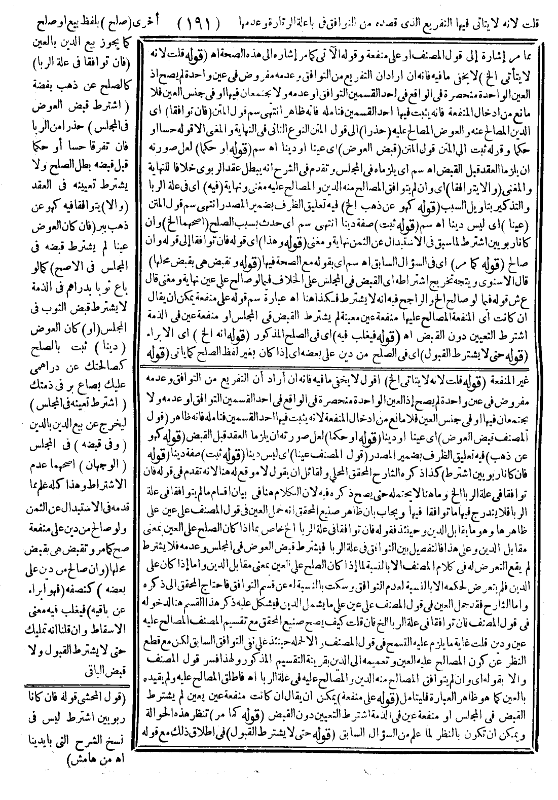 وَأَمَّا الشَّارِحُ فَقَدْ حَمَلَ الْعَيْنَ فِي قَوْلِ الْمُصَنِّفِ عَلَى عَيْنٍ عَلَى مَا يَشْمَلُ الدَّيْنَ فَيُشْكِلُ عَلَيْهِ ذِكْرُ هَذَا الْقِسْمِ هُنَا لِدُخُولِهِ فِي قَوْلِ الْمُصَنِّفِ فَإِنْ تَوَافَقَا فِي عِلَّةِ الرِّبَا إلَخْ فَإِنْ قُلْت كَيْفَ يُصْبِحُ صَنِيعُ الْمُحَقِّقِ مَعَ تَقْسِيمِ الْمُصَنِّفِ الْمُصَالَحَ عَلَيْهِ إلَى عَيْنٍ وَدَيْنٍ قُلْت غَايَةُ مَا يَلْزَمُ عَلَيْهِ التَّسَمُّحُ فِي قَوْلِ الْمُصَنِّفِ وَإِلَّا لِحَمْلِهِ حِينَئِذٍ عَلَى نَفْيِ التَّوَافُقِ السَّابِقِ لَكِنْ مَعَ قَطْعِ النَّظَرِ عَنْ كَوْنِ الْمُصَالَحِ عَلَيْهِ الْعَيْنَ وَتَعْمِيمَهُ إلَى الدَّيْنِ بِقَرِينَةِ التَّقْسِيمِ الْمَذْكُورِ وَلِهَذَا فَسَّرَ قَوْلَ الْمُصَنِّفِ وَإِلَّا بِقَوْلِهِ أَيْ: وَإِنْ لَمْ يَتَوَافَقْ الْمُصَالَحُ مِنْهُ الدَّيْنُ وَالْمُصَالَحُ عَلَيْهِ فِي عِلَّةِ الرَّبَّا اهـ.