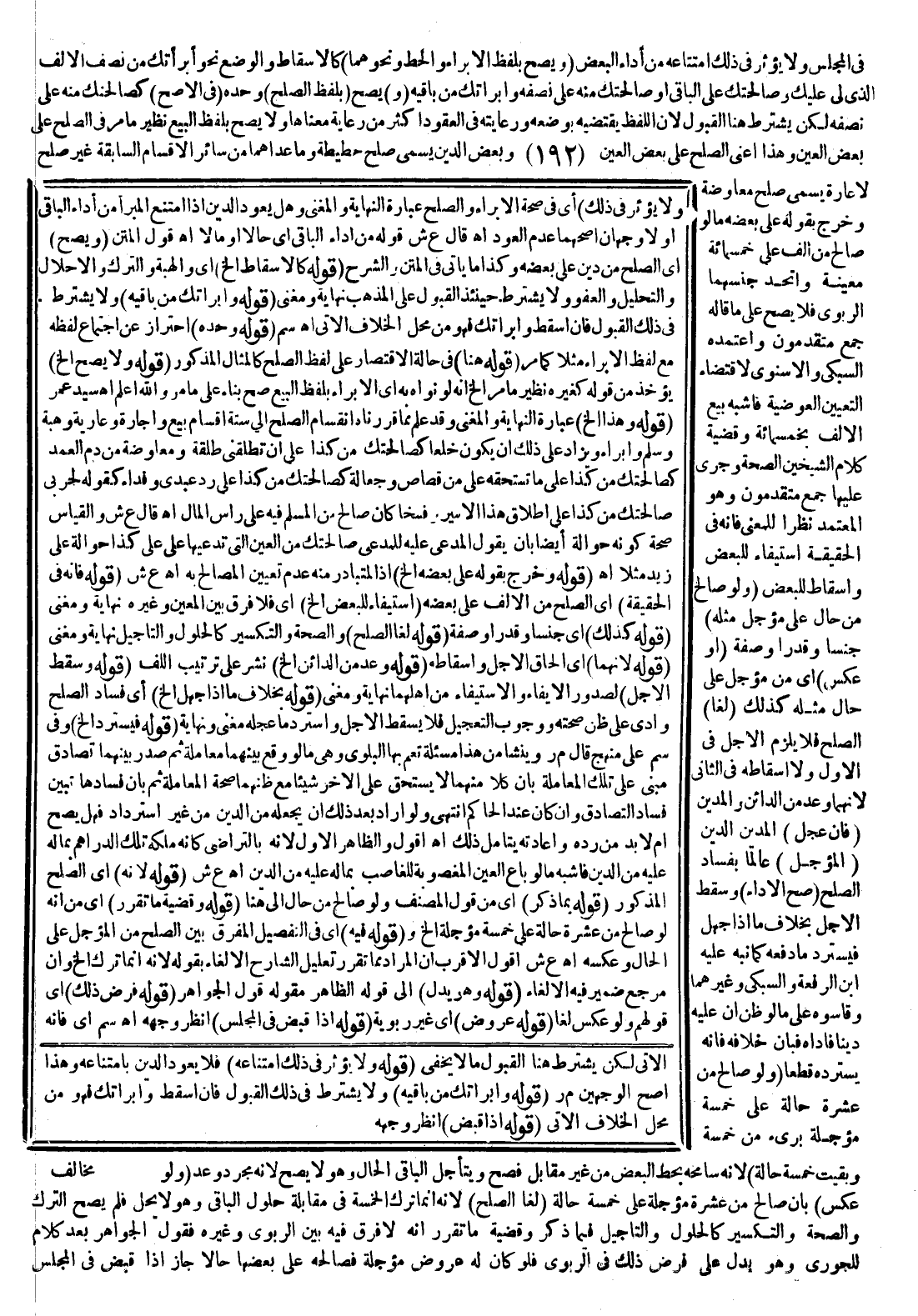 فِي الْمَجْلِسِ وَلَا يُؤَثِّرُ فِي ذَلِكَ امْتِنَاعُهُ مِنْ أَدَاءِ الْبَعْضِ (وَيَصِحُّ بِلَفْظِ الْإِبْرَاءِ وَالْحَطِّ وَنَحْوِهِمَا) كَالْإِسْقَاطِ وَالْوَضْعِ نَحْوَ أَبْرَأْتُك مِنْ نِصْفِ الْأَلْفِ الَّذِي لِي عَلَيْك وَصَالَحْتُك عَلَى الْبَاقِي أَوْ صَالَحْتُك مِنْهُ عَلَى نِصْفِهِ وَأَبْرَأْتُك مِنْ بَاقِيهِ (وَ) يَصِحُّ (بِلَفْظِ الصُّلْحِ) وَحْدَهُ (فِي الْأَصَحِّ) كَصَالَحْتُكَ مِنْهُ عَلَى نِصْفِهِ لَكِنْ يُشْتَرَطُ هُنَا الْقَبُولُ؛ لِأَنَّ اللَّفْظَ يَقْتَضِيهِ بِوَضْعِهِ وَرِعَايَتِهِ فِي الْعُقُودِ أَكْثَرَ مِنْ رِعَايَةِ مَعْنَاهَا وَلَا يَصِحُّ بِلَفْظِ الْبَيْعِ نَظِيرَ مَا مَرَّ فِي الصُّلْحِ عَلَى بَعْضِ الْعَيْنِ وَهَذَا أَعْنِي الصُّلْحَ عَلَى بَعْضِ الْعَيْنِ وَبَعْضِ الدَّيْنِ يُسَمَّى صُلْحَ حَطِيطَةٍ وَمَا عَدَاهُمَا مِنْ سَائِرِ الْأَقْسَامِ السَّابِقَةِ غَيْرُ صُلْحِ الْإِعَارَةِ يُسَمَّى صُلْحَ مُعَاوَضَةٍ، وَخَرَجَ بِقَوْلِهِ عَلَى بَعْضِهِ مَا لَوْ صَالَحَ مِنْ أَلْفٍ عَلَى خَمْسِمِائَةٍ مُعَيَّنَةٍ وَاتَّحَدَ جِنْسُهُمَا الرِّبَوِيُّ فَلَا يَصِحُّ عَلَى مَا قَالَهُ جَمْعٌ مُتَقَدِّمُونَ وَاعْتَمَدَهُ السُّبْكِيُّ وَالْإِسْنَوِيُّ لِاقْتِضَاءِ التَّعْيِينِ الْعِوَضِيَّةَ فَأَشْبَهَ بَيْعَ الْأَلْفِ بِخَمْسِمِائَةٍ وَقَضِيَّةُ كَلَامِ الشَّيْخَيْنِ الصِّحَّةُ وَجَرَى عَلَيْهَا جَمْعٌ مُتَقَدِّمُونَ وَهُوَ الْمُعْتَمَدُ نَظَرًا لِلْمَعْنَى فَإِنَّهُ فِي الْحَقِيقَةِ اسْتِيفَاءٌ لِلْبَعْضِ وَإِسْقَاطٌ لِلْبَعْضِ.