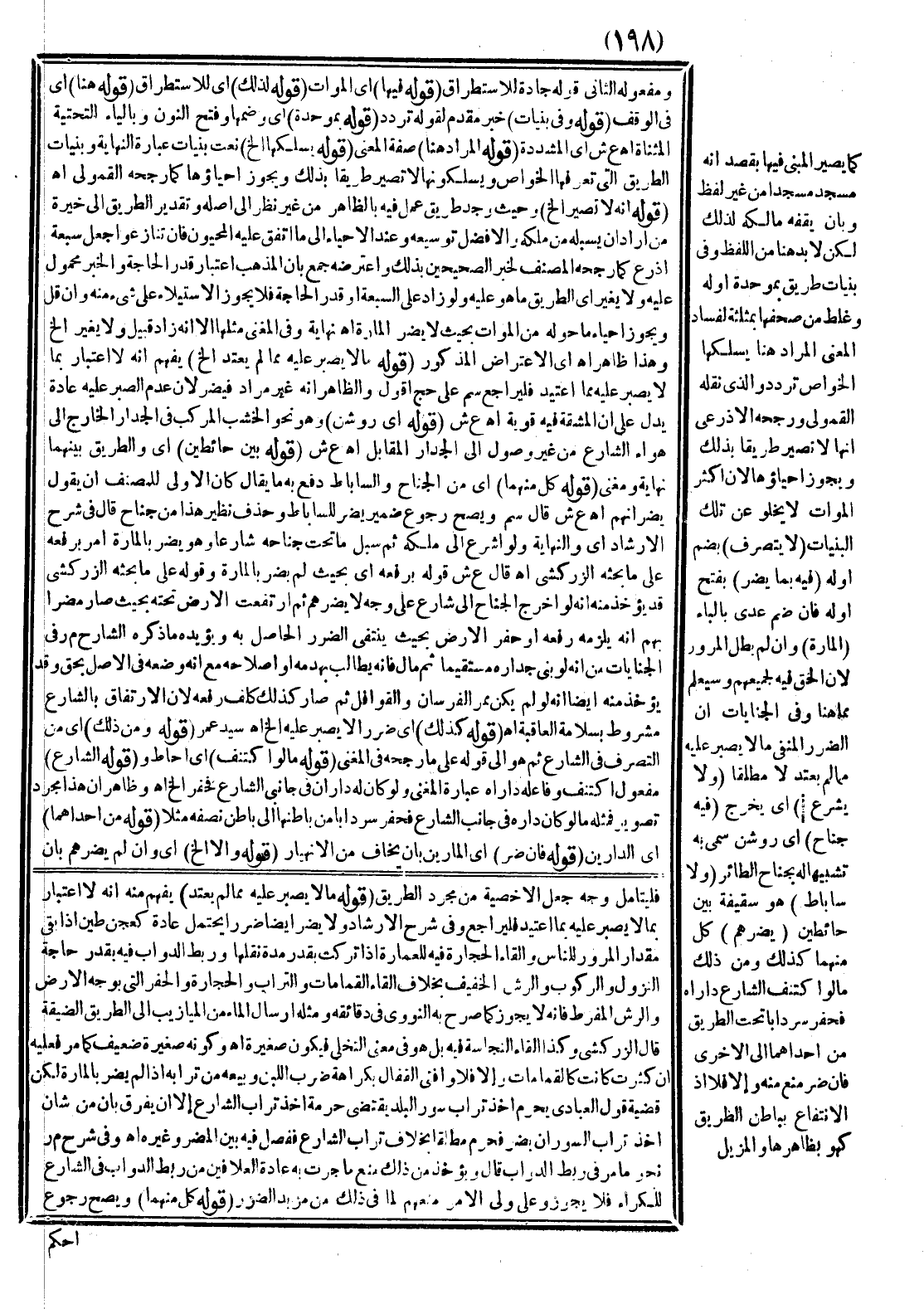 (قَوْلُهُ كَذَلِكَ) أَيْ: ضَرَرًا لَا يَصْبِرُ عَلَيْهِ إلَخْ اهـ سَيِّدْ عُمَرْ (قَوْلُهُ وَمِنْ ذَلِكَ) أَيْ: مِنْ التَّصَرُّفِ فِي الشَّارِعِ ثُمَّ هُوَ إلَى قَوْلِهِ عَلَى مَا رَجَّحَهُ فِي الْمُغْنِي (قَوْلُهُ مَا لَوْ اكْتَنَفَ) أَيْ: أَحَاطَ (وَقَوْلُهُ الشَّارِعَ) مَفْعُولُ اكْتَنَفَ وَفَاعِلُهُ دَارَاهُ عِبَارَةُ الْمُغْنِي وَلَوْ كَانَ لَهُ دَارَانِ فِي جَانِبَيْ الشَّارِعِ فَحَفَرَ إلَخْ اهـ.