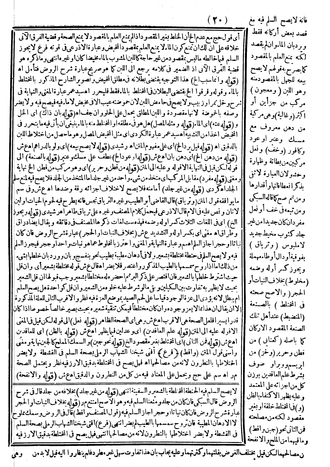 فَإِنَّهُ لَا يَصِحُّ السَّلَمُ فِيهِ مَعَ قَصْدِ بَعْضِ أَرْكَانِهِ فَقَطْ وَيُرَدُّ بِأَنَّ الْمَاءَ وَإِنْ لَمْ يُقْصَدْ لَكِنَّهُ يَمْنَعُ الْعِلْمَ بِالْمَقْصُودِ كَمَا يُصَرِّحُ بِهِ قَوْلُهُمْ لَا يَصِحُّ بَيْعُهُ لِلْجَهْلِ بِالْمَقْصُودِ مِنْهُ وَهُوَ اللَّبَنُ (وَمَعْجُونٍ) مُرَكَّبٍ مِنْ جُزْأَيْنِ أَوْ أَكْثَرَ (وَغَالِيَةٍ) وَهِيَ مُرَكَّبَةٌ مِنْ دُهْنٍ مَعْرُوفٍ مَعَ مِسْكٍ وَعَنْبَرٍ أَوْ عُودٍ وَكَافُورٍ (وَخُفٍّ) وَنَعْلٍ مُرَكَّبَيْنِ مِنْ بِطَانَةٍ وَظِهَارَةٍ وَحَشْوٍ لِأَنَّ الْعِبَارَةَ لَا تَفِي بِذِكْرِ انْعِطَافَاتِهَا وَأَقْدَارِهَا وَمِنْ ثَمَّ صَحَّ كَمَا قَالَهُ السُّبْكِيُّ وَمَنْ تَبِعَهُ فِي خُفٍّ أَوْ نَعْلٍ مُفْرَدٍ إنْ كَانَ جَدِيدًا مِنْ غَيْرِ جِلْدِ ثَوْبٍ مِخْيَطٍ جَدِيدٍ لَا مَلْبُوسٍ (وَتِرْيَاقٍ) بِفَوْقِيَّةٍ أَوْ دَالٍ أَوْ طَاءٍ مُهْمَلَةٍ وَيَجُوزُ كَسْرُ أَوَّلِهِ وَضَمُّهُ (مَخْلُوطٍ) بِخِلَافِ النَّبَاتِ أَوْ الْحَجَرِ (وَالْأَصَحُّ صِحَّتُهُ فِي الْمُخْتَلِطِ) بِالصَّنْعَةِ (الْمُنْضَبِطِ) عِنْدَ أَهْلِ تِلْكَ الصَّنْعَةِ الْمَقْصُودِ الْأَرْكَانِ كَمَا بِأَصْلِهِ (كَعَتَّابِيٍّ) مِنْ قُطْنٍ وَحَرِيرٍ (وَخَزٍّ) مِنْ إبْرَيْسَمٍ وَوَبَرٍ وَصُوفٍ بِشَرْطِ عِلْمِ الْعَاقِدَيْنِ بِوَزْنِ كُلٍّ مِنْ أَجْزَائِهِ عَلَى الْمُعْتَمَدِ وَعَلَيْهِ يَظْهَرُ الِاكْتِفَاءُ بِالظَّنِّ (وَ) فِي الْمُخْتَلِطِ خِلْقَةً أَوْ بِغَيْرِ مَقْصُودٍ لَكِنَّهُ مِنْ مَصْلَحَتِهِ فَمِنْ الثَّانِي نَحْوُ (جُبْنٍ وَأَقِطٍ) وَمَا فِيهِمَا مِنْ الْمِلْحِ وَالْإِنْفَحَةِ مِنْ مَصَالِحِهِمَا لَكِنْ قِيلَ يَخْتَلِفُ الْغَرَضُ بِقِلَّتِهِمَا وَكَثْرَتِهِمَا وَعَلَيْهِ يُجَابُ بِأَنَّ هَذَا تَفَاوُتٌ سَهْلٌ غَيْرُ مُطَّرِدٍ فَلَمْ يَنْظُرُوا إلَيْهِ.