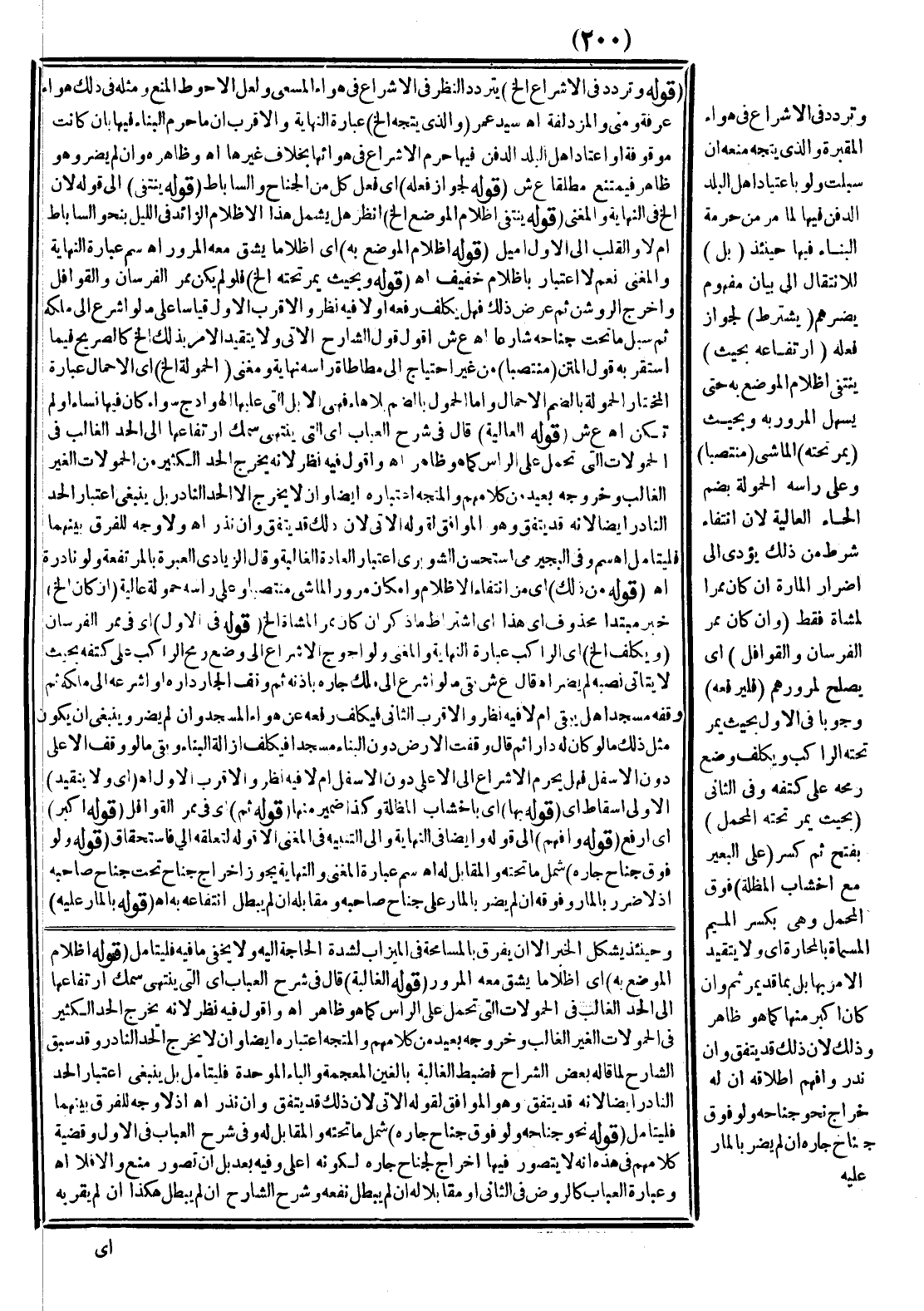وَتَرَدَّدَ فِي الْإِشْرَاعِ فِي هَوَاءِ الْمَقْبَرَةِ وَاَلَّذِي يُتَّجَهُ مَنْعُهُ إنْ سُبِّلَتْ وَلَوْ بِاعْتِيَادِ أَهْلِ الْبَلَدِ الدَّفْنَ فِيهَا لِمَا مَرَّ مِنْ حُرْمَةِ الْبِنَاءِ فِيهَا حِينَئِذٍ (بَلْ) لِلِانْتِقَالِ إلَى بَيَانِ مَفْهُومِ يَضُرُّهُمْ (يُشْتَرَطُ) لِجَوَازِ فِعْلِهِ (ارْتِفَاعُهُ بِحَيْثُ) يَنْتَفِي إظْلَامُ الْمَوْضِعِ بِهِ حَتَّى يَسْهُلَ الْمُرُورُ بِهِ وَبِحَيْثُ (يَمُرُّ تَحْتَهُ) الْمَاشِي (مُنْتَصِبًا) وَعَلَى رَأْسِهِ الْحُمُولَةُ بِضَمِّ الْحَاءِ الْغَالِبَةِ؛ لِأَنَّ انْتِفَاءَ شَرْطٍ مِنْ ذَلِكَ يُؤَدِّي إلَى إضْرَارِ الْمَارَّةِ إنْ كَانَ مَمَرًّا لِمُشَاةٍ فَقَطْ.