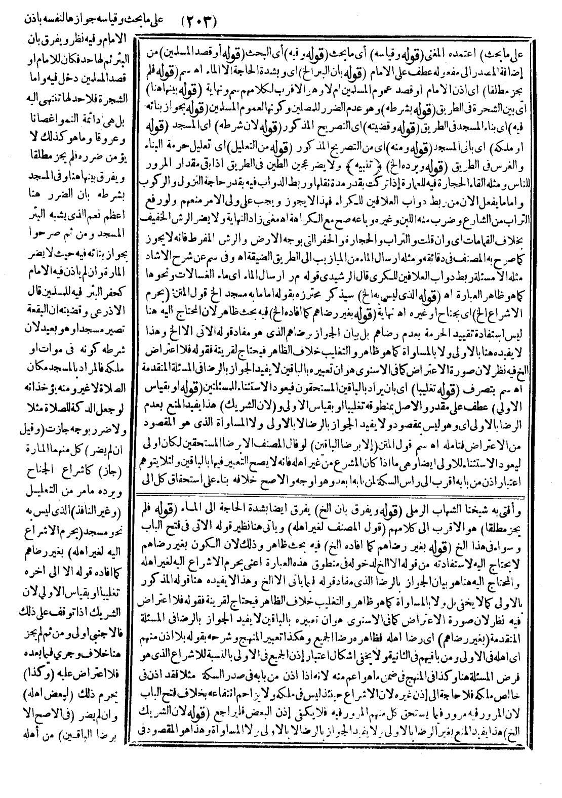 عَلَى مَا بَحَثَ وَقِيَاسُهُ جَوَازُهَا لِنَفْسِهِ بِإِذْنِ الْإِمَامِ وَفِيهِ نَظَرٌ وَيُفَرَّقُ بِأَنَّ الْبِئْرَ ثَمَّ لَهَا حَدٌّ فَكَانَ لِلْإِمَامِ أَوْ قَصْدُ الْمُسْلِمِينَ دَخَلَ فِيهِ وَأَمَّا الشَّجَرَةُ فَلَا حَدَّ لَهَا تَنْتَهِي إلَيْهِ بَلْ هِيَ دَائِمَةُ النُّمُوِّ أَغْصَانًا وَعُرُوقًا وَمَا هُوَ كَذَلِكَ لَا يُؤْمَنُ ضَرَرُهُ فَلَمْ يَجُزْ مُطْلَقًا وَيُفَرَّقُ بَيْنَهَا هُنَا وَفِي الْمَسْجِدِ بِشَرْطِهِ بِأَنَّ الضَّرَرَ هُنَا أَعْظَمُ، نَعَمْ الَّذِي يُشْبِهُ الْبِئْرَ الْمَسْجِدُ وَمِنْ ثَمَّ صَرَّحُوا بِجَوَازِ بِنَائِهِ فِيهِ حَيْثُ لَا يَضُرُّ الْمَارَّةَ وَإِنْ لَمْ يَأْذَنْ فِيهِ الْإِمَامُ كَحَفْرِ الْبِئْرِ فِيهِ لِلْمُسْلِمِينَ قَالَ الْأَذْرَعِيُّ وَقَضِيَّتُهُ أَنَّ الْبُقْعَةَ تَصِيرُ مَسْجِدًا وَهُوَ بَعِيدٌ؛ لِأَنَّ شَرْطَهُ كَوْنُهُ فِي مَوَاتٍ أَوْ مِلْكِهِ فَالْمُرَادُ بِالْمَسْجِدِ مَكَانُ الصَّلَاةِ لَا غَيْرُ وَمِنْهُ يُؤْخَذُ أَنَّهُ لَوْ جَعَلَ الدَّكَّةَ لِلصَّلَاةِ مَثَلًا وَلَا ضَرَرَ بِوَجْهٍ جَازَتْ (وَقِيلَ إنْ لَمْ يَضُرَّ) كُلٌّ مِنْهُمَا الْمَارَّةَ (جَازَ) كَإِشْرَاعِ الْجَنَاحِ وَيَرُدُّهُ مَا مَرَّ مِنْ التَّعْلِيلِ.
