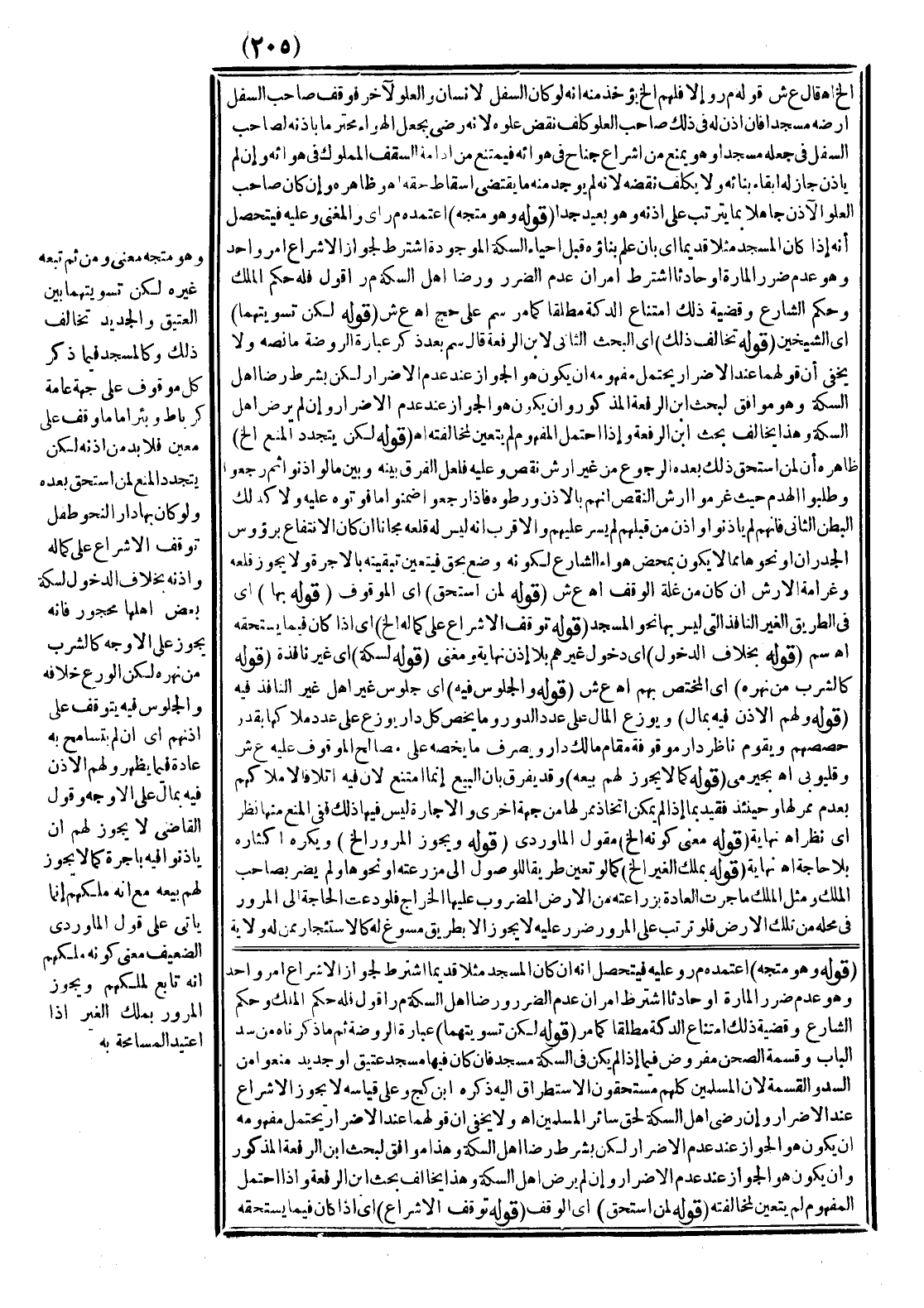 ـــــــــــــــــــــــــــــSقَوْلُهُ وَهُوَ مُتَّجَهٌ) اعْتَمَدَهُ م ر وَعَلَيْهِ فَيَتَحَصَّلُ أَنَّهُ إنْ كَانَ الْمَسْجِدُ مَثَلًا قَدِيمًا اُشْتُرِطَ لِجَوَازِ الْإِشْرَاعِ أَمْرٌ وَاحِدٌ وَهُوَ عَدَمُ ضَرَرِ الْمَارَّةِ أَوْ حَادِثًا اُشْتُرِطَ أَمْرَانِ عَدَمُ الضَّرَرِ وَرِضَا أَهْلِ السِّكَّةِ م ر أَقُولُ فَلَهُ حُكْمُ الْمِلْكِ وَحُكْمُ الشَّارِعِ وَقَضِيَّةُ ذَلِكَ امْتِنَاعُ الدَّكَّةِ مُطْلَقًا كَمَا مَرَّ.
