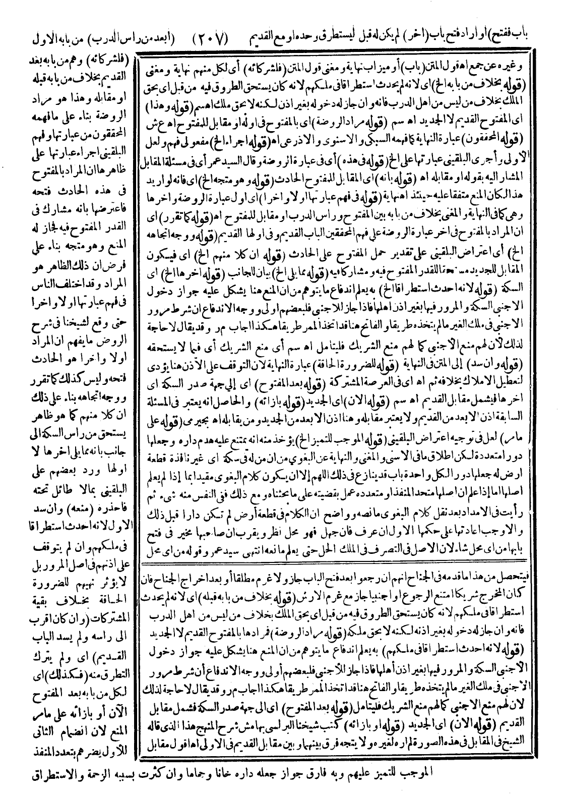 (قَوْلُهُ وَوَجْهُ اتِّجَاهِهِ إلَخْ) أَيْ اعْتِرَاضُ الْبُلْقِينِيِّ عَلَى تَقْدِيرِ حَمْلِ الْمَفْتُوحِ عَلَى الْحَادِثِ (قَوْلُهُ أَنَّ كُلًّا مِنْهُمْ إلَخْ) أَيْ: فَيَكُونُ الْمُقَابِلُ لِلْجَدِيدِ مُسْتَحِقًّا لِلْقَدْرِ الْمَفْتُوحِ فِيهِ وَمُشَارِكًا فِيهِ (قَوْلُهُ مِمَّا يَلِي إلَخْ) بَيَانٌ لِلْجَانِبِ (قَوْلُهُ آخِرَهَا إلَخْ) أَيْ السِّكَّةِ (قَوْلُهُ: لِأَنَّهُ أَحْدَثَ اسْتِطْرَاقًا إلَخْ) بِهِ يُعْلَمُ انْدِفَاعُ مَا يُتَوَهَّمُ مِنْ أَنَّ الْمَنْعَ هُنَا يُشْكِلُ عَلَيْهِ جَوَازُ دُخُولِ الْأَجْنَبِيِّ السِّكَّةَ وَالْمُرُورِ فِيهَا بِغَيْرِ إذْنِ أَهْلِهَا فَإِذَا جَازَ لِلْأَجْنَبِيِّ فَلِبَعْضِهِمْ أَوْلَى وَوَجْهُ الِانْدِفَاعِ أَنَّ شَرْطَ مُرُورِ الْأَجْنَبِيِّ فِي مِلْكِ الْغَيْرِ مَا لَمْ يَتَّخِذْهُ طَرِيقًا وَالْفَاتِحُ هُنَا قَدْ اتَّخَذَ الْمَمَرَّ طَرِيقًا هَكَذَا أَجَابَ م ر وَقَدْ يُقَالُ لَا حَاجَةَ لِذَلِكَ؛ لِأَنَّ لَهُمْ مَنْعَ الْأَجْنَبِيِّ كَمَا لَهُمْ مَنْعُ الشَّرِيكِ فَلْيُتَأَمَّلْ اهـ سم أَيْ: مَنْعُ الشَّرِيكِ أَيْ: فِيمَا لَا يَسْتَحِقُّهُ (قَوْلُهُ وَإِنْ سَدَّ) إلَى الْمَتْنِ فِي النِّهَايَةِ (قَوْلُهُ لِلضَّرُورَةِ الْحَاقَّةِ) عِبَارَةُ النِّهَايَةِ؛ لِأَنَّ التَّوَقُّفَ عَلَى الْإِذْنِ هُنَا يُؤَدِّي لِتَعْطِيلِ الْأَمْلَاكِ بِخِلَافِهِ ثُمَّ اهـ أَيْ: فِي الْعَرْصَةِ الْمُشْتَرَكَةِ (قَوْلُهُ بَعْدَ الْمَفْتُوحِ) أَيْ: إلَى جِهَةِ صَدْرِ السِّكَّةِ أَيْ: آخِرَهَا فَيَشْمَلُ مُقَابِلَ الْقَدِيمِ اهـ سم.