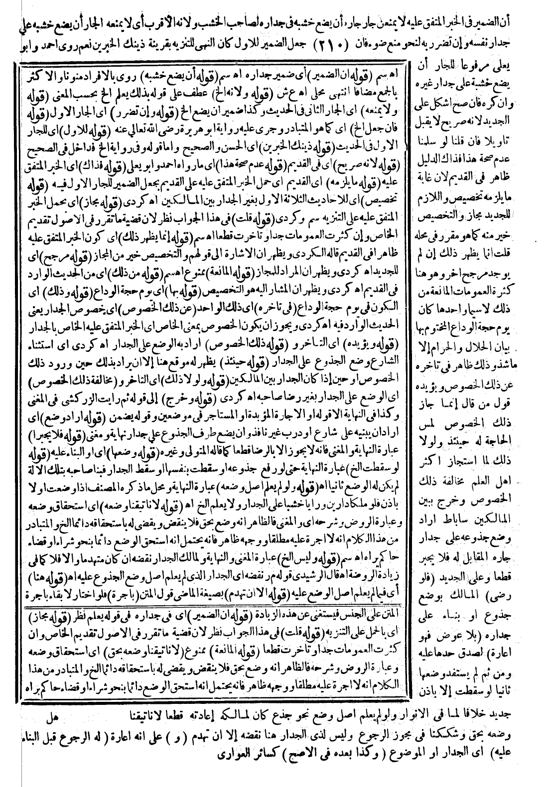 ـــــــــــــــــــــــــــــSالْمَتْنِ عَلَى الْجِنْسِ فَيُسْتَغْنَى عَنْ هَذِهِ الزِّيَادَةِ (قَوْلُهُ أَنَّ الضَّمِيرَ) أَيْ: فِي جِدَارِهِ فِي قَوْلِهِ يُعْلَمُ نَظَرٌ (قَوْلُهُ مَجَازٌ) أَيْ بِالْحَمْلِ عَلَى التَّنْزِيهِ (قَوْلُهُ قُلْت إلَخْ) فِي هَذَا الْجَوَابِ نَظَرٌ؛ لِأَنَّ قَضِيَّةَ مَا تَقَرَّرَ فِي الْأُصُولِ تَقْدِيمُ الْخَاصِّ وَإِنْ كَثُرَتْ الْعُمُومَاتُ جِدًّا وَتَأَخَّرَتْ قَطْعًا (قَوْلُهُ الْمَانِعَةُ) مَمْنُوعٌ.