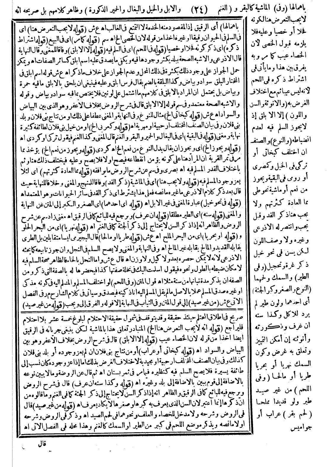 بِإِهْمَالِهَا (وَفِي) الْمَاشِيَةِ كَالْبَقَرِ وَ (الْغَنَمِ وَالْإِبِلِ وَالْخَيْلِ وَالْبِغَالِ وَالْحَمِيرِ الذُّكُورَةِ) وَظَاهِرُ كَلَامِهِمْ بَلْ صَرِيحُهُ أَنْ لَا يَجِبَ التَّعَرُّضُ هُنَا لِكَوْنِهِ فَحْلًا أَوْ خَصِيًّا وَعَلَيْهِ فَلَا يَلْزَمُهُ قَبُولُ الْخَصِيِّ؛ لِأَنَّ الْخِصَاءَ عَيْبٌ كَمَا مَرَّ وَبِهِ يُفَرَّقُ بَيْنَ هَذَا وَمَا يَأْتِي فِي اشْتِرَاطِ ذِكْرِهِ فِي اللَّحْمِ؛ لِأَنَّهُ لَيْسَ عَيْبًا ثَمَّ مَعَ اخْتِلَافِ الْغَرَضِ بِهِ (وَالْأُنُوثَةِ وَالسِّنِّ وَاللَّوْنِ) إلَّا الْأَبْلَقَ إذْ لَا يَجُوزُ السَّلَمُ فِيهِ لِعَدَمِ انْضِبَاطِهِ (وَالنَّوْعِ) وَالصِّنْفِ إنْ اخْتَلَفَ كَبَخَاتِيٍّ أَوْ عِرَابٍ فِي الْإِبِلِ أَوْ كَعَرَبِيٍّ أَوْ تُرْكِيٍّ فِي الْخَيْلِ وَكَمِصْرِيٍّ أَوْ رُومِيٍّ فِي الْبَقِيَّةِ وَيَجُوزُ مِنْ نَعَمٍ أَوْ مَاشِيَةٍ نَحْوِ طَيٍّ مِمَّا الْعَادَةُ كَثْرَتُهُمْ وَلَا يَجِبُ هُنَا ذِكْرُ الْقَدِّ وَقِيلَ يَجِبُ وَانْتَصَرَ لَهُ الْأَذْرَعِيُّ وَغَيْرُهُ وَلَا وَصْفُ اللَّوْنِ لَكِنْ يُسَنُّ فِي نَحْوِ خَيْلٍ ذِكْرُ غُرَّةٍ وَتَحْجِيلٍ (وَفِي الطَّيْرِ) وَالسَّمَكِ وَلَحْمِهِمَا (النَّوْعِ وَالصِّغَرِ وَكِبَرِ الْجُثَّةِ) أَيْ أَحَدِهِمَا، وَلَوْنِ طَيْرٍ لَمْ يُرَدْ لِلْأَكْلِ وَكَذَا سِنُّهُ إنْ عُرِفَ وَذُكُورَتُهُ وَأُنُوثَتُهُ إنْ أَمْكَنَ التَّمْيِيزُ وَتَعَلَّقَ بِهِ غَرَضٌ وَكَوْنُ السَّمَكِ نَهْرِيًّا أَوْ بَحْرِيًّا طَرِيًّا أَوْ مَالِحًا (وَفِي اللَّحْمِ) مِنْ غَيْرِ صَيْدٍ وَطَيْرٍ، وَلَوْ قَدِيدًا مُمَلَّحًا (لَحْمِ بَقَرٍ) عِرَابٍ (أَوْ جَوَامِيسَ
