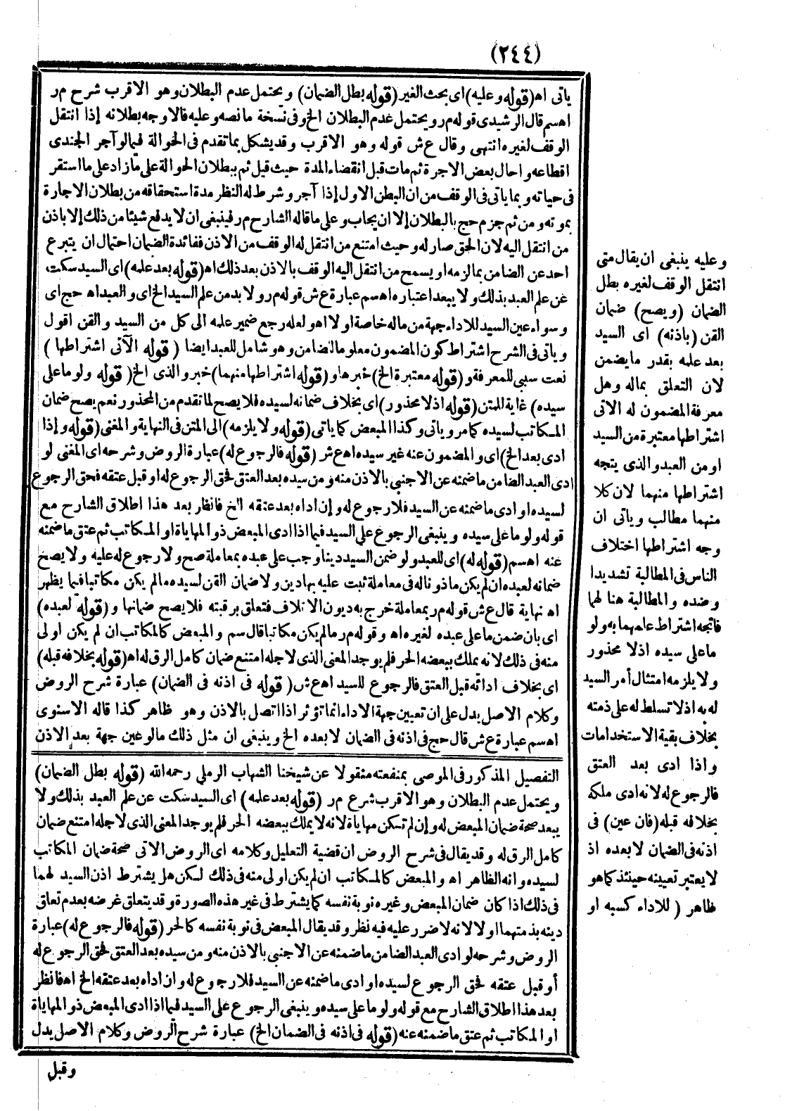 ـــــــــــــــــــــــــــــSالتَّفْصِيلَ الْمَذْكُور فِي الْمُوصَى بِمَنْفَعَتِهِ مَنْقُولًا عَنْ شَيْخِنَا الشِّهَابِ الرَّمْلِيِّ - رَحِمَهُ اللَّهُ - (قَوْلُهُ بَطَلَ الضَّمَانُ) وَيُحْتَمَلُ عَدَمُ الْبُطْلَانِ وَهُوَ الْأَقْرَبُ شَرْحُ م ر.