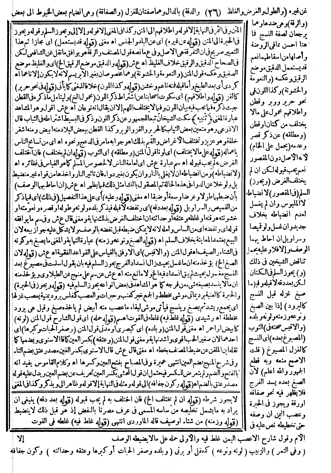 عَنْ غَيْرِهِ (وَالطُّولُ وَالْعَرْضُ وَالْغِلَظُ وَالدِّقَّةُ) بِالدَّالِ وَهُمَا صِفَتَانِ لِلْغَزْلِ (وَالصَّفَاقَةُ) وَهِيَ انْضِمَامُ بَعْضِ الْخُيُوطِ إلَى بَعْضٍ (وَالرِّقَّةُ) وَهِيَ ضِدُّهَا وَهُمَا يَرْجِعَانِ لِصِفَةِ النَّسْجِ فَمَا هُنَا أَحْسَنُ مِمَّا فِي الرَّوْضَةِ وَأَصْلِهَا مِنْ إسْقَاطِهِمَا نَعَمْ قَدْ يُسْتَعْمَلُ الدَّقِيقُ مَوْضِعَ الرَّقِيقِ وَعَكْسُهُ (وَالنُّعُومَةُ وَالْخُشُونَةُ) وَكَذَا اللَّوْنُ فِي نَحْوِ حَرِيرٍ وَوَبَرٍ وَقُطْنٍ وَإِطْلَاقُهُمْ مَحْمُولٌ عَلَى مَا لَا يَخْتَلِفُ مِنْ كِتَابٍ أَوْ قُطْنٍ (وَمُطْلَقُهُ) عَنْ ذِكْرِ قِصَرٍ وَعَدَمِهِ (يُحْمَلُ عَلَى الْخَامِ) ؛ لِأَنَّهُ الْأَصْلُ دُونَ الْمَقْصُورِ نَعَمْ يَجِبُ قَبُولُهُ لَكِنْ إنْ لَمْ يَخْتَلِفْ الْغَرَضُ.