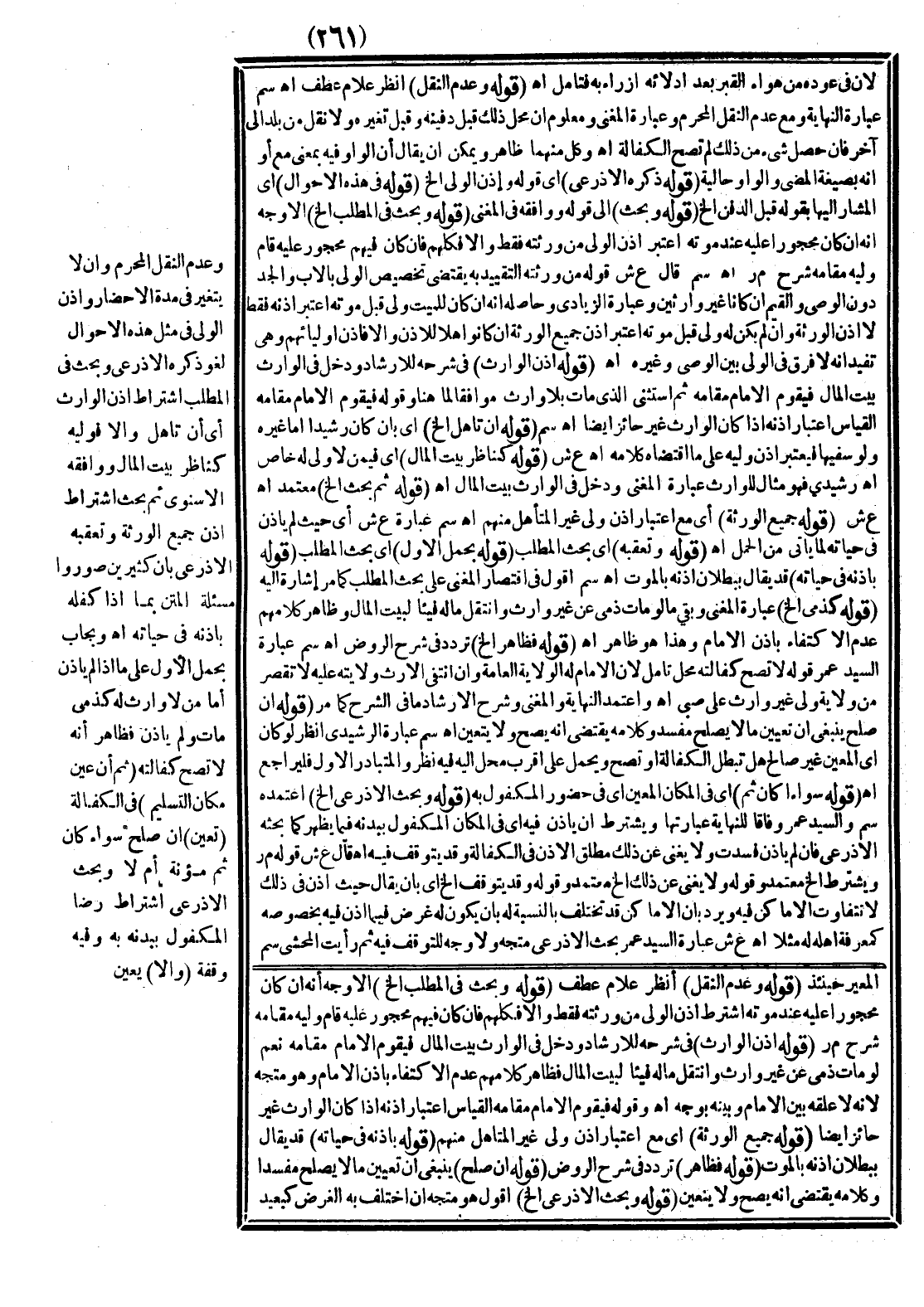 وَعَدَمُ النَّقْلِ الْمُحَرَّمِ وَأَنْ لَا يَتَغَيَّرَ فِي مُدَّةِ الْإِحْضَارِ وَإِذْنُ الْوَلِيِّ فِي مِثْلِ هَذِهِ الْأَحْوَالِ لَغْوٌ ذَكَرَهُ الْأَذْرَعِيُّ وَبَحَثَ فِي الْمَطْلَبِ اشْتِرَاطَ إذْنِ الْوَارِثِ أَيْ إنْ تَأَهَّلَ وَإِلَّا فَوَلِيُّهُ كَنَاظِرِ بَيْتِ الْمَالِ وَوَافَقَهُ الْإِسْنَوِيُّ ثُمَّ بَحَثَ اشْتِرَاطَ إذْنِ جَمِيعِ الْوَرَثَةِ وَتَعَقَّبَهُ الْأَذْرَعِيُّ بِأَنَّ كَثِيرِينَ صَوَّرُوا مَسْأَلَةَ الْمَتْنِ بِمَا إذَا كَفَلَهُ بِإِذْنِهِ فِي حَيَاتِهِ اهـ.