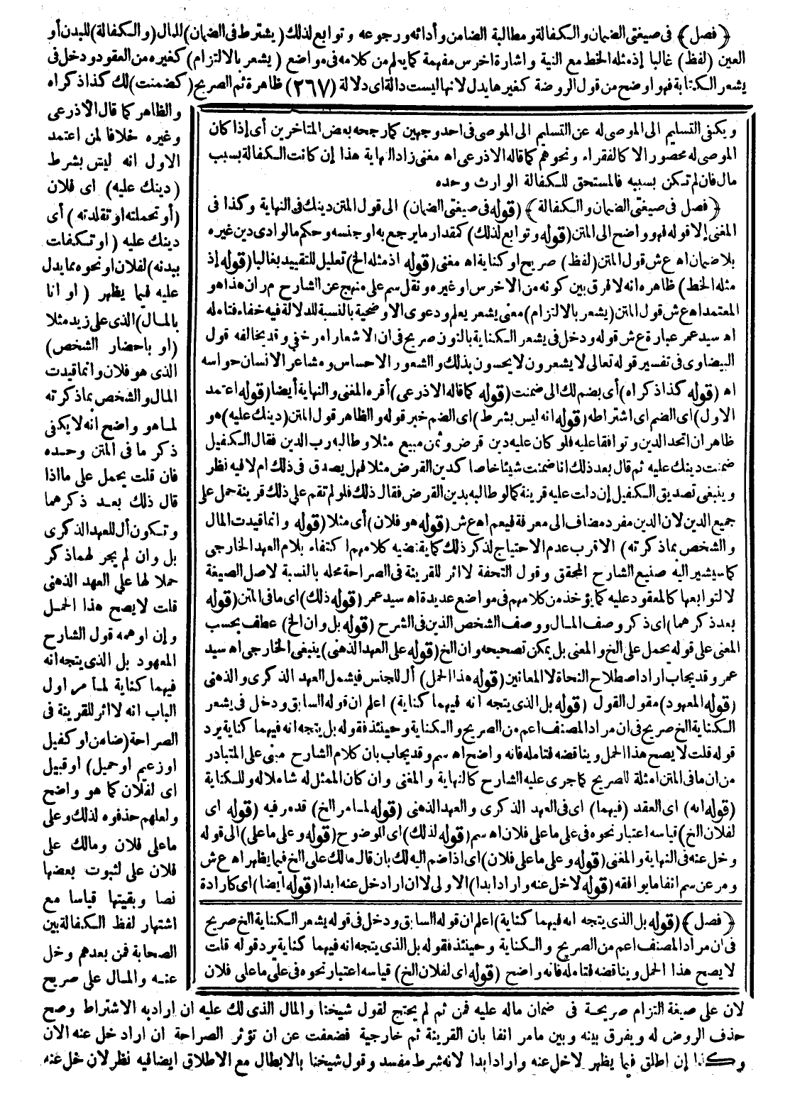 (فَصْلٌ) فِي صِيغَتَيْ الضَّمَانِ وَالْكَفَالَةِ وَمُطَالَبَةِ الضَّامِنِ وَأَدَائِهِ وَرُجُوعِهِ وَتَوَابِعَ لِذَلِكَ (يُشْتَرَطُ فِي الضَّمَانِ) لِلْمَالِ (وَالْكَفَالَةِ) لِلْبَدَنِ أَوْ الْعَيْنِ (لَفْظٌ) غَالِبًا إذْ مِثْلُهُ الْخَطُّ مَعَ النِّيَّةِ وَإِشَارَةُ أَخْرَسَ مُفْهِمَةٌ كَمَا يُعْلَمُ مِنْ كَلَامِهِ فِي مَوَاضِعَ (يُشْعِرُ بِالِالْتِزَامِ) كَغَيْرِهِ مِنْ الْعُقُودِ وَدَخَلَ فِي يُشْعِرُ الْكِتَابَةَ فَهُوَ أَوْضَحُ مِنْ قَوْلِ الرَّوْضَةِ كَغَيْرِهَا بَدَلٌ لِأَنَّهَا لَيْسَتْ دَالَّةً أَيْ دَلَالَةً ظَاهِرَةً ثُمَّ الصَّرِيحُ (كَضَمِنْتُ) لَك كَذَا ذَكَرَاهُ وَالظَّاهِرُ كَمَا قَالَ الْأَذْرَعِيُّ وَغَيْرُهُ خِلَافًا لِمَنْ اعْتَمَدَ الْأَوَّلَ أَنَّهُ لَيْسَ بِشَرْطٍ (دَيْنَك عَلَيْهِ) أَيْ فُلَانٍ (أَوْ تَحَمَّلْتُهُ أَوْ تَقَلَّدْتُهُ) أَيْ دَيْنَك عَلَيْهِ (أَوْ تَكَفَّلْتُ بِبَدَنِهِ) لِفُلَانٍ أَوْ نَحْوِهِ مِمَّا يَدُلُّ عَلَيْهِ فِيمَا يَظْهَرُ (أَوْ أَنَا بِالْمَالِ) الَّذِي عَلَى زَيْدٍ مَثَلًا (أَوْ بِإِحْضَارِ الشَّخْصِ) الَّذِي هُوَ فُلَانٌ وَإِنَّمَا قَيَّدَتْ الْمَالَ وَالشَّخْصَ بِمَا ذَكَرْتُهُ لِمَا هُوَ وَاضِحٌ أَنَّهُ لَا يَكْفِي ذِكْرُ مَا فِي الْمَتْنِ وَحْدَهُ فَإِنْ قُلْتَ يُحْمَلُ عَلَى مَا إذَا قَالَ ذَلِكَ بَعْدَ ذِكْرِهِمَا وَتَكُونُ أَلْ لِلْعَهْدِ الذِّكْرِيِّ بَلْ وَإِنْ لَمْ يَجْرِ لَهُمَا ذِكْرٌ حَمْلًا لَهَا عَلَى الْعَهْدِ الذِّهْنِيِّ قُلْت لَا يَصِحُّ هَذَا الْحَمْلُ وَإِنْ أَوْهَمَهُ قَوْلُ الشَّارِحِ الْمَعْهُودُ بَلْ الَّذِي يَتَّجِهُ أَنَّهُ فِيهِمَا كِنَايَةً لِمَا مَرَّ أَوَّلَ الْبَابِ أَنَّهُ لَا أَثَرَ لِلْقَرِينَةِ فِي الصَّرَاحَةِ (ضَامِنٌ أَوْ كَفِيلٌ أَوْ زَعِيمٌ أَوْ حَمِيلٌ) أَوْ قَبِيلٍ أَيْ لِفُلَانِ كَمَا هُوَ وَاضِحٌ وَلَعَلَّهُمْ حَذَفُوهُ لِذَلِكَ وَعَلَيَّ مَا عَلَى فُلَانٍ، وَمَالُك عَلَى فُلَانٍ عَلَيَّ لِثُبُوتِ بَعْضِهَا نَصًّا وَبَقِيَّتِهَا قِيَاسًا مَعَ اشْتِهَارِ لَفْظِ الْكَفَالَةِ بَيْنَ الصَّحَابَةِ فَمَنْ بَعْدَهُمْ وَخَلِّ عَنْهُ وَالْمَالُ عَلِيَّ صَرِيحٌ لِأَنَّ عَلَيَّ صِيغَةُ الْتِزَامٍ صَرِيحَةٌ فِي ضَمَانِ مَالَهُ عَلَيْهِ فَمِنْ ثَمَّ لَمْ يَحْتَجْ لِقَوْلِ شَيْخِنَا وَالْمَالُ الَّذِي لَك عَلَيْهِ إنْ أَرَادَ بِهِ الِاشْتِرَاطَ وَصَحَّ حَذْفُ الرَّوْضِ لَهُ وَيُفَرَّقُ بَيْنَهُ وَبَيْنَ مَا مَرَّ آنِفًا بِأَنَّ الْقَرِينَةَ ثَمَّ خَارِجِيَّةٌ فَضَعُفَتْ عَنْ أَنَّ تُؤَثِّرَ الصَّرَاحَةَ إنْ أَرَادَ خَلِّ عَنْهُ الْآنَ وَكَذَا إنْ أَطْلَقَ فِيمَا يَظْهَرُ لِأُخَلِّ عَنْهُ وَأَرَادَ أَبَدًا لِأَنَّهُ شَرْطٌ مُفْسِدٌ وَقَوْلُ شَيْخِنَا بِالْإِبْطَالِ مَعَ الْإِطْلَاقِ أَيْضًا فِيهِ نَظَرٌ لِأَنَّ خَلِّ عَنْهُ