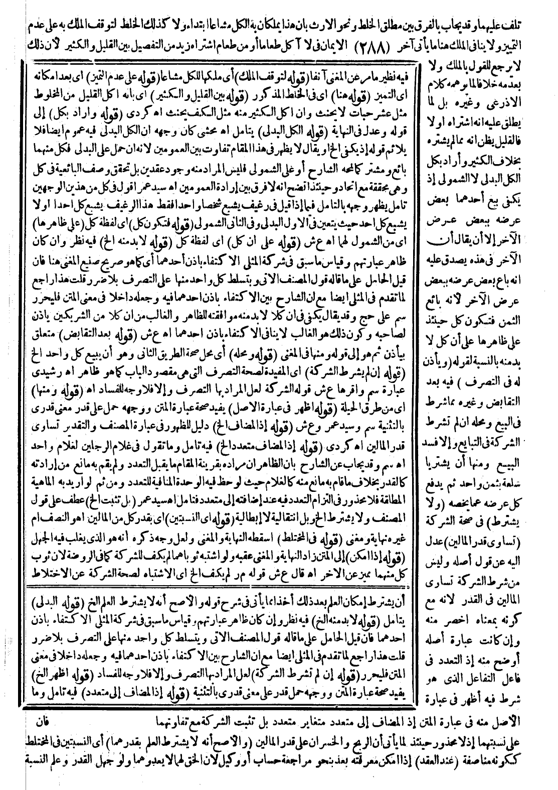 ـــــــــــــــــــــــــــــQفِيهِ نَظِيرُ مَا مَرَّ عَنْ الْمُغْنِي آنِفًا (قَوْلُهُ لِتَوَقُّفِ الْمِلْكِ) أَيْ مِلْكِهَا لِلْكُلِّ مَشَاعًا (قَوْلُهُ عَلَى عَدَمِ التَّمَيُّزِ) أَيْ بَعْدَ إمْكَانِهِ أَيْ التَّمَيُّزِ (قَوْلُهُ هُنَا) أَيْ فِي الْخَلْطِ الْمَذْكُورِ (قَوْلُهُ بَيْنَ الْقَلِيلِ وَالْكَثِيرِ) أَيْ بِأَنَّهُ إنْ أَكَلَ الْقَلِيلَ مِنْ الْمَخْلُوطِ مِثْلَ عَشْرِ حَبَّاتٍ لَا يَحْنَثُ وَإِنْ أَكَلَ الْكَثِيرَ مِنْهُ مِثْلَ الْكَفِّ يَحْنَثُ اهـ كُرْدِيٌّ (قَوْلُهُ وَأَرَادَ بِكُلِّ) إلَى قَوْلِهِ وَعَدَلَ فِي النِّهَايَةِ (قَوْلُهُ الْكُلِّ الْبَدَلِيَّ) يُتَأَمَّلْ اهـ مُحَشِّي كَانَ وَجْهُهُ أَنَّ الْكُلَّ الْبَدَلِيَّ فِيهِ عُمُومٌ أَيْضًا فَلَا يُلَائِمُ قَوْلَهُ إذْ يَكْفِي إلَخْ أَوْ يُقَالُ لَا يَظْهَرُ فِي هَذَا الْمَقَامِ تَفَاوُتٌ بَيْنَ الْعُمُومَيْنِ لِأَنَّهُ إنْ حُمِلَ عَلَى الْبَدَلِيِّ فَكُلٌّ مِنْهُمَا بَائِعٌ وَمُشْتَرٍ كَمَا لَمَحَهُ الشَّارِحُ أَوْ عَلَى الشُّمُولِيِّ فَلَيْسَ الْمُرَادُ مِنْهُ وُجُودَ عَقْدَيْنِ بَلْ تَحَقَّقَ وَصْفُ الْبَائِعِيَّةِ فِي كُلٍّ وَهِيَ مُحَقَّقَةٌ مَعَ اتِّحَادٍ وَحِينَئِذٍ اتَّضَحَ أَنَّهُ لَا فَرْقَ بَيْنَ إرَادَةِ الْعُمُومَيْنِ اهـ سَيِّدُ عُمَرُ أَقُولُ فِي كُلٍّ مِنْ هَذَيْنِ الْوَجْهَيْنِ تَأَمُّلٌ يَظْهَرُ وَجْهُهُ بِالتَّأَمُّلِ فِيمَا إذَا قِيلَ فِي رَغِيفٍ يُشْبِعُ شَخْصًا وَاحِدًا فَقَطْ هَذَا الرَّغِيفُ يُشْبِعُ كُلَّ أَحَدٍ أَوْ لَا يُشْبِعُ كُلَّ أَحَدٍ حَيْثُ يَتَعَيَّنُ فِي الْأَوَّلِ الْبَدَلِيُّ وَفِي الثَّانِي الشُّمُولِيُّ (قَوْلُهُ فَتَكُونُ كُلُّ) أَيْ لَفْظَةُ كُلٍّ (عَلَى ظَاهِرِهَا) أَيْ مِنْ الشُّمُولِ لَهُمَا اهـ ع ش (قَوْلُهُ عَلَى أَنَّ كُلَّ) أَيْ لَفْظَةَ كُلِّ (قَوْلُهُ لَا بُدَّ مِنْهُ إلَخْ) فِيهِ نَظَرٌ وَإِنْ كَانَ ظَاهِرُ عِبَارَتِهِمْ وَقِيَاسُ مَا سَبَقَ فِي شَرِكَةِ الْمِثْلِيِّ الِاكْتِفَاءَ بِإِذْنِ أَحَدِهِمَا أَيْ كَمَا هُوَ صَرِيحُ صَنِيعِ الْمُغْنِي هُنَا فَإِنْ قِيلَ الْحَامِلُ عَلَى مَا قَالَهُ قَوْلُ الْمُصَنِّفِ الْآتِي وَبِتَسَلُّطِ كُلِّ وَاحِدٍ مِنْهُمَا عَلَى التَّصَرُّفِ بِلَا ضَرَرٍ قُلْت هَذَا رَاجِعٌ لِمَا تَقَدَّمَ فِي الْمِثْلِيِّ أَيْضًا مَعَ أَنَّ الشَّارِحَ بَيَّنَ الِاكْتِفَاءَ بِإِذْنِ أَحَدِهِمَا فِيهِ وَجَعَلَهُ دَاخِلًا فِي مَعْنَى الْمَتْنِ فَلْيُحَرَّرْ سم عَلَى حَجّ وَقَدْ يُقَالُ يَكْفِي فِي أَنَّ كُلًّا لَا بُدَّ مِنْهُ مُوَافَقَتُهُ لِلظَّاهِرِ وَالْغَالِبُ مِنْ أَنَّ كُلًّا مِنْ الشَّرِيكَيْنِ يَأْذَنُ لِصَاحِبِهِ وَكَوْنُ ذَلِكَ هُوَ الْغَالِبُ لَا يُنَافِي الِاكْتِفَاءَ بِإِذْنِ أَحَدِهِمَا اهـ ع ش (قَوْلُهُ بَعْدَ التَّقَابُضِ) مُتَعَلِّقٌ بِيَأْذَنُ ثُمَّ هُوَ إلَى قَوْلِهِ وَمِنْهَا فِي الْمُغْنِي (قَوْلُهُ وَمَحِلُّهُ) أَيْ مَحِلُّ صِحَّةِ الطَّرِيقِ الثَّانِي وَهُوَ أَنْ يَبِيعَ كُلُّ وَاحِدٍ إلَخْ (قَوْلُهُ إنْ لَمْ يُشْرَطْ الشَّرِكَةُ) أَيْ الْمُفِيدَةُ لِصِحَّةِ التَّصَرُّفِ الَّتِي هِيَ مَقْصُودُ الْبَابِ كَمَا هُوَ ظَاهِرٌ اهـ رَشِيدِيٌّ عِبَارَةُ سم وَأَقَرَّهَا ع ش قَوْلُهُ الشَّرِكَةَ لَعَلَّ الْمُرَادَ بِهَا التَّصَرُّفُ وَإِلَّا فَلَا وَجْهَ لِلْفَسَادِ اهـ.