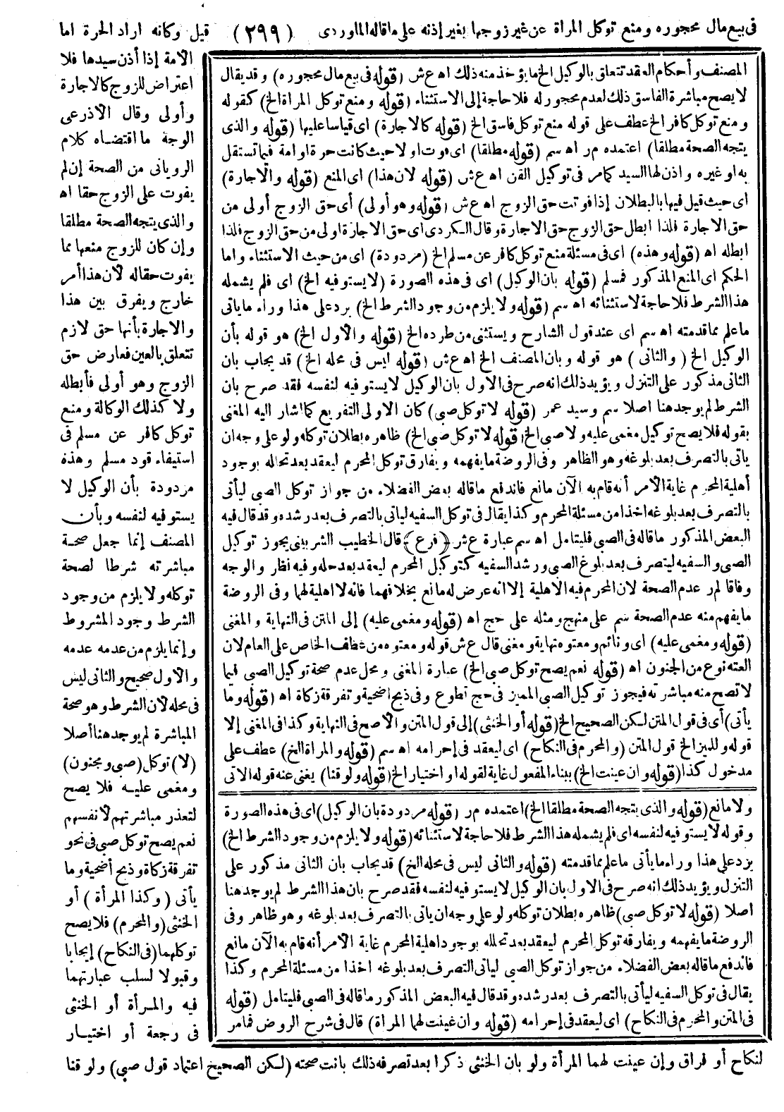 فِي بَيْعِ مَالِ مَحْجُورِهِ وَمَنْعُ تَوَكُّلِ الْمَرْأَةِ عَنْ غَيْرِ زَوْجِهَا بِغَيْرِ إذْنِهِ عَلَى مَا قَالَهُ الْمَاوَرْدِيُّ قِيلَ وَكَأَنَّهُ أَرَادَ الْحُرَّةَ أَمَّا الْأَمَةُ إذَا أَذِنَ سَيِّدُهَا فَلَا اعْتِرَاضَ لِلزَّوْجِ كَالْإِجَارَةِ وَأَوْلَى وَقَالَ الْأَذْرَعِيُّ الْوَجْهُ مَا اقْتَضَاهُ كَلَامُ الرُّويَانِيِّ مِنْ الصِّحَّةِ إنْ لَمْ يُفَوِّتْ عَلَى الزَّوْجِ حَقًّا اهـ.