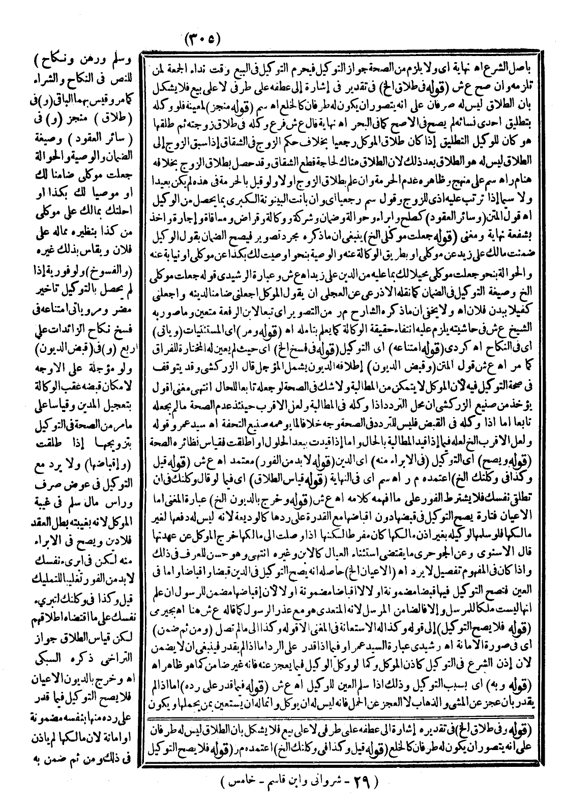 وَسَلَمٍ وَرَهْنٍ وَنِكَاحٍ) لِلنَّصِّ فِي النِّكَاحِ وَالشِّرَاءِ كَمَا مَرَّ وَقِيسَ بِهِمَا الْبَاقِي (وَ) فِي (طَلَاقٍ) مُنَجَّزٍ (وَ) فِي (سَائِرِ الْعُقُودِ) وَصِيغَةُ الضَّمَانِ وَالْوَصِيَّةِ وَالْحَوَالَةِ جَعَلْت مُوَكِّلِي ضَامِنًا لَك أَوْ مُوصِيًا لَك بِكَذَا أَوْ أَحَلْتُك بِمَا لَك عَلَى مُوَكِّلِي مِنْ كَذَا بِنَظِيرِهِ مِمَّا لَهُ عَلَى فُلَانٍ وَيُقَاسَ بِذَلِكَ غَيْرُهُ (وَالْفُسُوخِ) وَلَوْ فَوْرِيَّةً إذَا لَمْ يَحْصُلْ بِالتَّوْكِيلِ تَأْخِيرٌ مُضِرٌّ وَمَرَّ وَيَأْتِي امْتِنَاعُهُ فِي فَسْخِ نِكَاحِ الزَّائِدَاتِ عَلَى أَرْبَعٍ (وَ) فِي (قَبْضِ الدُّيُونِ) وَلَوْ مُؤَجَّلَةً عَلَى الْأَوْجَهِ لِإِمْكَانِ قَبْضِهِ عَقِبَ الْوَكَالَةِ بِتَعْجِيلِ الْمَدِينِ وَقِيَاسًا عَلَى مَا مَرَّ مِنْ الصِّحَّةِ فِي التَّوْكِيلِ بِتَزْوِيجِهَا إذَا طَلُقَتْ (وَإِقْبَاضِهَا) وَلَا يُرَدُّ مَنْعُ التَّوْكِيلِ فِي عِوَضِ صَرْفٍ وَرَأْسِ مَالٍ سُلِّمَ فِي غَيْبَةِ الْمُوَكِّلِ لِأَنَّهُ بِغِيبَتِهِ بَطَلَ الْعَقْدُ فَلَا دَيْنَ وَيَصِحُّ فِي الْإِبْرَاءِ مِنْهُ لَكِنْ فِي أَبْرِئْ نَفْسَك لَا بُدَّ مِنْ الْفَوْرِ تَغْلِيبًا لِلتَّمْلِيكِ قِيلَ وَكَذَا فِي وَكَّلْتُك لِتُبْرِئَ نَفْسَك عَلَى مَا اقْتَضَاهُ إطْلَاقُهُمْ لَكِنْ قِيَاسُ الطَّلَاقِ جَوَازُ التَّرَاخِي ذَكَرَهُ السُّبْكِيُّ اهـ وَخَرَجَ بِالدُّيُونِ الْأَعْيَانُ فَلَا يَصِحُّ التَّوْكِيلُ فِيمَا قَدَرَ عَلَى رَدِّهِ مِنْهَا بِنَفْسِهِ مَضْمُونَةً أَوْ أَمَانَةً لِأَنَّ مَالِكَهَا لَمْ يَأْذَنْ فِي ذَلِكَ وَمِنْ ثَمَّ ضَمِنَ بِهِ