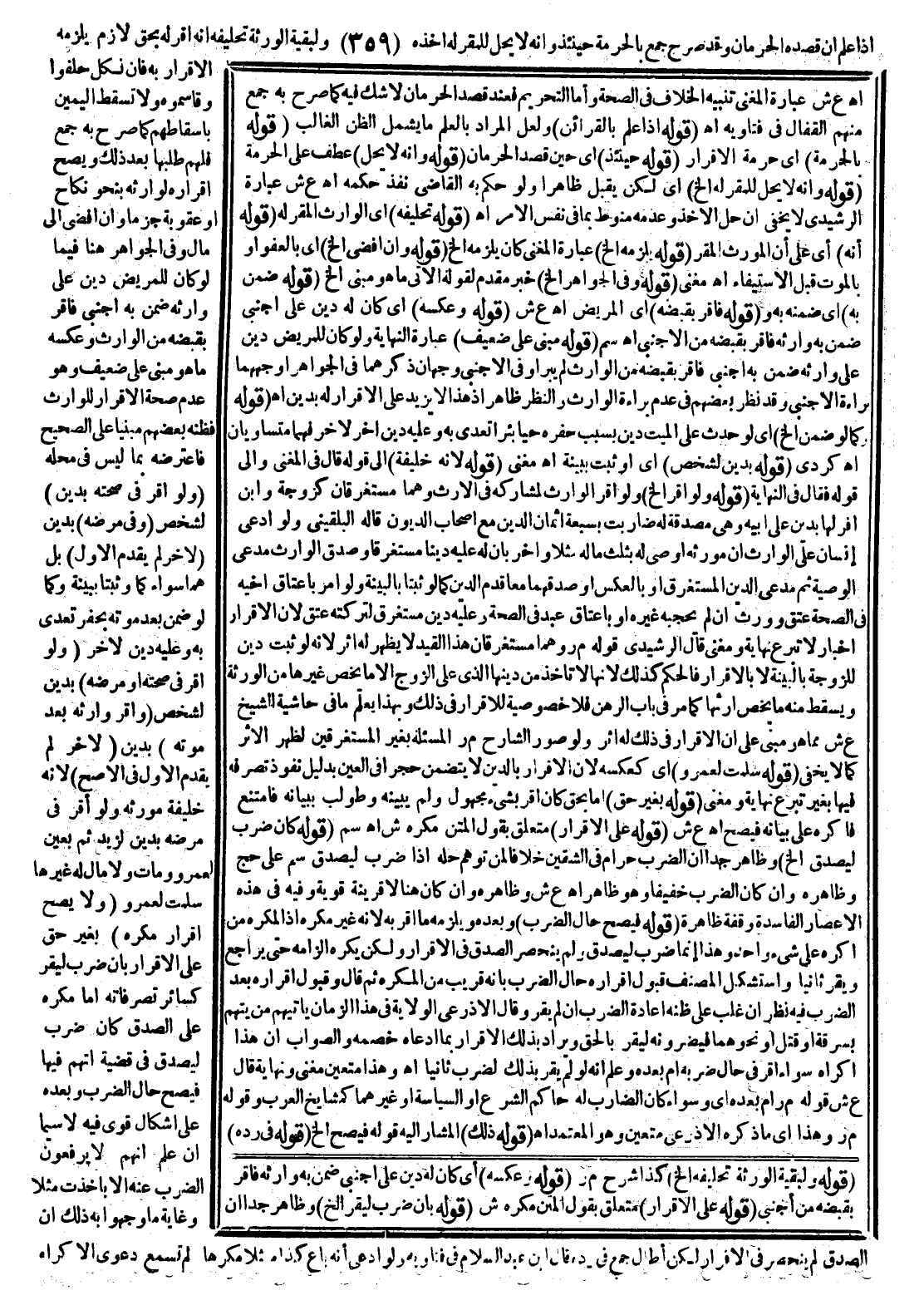ـــــــــــــــــــــــــــــQاهـ. ع ش عِبَارَةُ الْمُغْنِي تَنْبِيهُ الْخِلَافِ فِي الصِّحَّةِ، وَأَمَّا التَّحْرِيمُ فَعِنْدَ قَصْدِ الْحِرْمَانِ لَا شَكَّ فِيهِ كَمَا صَرَّحَ بِهِ جَمْعٌ مِنْهُمْ الْقَفَّالُ فِي فَتَاوِيهِ. اهـ. (قَوْلُهُ: إذَا عُلِمَ بِالْقَرَائِنِ) وَلَعَلَّ الْمُرَادَ بِالْعِلْمِ مَا يَشْمَلُ الظَّنَّ الْغَالِبَ (قَوْلُهُ: بِالْحُرْمَةِ) أَيْ حُرْمَةِ الْإِقْرَارِ (قَوْلُهُ حِينَئِذٍ) أَيْ حِينَ قَصْدِ الْحِرْمَانِ (قَوْلُهُ: وَأَنَّهُ لَا يَحِلُّ) عَطْفٌ عَلَى الْحُرْمَةِ (قَوْلُهُ: وَأَنَّهُ لَا يَحِلُّ لِلْمُقَرِّ لَهُ. إلَخْ) أَيْ لَكِنْ يُقْبَلُ ظَاهِرًا، وَلَوْ حَكَمَ بِهِ الْقَاضِي نَفَذَ حُكْمُهُ. اهـ. ع ش عِبَارَةُ الرَّشِيدِيِّ لَا يَخْفَى أَنَّ حِلَّ الْأَخْذِ وَعَدَمَهُ مَنُوطٌ بِمَا فِي نَفْسِ الْأَمْرِ. اهـ. (قَوْلُهُ تَحْلِيفُهُ) أَيْ الْوَارِثِ الْمُقَرِّ لَهُ (قَوْلُهُ: أَنَّهُ) أَيْ عَلَى أَنَّ الْمُورِثَ الْمُقِرُّ (قَوْلُهُ: يَلْزَمُهُ. إلَخْ) عِبَارَةُ الْمُغْنِي كَانَ يَلْزَمُهُ. إلَخْ (قَوْلُهُ: وَإِنْ أَفْضَى. إلَخْ) أَيْ بِالْعَفْوِ، أَوْ بِالْمَوْتِ قَبْلَ الِاسْتِيفَاءِ. اهـ. مُغْنِي (قَوْلُهُ: وَفِي الْجَوَاهِرِ. إلَخْ) خَبَرٌ مُقَدَّمٌ لِقَوْلِهِ الْآتِي مَا هُوَ مَبْنِيٌّ. إلَخْ (قَوْلُهُ: ضَمِنَ بِهِ) أَيْ ضَمِنَهُ بِهِ وَ (قَوْلُهُ: فَأَقَرَّ بِقَبْضِهِ) أَيْ الْمَرِيضِ. اهـ. ع ش (قَوْلُهُ وَعَكْسُهُ) أَيْ كَانَ لَهُ دَيْنٌ عَلَى أَجْنَبِيٍّ ضَمِنَ بِهِ وَارِثُهُ فَأَقَرَّ بِقَبْضِهِ مِنْ الْأَجْنَبِيِّ. اهـ. سم (قَوْلُهُ: مَبْنِيٌّ عَلَى ضَعِيفٍ) عِبَارَةُ النِّهَايَةِ، وَلَوْ كَانَ لِلْمَرِيضِ دَيْنٌ عَلَى وَارِثِهِ ضَمِنَ بِهِ أَجْنَبِيٌّ فَأَقَرَّ بِقَبْضِهِ مِنْ الْوَارِثِ لَمْ يَبْرَأْ، وَفِي الْأَجْنَبِيِّ وَجْهَانِ ذَكَرَهُمَا فِي الْجَوَاهِرِ أَوْجَهُهُمَا بَرَاءَةُ الْأَجْنَبِيِّ وَقَدْ نَظَرَ بَعْضُهُمْ فِي عَدَمِ بَرَاءَةِ الْوَارِثِ وَالنَّظَرُ ظَاهِرٌ إذْ هَذَا لَا يَزِيدُ عَلَى الْإِقْرَارِ لَهُ بِدَيْنٍ. اهـ.