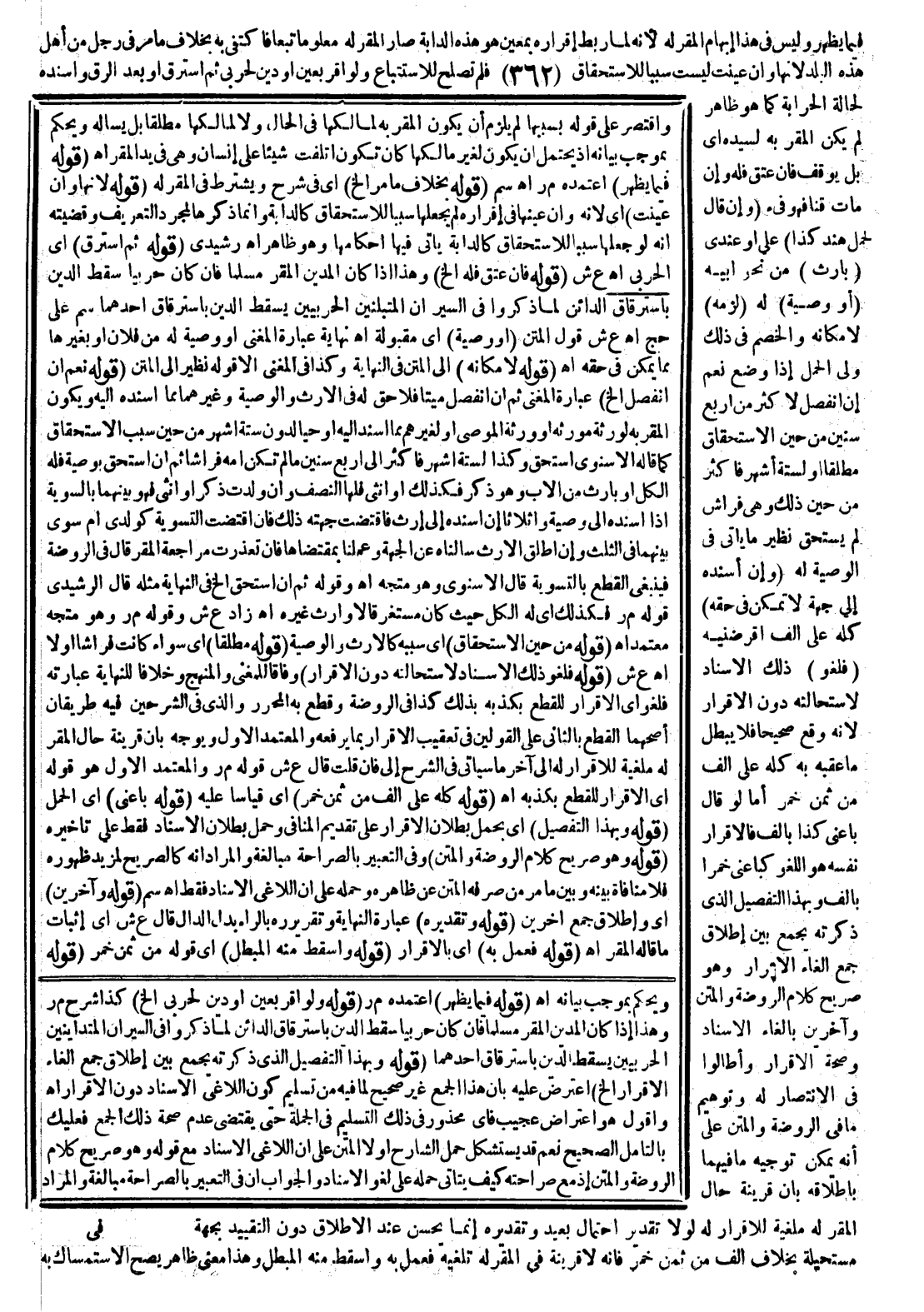 فِيمَا يَظْهَرُ، وَلَيْسَ فِي هَذَا إبْهَامُ الْمُقَرِّ لَهُ؛ لِأَنَّهُ لَمَّا رَبَطَ إقْرَارَهُ بِمُعَيَّنٍ هُوَ هَذِهِ الدَّابَّةُ صَارَ الْمُقَرُّ لَهُ مَعْلُومًا تَبَعًا فَاكْتَفَى بِهِ بِخِلَافِ مَا مَرَّ فِي رَجُلٍ مِنْ أَهْلِ هَذِهِ الْبَلَدِ لِأَنَّهَا، وَإِنْ عُيِّنَتْ لَيْسَتْ سَبَبًا لِلِاسْتِحْقَاقِ فَلَمْ تَصْلُحُ لِلِاسْتِتْبَاعِ، وَلَوْ أَقَرَّ بِعَيْنٍ، أَوْ دَيْنٍ لِحَرْبِيٍّ ثُمَّ اسْتَرَقَّ، أَوْ بَعْدَ الرِّقِّ وَأَسْنَدَهُ لِحَالَةِ الْحِرَابَةِ كَمَا هُوَ ظَاهِرٌ لَمْ يَكُنْ الْمُقَرُّ بِهِ لِسَيِّدِهِ أَيْ بَلْ يُوقَفُ فَإِنْ عَتَقَ فَلَهُ وَإِنْ مَاتَ قِنًّا فَهُوَ فَيْءٌ (وَإِنْ قَالَ لِحَمْلِ هَذَا كَذَا) عَلَيَّ، أَوْ عِنْدِي (بِإِرْثٍ) مِنْ نَحْوِ أَبِيهِ (أَوْ وَصِيَّةٍ) لَهُ (لَزِمَهُ) لِإِمْكَانِهِ وَالْخَصْمُ فِي ذَلِكَ وَلِيُّ الْحَمْلِ إذَا وُضِعَ نَعَمْ إنْ انْفَصَلَ لِأَكْثَرَ مِنْ أَرْبَعِ سِنِينَ مِنْ حِينِ الِاسْتِحْقَاقِ مُطْلَقًا أَوْ لِسِتَّةِ أَشْهُرٍ فَأَكْثَرَ مِنْ حِينِ ذَلِكَ وَهِيَ فِرَاشٌ لَمْ يَسْتَحِقَّ نَظِيرَ مَا يَأْتِي فِي الْوَصِيَّةِ لَهُ