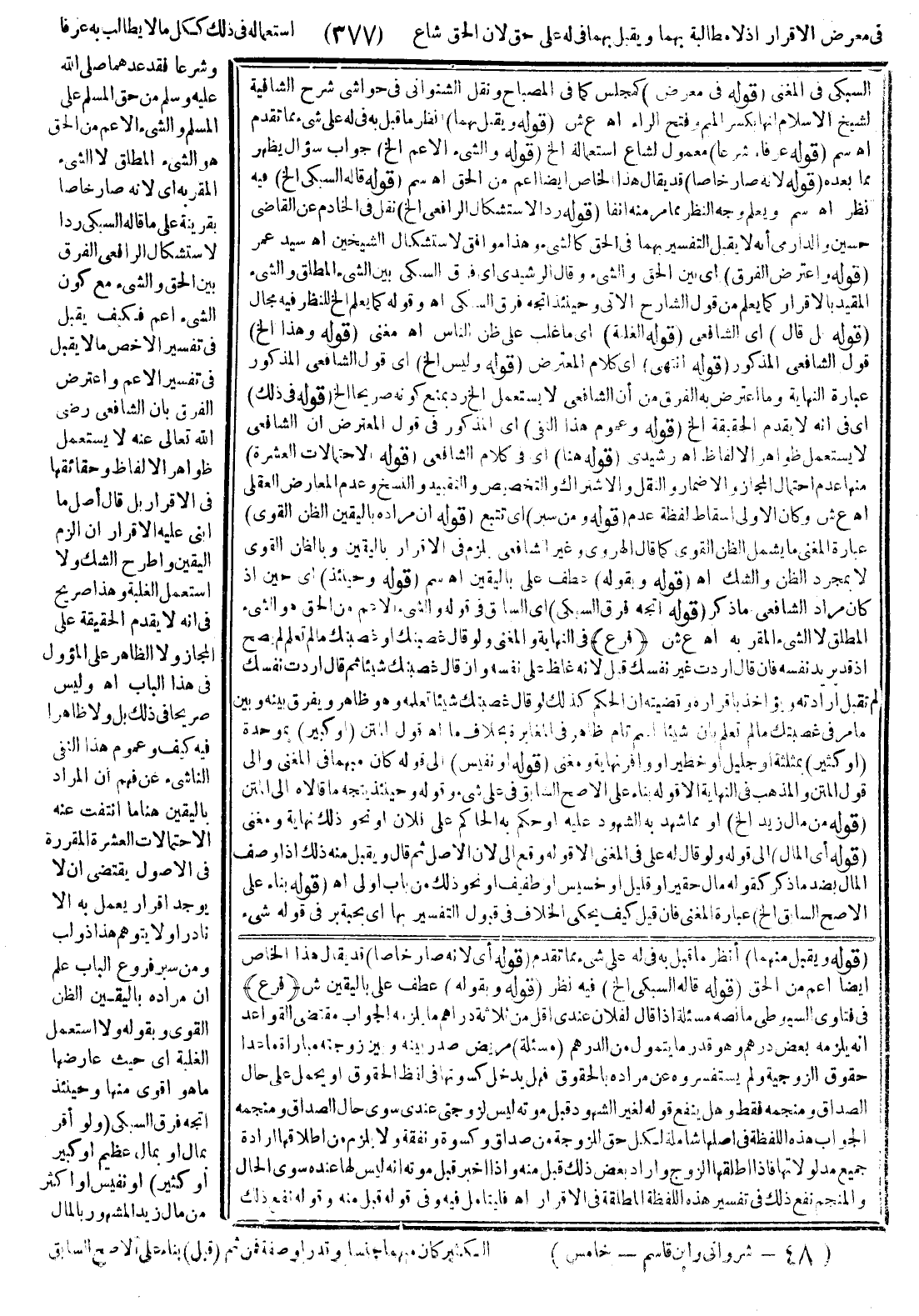 فِي مَعْرِضِ الْإِقْرَارِ إذْ لَا مُطَالَبَةَ بِهِمَا وَيُقْبَلُ بِهِمَا فِي لَهُ عَلَيَّ حَقٌّ؛ لِأَنَّ الْحَقَّ قَدْ شَاعَ اسْتِعْمَالُهُ فِي ذَلِكَ كَكُلِّ مَا لَا يُطَالَبُ بِهِ عُرْفًا وَشَرْعًا فَقَدْ عَدَّهُمَا - صَلَّى اللَّهُ عَلَيْهِ وَسَلَّمَ - مِنْ حَقِّ الْمُسْلِمِ عَلَى الْمُسْلِمِ وَالشَّيْءُ الْأَعَمُّ مِنْ الْحَقِّ هُوَ الشَّيْءُ الْمُطْلَقُ لَا الشَّيْءُ الْمُقَرُّ بِهِ أَيْ؛ لِأَنَّهُ صَارَ خَاصًّا بِقَرِينَةِ عَلَيَّ قَالَهُ السُّبْكِيُّ رَدًّا لِاسْتِشْكَالِ الرَّافِعِيِّ الْفَرْقَ بَيْنَ الْحَقِّ وَالشَّيْءِ مَعَ كَوْنِ الشَّيْءِ أَعَمَّ فَكَيْفَ يُقْبَلُ فِي تَفْسِيرِ الْأَخَصِّ مَا لَا يُقْبَلُ فِي تَفْسِيرِ الْأَعَمِّ وَاعْتَرَضَ الْفَرْقُ بِأَنَّ الشَّافِعِيَّ - رَضِيَ اللَّهُ تَعَالَى عَنْهُ - لَا يَسْتَعْمِلُ ظَوَاهِرَ الْأَلْفَاظِ وَحَقَائِقَهَا فِي الْإِقْرَارِ، بَلْ قَالَ أَصْلُ مَا أَبْنِي عَلَيْهِ الْإِقْرَارَ أَنْ أَلْزَمَ الْيَقِينَ وَأَطْرَحَ الشَّكَّ وَلَا أَسْتَعْمِلُ الْغَلَبَةَ وَهَذَا صَرِيحٌ فِي أَنَّهُ لَا يُقَدِّمُ الْحَقِيقَةَ عَلَى الْمَجَازِ وَلَا الظَّاهِرَ عَلَى الْمُؤَوَّلِ فِي هَذَا الْبَابِ. اهـ.