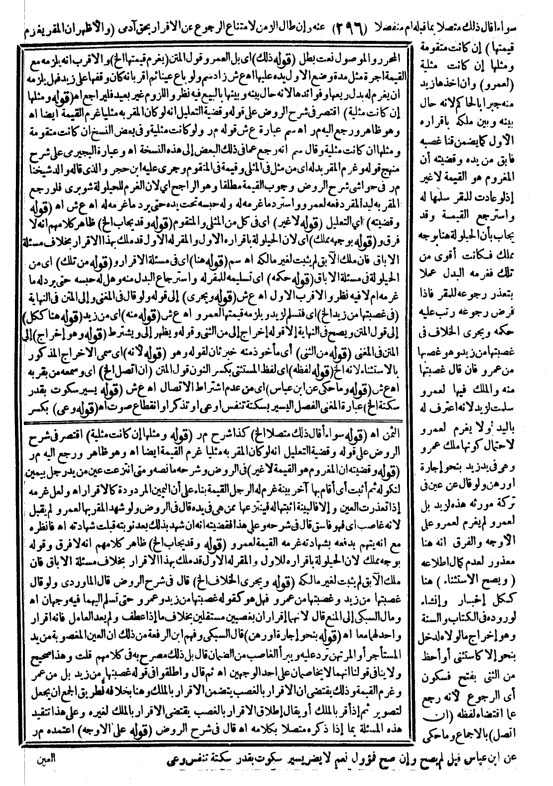 سَوَاءٌ أَقَالَ ذَلِكَ مُتَّصِلًا بِمَا قَبْلَهُ أَمْ مُنْفَصِلًا عَنْهُ، وَإِنْ طَالَ الزَّمَنُ لِامْتِنَاعِ الرُّجُوعِ عَنْ الْإِقْرَارِ بِحَقٍّ آدَمِيٍّ (وَالْأَظْهَرُ أَنَّ الْمُقِرَّ يَغْرَمُ قِيمَتَهَا) إنْ كَانَتْ مُتَقَوِّمَةً وَمِثْلُهَا إنْ كَانَتْ مِثْلِيَّةً (لِعَمْرٍو) وَإِنْ أَخَذَهَا زَيْدٌ مِنْهُ جَبْرًا بِالْحَاكِمِ لِأَنَّهُ حَالَ بَيْنَهُ وَبَيْنَ مِلْكِهِ بِإِقْرَارِهِ الْأَوَّلِ كَمَا يَضْمَنُ قِنًّا غَصَبَهُ فَأَبَقَ مِنْ يَدِهِ وَقَضِيَّتُهُ أَنَّ الْمَغْرُومَ هُوَ الْقِيمَةُ لَا غَيْرُ إذْ لَوْ عَادَتْ لِلْمُقِرِّ سَلَّمَهَا لَهُ وَاسْتَرْجَعَ الْقِيمَةَ، وَقَدْ يُجَابُ بِأَنَّ الْحَيْلُولَةَ هُنَا بِوَجْهٍ مُمَلَّكٍ فَكَانَتْ أَقْوَى مِنْ تِلْكَ فَغَرِمَهُ الْبَدَلَ عَمَلًا بِتَعَذُّرِ رُجُوعِهِ لِلْمُقِرِّ فَإِذَا فُرِضَ رُجُوعُهُ رَتَّبَ عَلَيْهِ حُكْمَهُ وَيَجْرِي الْخِلَافُ فِي غَصَبْتهَا مِنْ زَيْدٍ وَهُوَ غَصَبَهَا مِنْ عُمَرَ فَإِنْ قَالَ غَصَبْتهَا مِنْهُ وَالْمِلْكُ فِيهَا لِعَمْرٍو سُلِّمَتْ لِزَيْدٍ لِأَنَّهُ اعْتَرَفَ لَهُ بِالْيَدِ وَلَا يَغْرَمُ لِعَمْرٍو لِاحْتِمَالِ كَوْنِهَا مِلْكَ عَمْرٍو وَهِيَ فِي يَدِ زَيْدٍ بِنَحْوِ إجَارَةٍ أَوْ رَهْنٍ، وَلَوْ قَالَ عَنْ عَيْنٍ فِي تَرِكَةٍ مُورِثَةٍ هَذِهِ لِزَيْدٍ بَلْ لِعَمْرٍو لَمْ يَغْرَمْ لِعَمْرٍو عَلَى الْأَوْجَهِ وَالْفَرْقُ أَنَّهُ هُنَا مَعْذُورٌ لِعَدَمِ كَمَالِ اطِّلَاعِهِ.