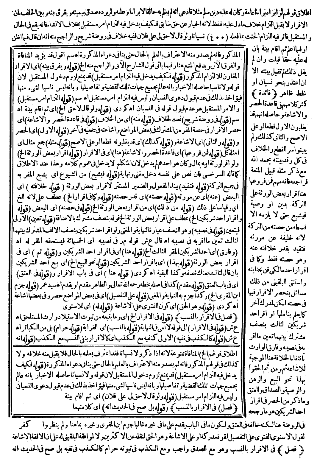(قَوْلُهُ الْتِزَامُ أَمْرٍ مُسْتَقْبَلٍ) وَالْأَمْرُ الْمُسْتَقْبَلُ هُوَ عَدَمُ قَبُولِ قَوْلِهِ فِي النِّسْيَانِ اهـ كُرْدِيٌّ. (قَوْلُهُ: وَلَوْ قَالَ لَا حَقَّ إلَخْ) أَيْ، ثُمَّ أَقَامَ بَيِّنَةً اهـ سم. (قَوْلُهُ فِي رَوْضَةِ شُرَيْحٍ) نَعْتٌ لِخِلَافٍ. (قَوْلُهُ مِنْهُ) أَيْ مِنْ الْخِلَافِ. (قَوْلُهُ فِي قَاعِدَةِ الْحَصْرِ وَالْإِشَاعَةِ) أَيْ حَصْرِ الْإِقْرَارِ فِي حِصَّةِ الْمُقِرِّ مِنْ الْمُشْتَرَكِ فِي بَعْضِ الْمَوَاضِعِ وَإِشَاعَتِهِ فِي جَمِيعِهِ فِي آخَرَ. (قَوْلُهُ الْأَوَّلُ) أَيْ الْحَصْرُ وَ (قَوْلُهُ وَالثَّانِي) أَيْ الْإِشَاعَةُ (وَقَوْلُهُ كَذَلِكَ) أَيْ قَدْ يُغَلِّبُونَهُ قَطْعًا أَوْ عَلَى الْأَصَحِّ. (قَوْلُهُ مُثُلُهُ) جَمْعُ مِثَالٍ أَيْ أَمْثِلَةُ كُلٍّ. (قَوْلُهُ فَمِنْ فُرُوعِهَا) أَيْ قَاعِدَةِ الْحَصْرِ وَالْإِشَاعَةِ (هُنَا) أَيْ فِي الْإِقْرَارِ. (قَوْلُهُ إقْرَارُ بَعْضِ الْوَرَثَةِ إلَخْ) وَلَوْ أَقَرَّ لِوَرَثَةِ أَبِيهِ بِمَالٍ وَكَانَ هُوَ أَحَدَهُمْ لَمْ يَدْخُلْ لِأَنَّ الْمُتَكَلِّمَ لَا يَدْخُلُ فِي عُمُومِ كَلَامِهِ وَهَذَا عِنْدَ الْإِطْلَاقِ كَمَا قَالَهُ السَّرَخْسِيُّ فَإِنْ نَصَّ عَلَى نَفْسِهِ دَخَلَ مُغْنِي وَنِهَايَةٌ. (قَوْلُهُ فَيَشِيعُ) مِنْ الشُّيُوعِ أَيْ يَشِيعُ الْمُقَرُّ بِهِ فِي جَمِيعِ التَّرِكَةِ. (قَوْلُهُ فَتُقَيَّدُ) بِبِنَاءِ الْمَفْعُولِ وَالضَّمِيرُ الْمُسْتَتِرُ لِإِقْرَارِ بَعْضِ الْوَرَثَةِ.