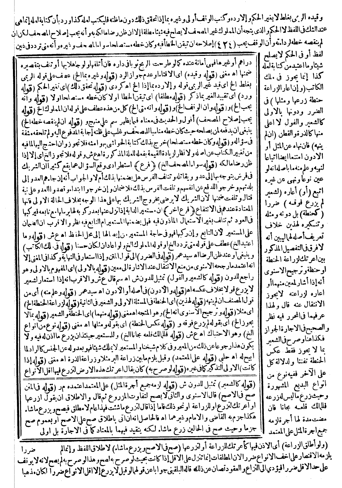 وَقَيَّدَهُ الرِّيمِيُّ بِغَلَطٍ لَا يُغَيِّرُ الْحُكْمَ وَإِلَّا رَدَّهُ وَكُتُبُ الْوَقْفِ أَوْلَى وَغَيْرُهُ بِمَا إذَا تَحَقَّقَ ذَلِكَ دُونَ مَا ظَنَّهُ فَلْيَكْتُبْ لَعَلَّهُ كَذَا وَرُدَّ بِأَنَّ كِتَابَةَ لَعَلَّهُ إنَّمَا هِيَ عِنْدَ الشَّكِّ فِي اللَّفْظِ لَا الْحُكْمِ وَاَلَّذِي يَتَّجِهُ أَنَّ الْمَمْلُوكَ غَيْرَ الْمُصْحَفِ لَا يَصْلُحُ فِيهِ شَيْءٌ مُطْلَقًا إلَّا إنْ ظَنَّ رِضَا مَالِكِهِ بِهِ وَأَنَّهُ يَجِبُ إصْلَاحُ الْمُصْحَفِ لَكِنْ إنْ لَمْ يَنْقُصْهُ خَطُّهُ لِرَدَاءَتِهِ وَإِنَّ الْوَقْفَ يَجِبُ إصْلَاحُهُ إنْ تَيَقَّنَ الْخَطَأَ فِيهِ وَكَانَ خَطُّهُ مُسْتَصْلَحًا سَوَاءٌ الْمُصْحَفُ وَغَيْرُهُ وَأَنَّهُ مَتَى تَرَدَّدَ فِي عَيْنِ لَفْظٍ أَوْ فِي الْحُكْمِ لَا يُصْلِحُ شَيْئًا وَمَا اُعْتِيدَ مِنْ كِتَابَةِ لَعَلَّهُ كَذَا إنَّمَا يَجُوزُ فِي مِلْكِ الْكَاتِبِ (وَإِنْ أَعَارَهُ لِزِرَاعَةِ حِنْطَةٍ زَرَعَهَا وَمِثْلِهَا) فِي الضَّرَرِ وَدُونَهَا بِالْأَوْلَى كَالشَّعِيرِ وَالْفُولِ لَا أَعْلَى مِنْهَا كَالذُّرَةِ وَالْقُطْنِ (إنْ لَمْ يَنْهَهُ) فَإِنْ نَهَاهُ عَنْ الْمِثْلِ أَوْ الْأَدْوَنِ امْتَنَعَا أَيْضًا اتِّبَاعًا لِنَهْيِهِ وَعُلِمَ مِنْهُ مَا بِأَصْلِهِ أَنَّهُ لَوْ عَيَّنَ نَوْعًا وَنَهَى عَنْ غَيْرِهِ اُتُّبِعَ (أَوْ) أَعَارَهُ (لِشَعِيرٍ لَمْ يُزْرَعْ فَوْقَهُ) ضَرَرًا (كَحِنْطَةٍ) بَلْ دُونَهُ وَمِثْلُهُ وَتَنْكِيرُهُ لِهَذَيْنِ خِلَافُ تَعْرِيفِ أَصْلِهِ لَهُمَا لِيُبَيِّنَ أَنَّهُ لَا فَرْقَ فِي التَّفْصِيلِ الْمَذْكُورِ بَيْنَ أَعَرْتُك لِزِرَاعَةِ الْحِنْطَةِ أَوْ حِنْطَةٍ