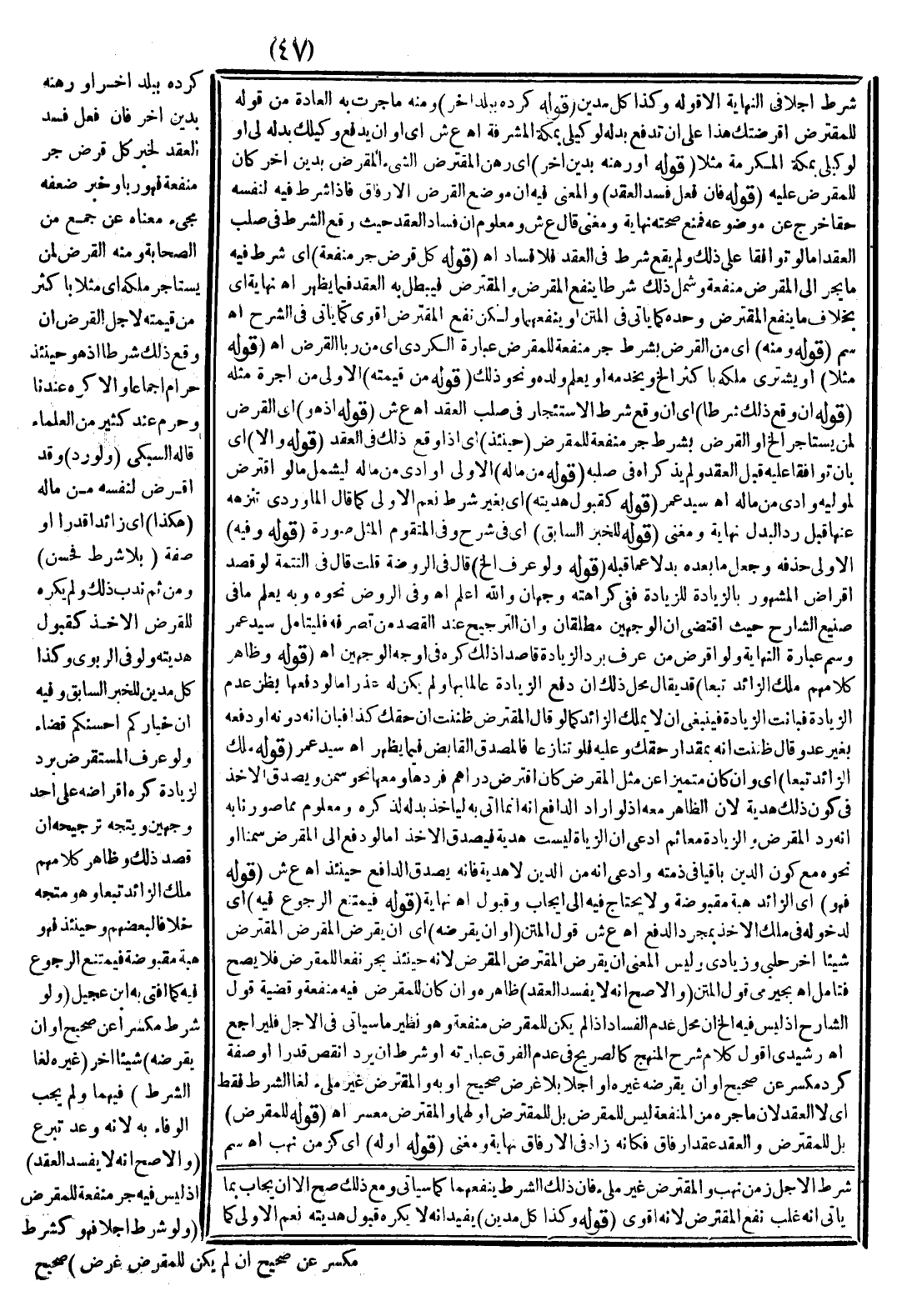 وَفِي الرَّوْضِ نَحْوُهُ وَبِهِ يُعْلَمُ مَا فِي صَنِيعِ الشَّارِحِ حَيْثُ اقْتَضَى أَنَّ الْوَجْهَيْنِ مُطْلَقَانِ وَأَنَّ التَّرْجِيحَ عِنْدَ الْقَصْدِ مِنْ تَصَرُّفِهِ فَلْيُتَأَمَّلْ سَيِّدُ عُمَرَ وَسَمِّ عِبَارَةُ النِّهَايَةِ. وَلَوْ أَقْرَضَ مَنْ عُرِفَ بِرَدِّ الزِّيَادَةِ قَاصِدًا ذَلِكَ كُرِهَ فِي أَوْجِهِ الْوَجْهَيْنِ اهـ.