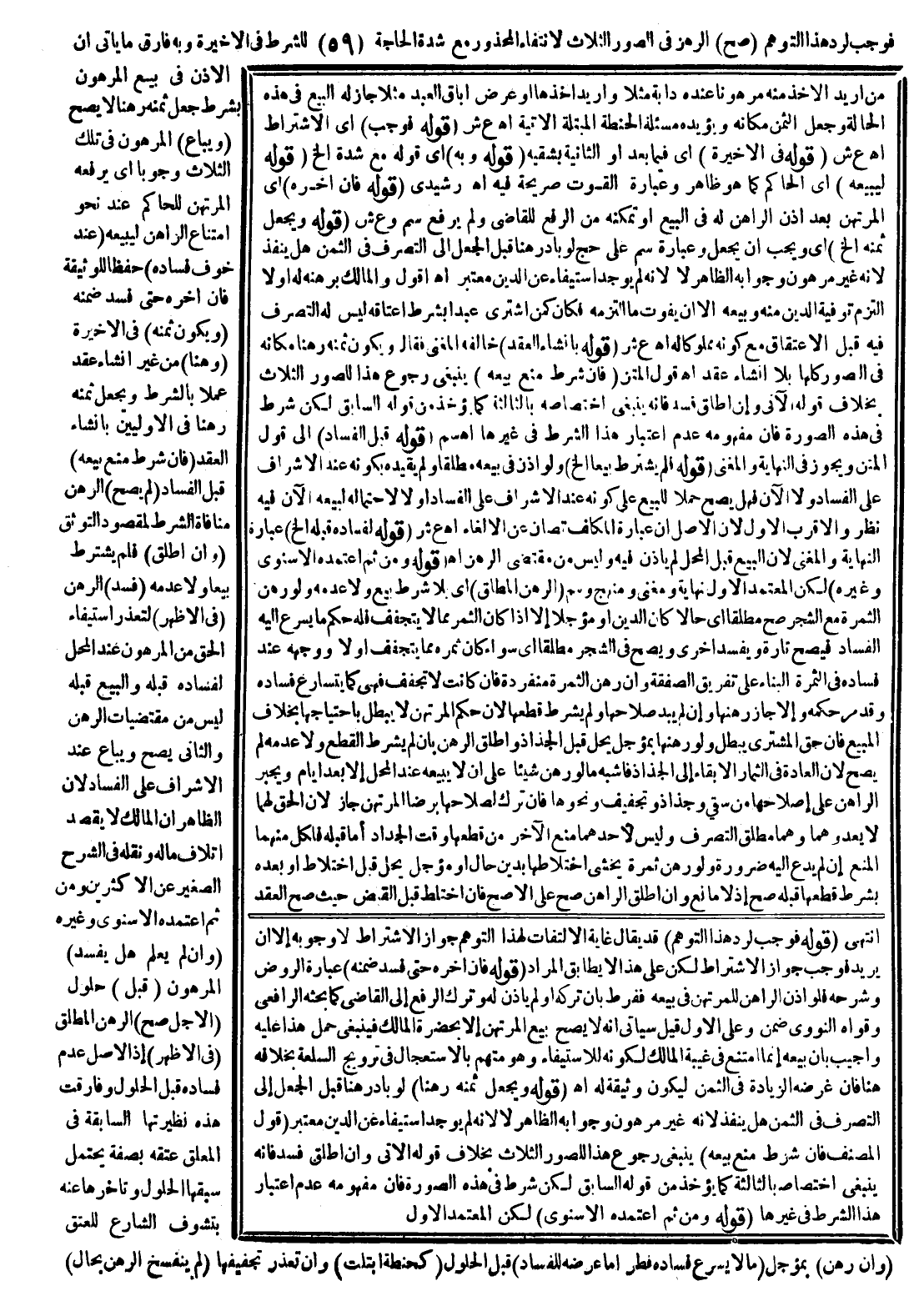 فَوَجَبَ لِرَدِّ هَذَا التَّوَهُّمِ (صَحَّ) الرَّهْنُ فِي الصُّوَرِ الثَّلَاثِ لِانْتِفَاءِ الْمَحْذُورِ مَعَ شِدَّةِ الْحَاجَةِ لِلشَّرْطِ فِي الْأَخِيرَةِ، وَبِهِ فَارَقَ مَا يَأْتِي أَنَّ الْإِذْنَ فِي بَيْعِ الْمَرْهُونِ بِشَرْطِ جَعْلِ ثَمَنِهِ رَهْنًا لَا يَصِحُّ (وَيُبَاعُ) الْمَرْهُونُ فِي تِلْكَ الثَّلَاثِ وُجُوبًا أَيْ يَرْفَعُهُ الْمُرْتَهِنُ لِلْحَاكِمِ عِنْدَ نَحْوِ امْتِنَاعِ الرَّاهِنِ لِيَبِيعَهُ (عِنْدَ خَوْفِ فَسَادِهِ) حِفْظًا لِلْوَثِيقَةِ فَإِنْ أَخَّرَهُ حَتَّى فَسَدَ ضَمِنَهُ (وَيَكُونُ ثَمَنُهُ) فِي الْأَخِيرَةِ (رَهْنًا) مِنْ غَيْرِ إنْشَاءِ عَقْدٍ عَمَلًا بِالشَّرْطِ وَيَجْعَلُ ثَمَنَهُ رَهْنًا فِي الْأُولَيَيْنِ بِإِنْشَاءِ الْعَقْدِ (فَإِنْ شَرَطَ مَنْعَ بَيْعِهِ) قَبْلَ الْفَسَادِ (لَمْ يَصِحَّ) الرَّهْنُ لِمُنَافَاةِ الشَّرْطِ لِمَقْصُودِ التَّوَثُّقِ (وَإِنْ أَطْلَقَ) فَلَمْ يَشْرِطْ بَيْعًا وَلَا عَدَمَهُ (فَسَدَ) الرَّهْنُ (فِي الْأَظْهَرِ) لِتَعَذُّرِ اسْتِيفَاءِ الْحَقِّ مِنْ الْمَرْهُونِ عِنْدَ الْمَحَلِّ لِفَسَادِهِ قَبْلَهُ، وَالْبَيْعُ قَبْلَهُ لَيْسَ مِنْ مُقْتَضَيَاتِ الرَّهْنِ وَالثَّانِي يَصِحُّ وَيُبَاعُ عِنْدَ الْإِشْرَافِ عَلَى الْفَسَادِ؛ لِأَنَّ الظَّاهِرَ أَنَّ الْمَالِكَ لَا يَقْصِدُ إتْلَافَ مَالِهِ وَنَقَلَهُ فِي الشَّرْحِ الصَّغِيرِ عَنْ الْأَكْثَرِينَ وَمِنْ ثَمَّ اعْتَمَدَهُ الْإِسْنَوِيُّ وَغَيْرُهُ (وَإِنْ لَمْ يَعْلَمْ هَلْ يَفْسُدْ) الْمَرْهُونُ (قَبْلَ) حُلُولِ (الْأَجَلِ صَحَّ) الرَّهْنُ الْمُطْلَقُ (فِي الْأَظْهَرِ) إذْ الْأَصْلُ عَدَمُ فَسَادِهِ قَبْلَ الْحُلُولِ وَفَارَقَتْ هَذِهِ نَظِيرَتَهَا السَّابِقَةَ فِي الْمُعَلَّقِ عِتْقُهُ بِصِفَةٍ يُحْتَمَلُ سَبْقُهَا الْحُلُولَ وَتَأَخُّرُهَا عَنْهُ بِتَشَوُّفِ الشَّارِعِ لِلْعِتْقِ.