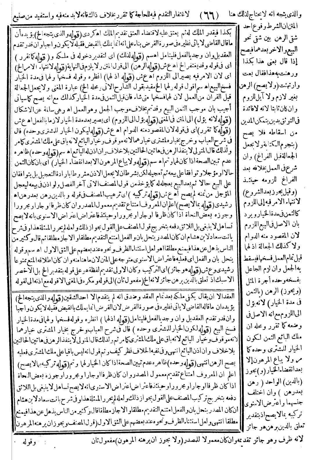 وَاَلَّذِي يُتَّجَهُ أَنَّهُ لَا يُحْتَاجُ لِذَلِكَ هُنَا لِاغْتِفَارِ التَّقَدُّمِ فِيهِ لِلْحَاجَةِ كَمَا تَقَرَّرَ بِخِلَافِ ذَاكَ فَإِنَّهُ لَا بُدَّ مِنْهُ فِيهِ وَاسْتُفِيدَ مِنْ صَنِيعِ الْمَتْنِ أَنَّ الشَّرْطَ وُقُوعُ أَحَدِ شِقَّيْ الرَّهْنِ بَيْنَ شِقَّيْ نَحْوِ الْبَيْعِ وَالْآخَرُ بَعْدَهُمَا فَيَصِحُّ إذَا قَالَ بِعْنِي هَذَا بِكَذَا وَرَهَنْت بِهِ هَذَا فَقَالَ بِعْت وَارْتَهَنْت.