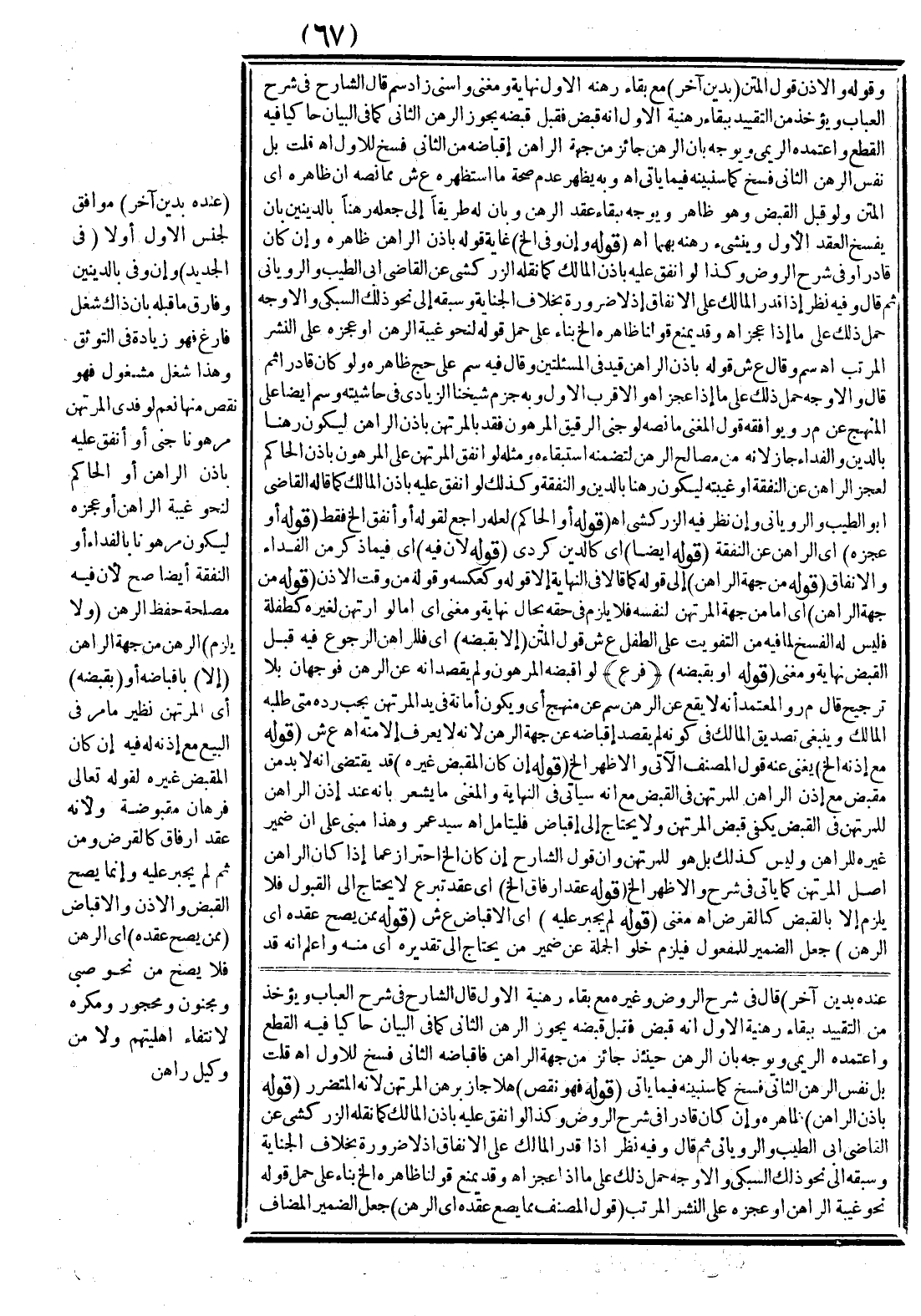 قُلْت بَلْ نَفْسُ الرَّهْنِ الثَّانِي فَسْخٌ كَمَا سَنُبَيِّنُهُ فِيمَا يَأْتِي (وَقَوْلُهُ فَهُوَ نَقْصٌ) هَلَّا جَازَ بِرَهْنِ الْمُرْتَهِنِ لِأَنَّهُ الْمُتَضَرِّرُ (قَوْلُهُ بِإِذْنِ الرَّاهِنِ) ظَاهِرُهُ وَإِنْ كَانَ قَادِرًا فِي شَرْحِ الرَّوْضِ وَكَذَا لَوْ أَنْفَقَ عَلَيْهِ بِإِذْنِ الْمَالِكِ كَمَا نَقَلَهُ الزَّرْكَشِيُّ عَنْ الْقَاضِي أَبِي الطَّيِّبِ وَالرُّويَانِيِّ ثُمَّ قَالَ وَفِيهِ نَظَرٌ إذَا قَدَرَ الْمَالِكُ عَلَى الْإِنْفَاقِ إذْ لَا ضَرُورَةَ بِخِلَافِ الْجِنَايَةِ وَسَبَقَهُ إلَى نَحْوِ ذَلِكَ السُّبْكِيُّ وَالْأَوْجَهُ حَمْلُ ذَلِكَ عَلَى مَا إذَا عَجَزَ انْتَهَى.