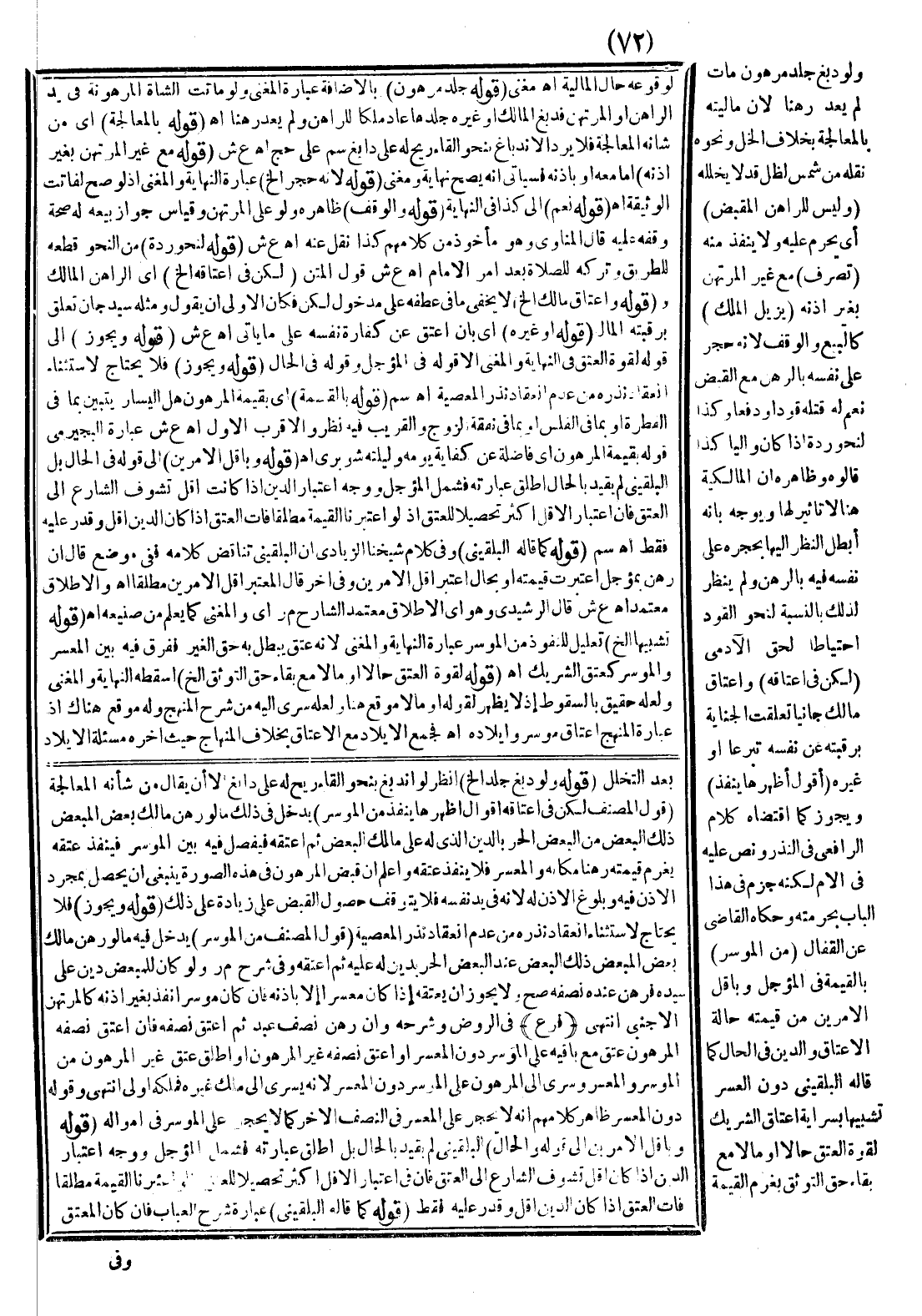 وَظَاهِرٌ أَنَّ الْمَالِكِيَّةَ هُنَا لَا تَأْثِيرَ لَهَا وَيُوَجَّهُ بِأَنَّهُ أَبْطَلَ النَّظَرَ إلَيْهَا بِحَجْرِهِ عَلَى نَفْسِهِ فِيهِ بِالرَّهْنِ وَلَمْ يَنْظُرْ لِذَلِكَ بِالنِّسْبَةِ لِنَحْوِ الْقَوَدِ احْتِيَاطًا لِحَقِّ الْآدَمِيِّ (لَكِنْ فِي إعْتَاقِهِ) وَإِعْتَاقِ مَالِكٍ جَانِيًا تَعَلَّقَتْ الْجِنَايَةُ بِرَقَبَتِهِ عَنْ نَفْسِهِ تَبَرُّعًا أَوْ غَيْرَهُ (أَقُولُ أَظْهَرُهَا يَنْفُذُ) وَيَجُوزُ كَمَا اقْتَضَاهُ كَلَامُ الرَّافِعِيِّ فِي النَّذْرِ وَنَصَّ عَلَيْهِ فِي الْأُمِّ لَكِنَّهُ جَزَمَ فِي هَذَا الْبَابِ بِحُرْمَتِهِ وَحَكَاهُ الْقَاضِي عَنْ الْقَفَّالِ (مِنْ الْمُوسِرِ) بِالْقِيمَةِ فِي الْمُؤَجَّلِ وَبِأَقَلِّ الْأَمْرَيْنِ مِنْ قِيمَتِهِ حَالَةَ الْإِعْتَاقِ وَالدَّيْنِ فِي الْحَالِ كَمَا قَالَهُ الْبُلْقِينِيُّ دُونَ الْمُعْسِرِ تَشْبِيهًا بِسِرَايَةِ إعْتَاقِ الشَّرِيكِ لِقُوَّةِ الْعِتْقِ حَالًا أَوْ مَآلًا مَعَ بَقَاءِ حَقِّ التَّوَثُّقِ بِغُرْمِ الْقِيمَةِ