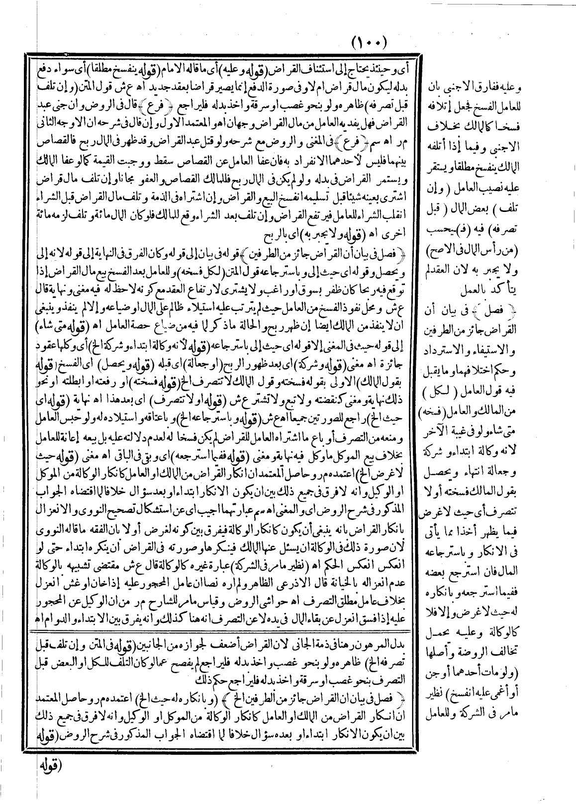 (فَصْلٌ فِي بَيَانِ أَنَّ الْقِرَاضَ جَائِزٌ مِنْ الطَّرَفَيْنِ) قَوْلُهُ فِي بَيَانِ إلَى قَوْلِهِ وَكَانَ الْفَرْقُ فِي النِّهَايَةِ إلَّا قَوْلَهُ؛ لِأَنَّهُ إلَى وَيَحْصُلُ وَقَوْلُهُ أَيْ حَيْثُ إلَى وَبِاسْتِرْجَاعِهِ قَوْلُ الْمَتْنِ (لِكُلٍّ فَسْخُهُ) وَلِلْعَامِلِ بَعْدَ الْفَسْخِ بَيْعُ مَالِ الْقِرَاضِ إذَا تَوَقَّعَ فِيهِ رِبْحًا كَأَنْ ظَفِرَ بِسُوقٍ أَوْ رَاغِبٍ وَلَا يَشْتَرِي لِارْتِفَاعِ الْعَقْدِ مَعَ كَوْنِهِ لَا حَظَّ لَهُ فِيهِ مُغْنِي وَنِهَايَةٌ قَالَ ع ش وَمَحَلُّ نُفُوذِ الْفَسْخِ مِنْ الْعَامِلِ حَيْثُ لَمْ يَتَرَتَّبْ عَلَيْهِ اسْتِيلَاءُ ظَالِمٍ عَلَى الْمَالِ أَوْ ضَيَاعُهُ، وَإِلَّا لَمْ يَنْفُذْ وَيَنْبَغِي أَنْ لَا يَنْفُذَ مِنْ الْمَالِكِ أَيْضًا إنْ ظَهَرَ رِبْحٌ وَالْحَالَةُ مَا ذُكِرَ لِمَا فِيهِ مِنْ ضَيَاعِ حِصَّةِ الْعَامِلِ. اهـ.