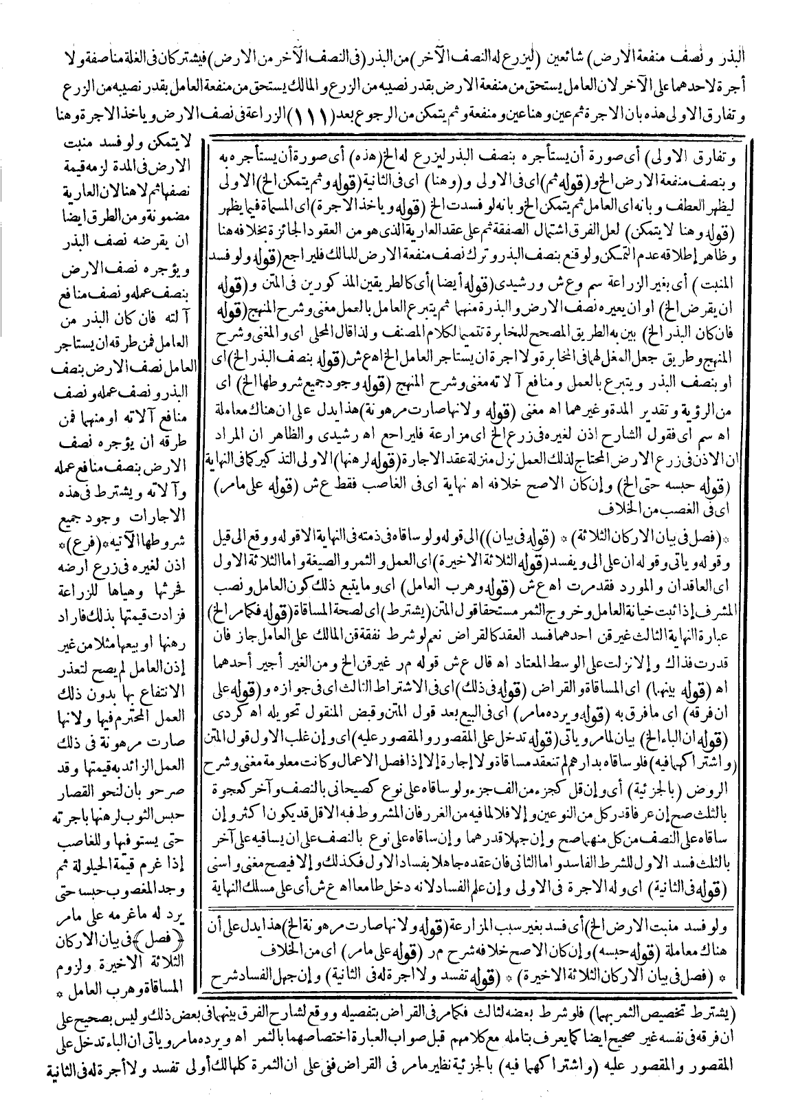 فِي بَيَانِ الْأَرْكَانِ الثَّلَاثَةِ الْأَخِيرَةِ وَلُزُومِ الْمُسَاقَاةِ وَهَرَبِ الْعَامِلِ (يُشْتَرَطُ تَخْصِيصُ الثَّمَرِ بِهِمَا) فَلَوْ شَرَطَ بَعْضَهُ لِثَالِثٍ فَكَمَا مَرَّ فِي الْقِرَاضِ بِتَفْصِيلِهِ وَوَقَعَ لِشَارِحٍ الْفَرْقُ بَيْنَهُمَا فِي بَعْضِ ذَلِكَ وَلَيْسَ بِصَحِيحٍ عَلَى أَنَّ فَرْقَهُ فِي نَفْسِهِ غَيْرُ صَحِيحٍ أَيْضًا كَمَا يُعْرَفُ بِتَأَمُّلِهِ مَعَ كَلَامِهِمْ، قِيلَ صَوَابُ الْعِبَارَةِ اخْتِصَاصُهُمَا بِالثَّمَرِ اهـ، وَيَرُدُّهُ مَا مَرَّ وَيَأْتِي أَنَّ الْبَاءَ تَدْخُلُ عَلَى الْمَقْصُورِ وَالْمَقْصُورِ عَلَيْهِ (وَاشْتِرَاكُهُمَا فِيهِ) بِالْجُزْئِيَّةِ نَظِيرَ مَا مَرَّ فِي الْقِرَاضِ فَفِي عَلَى أَنَّ الثَّمَرَةَ كُلَّهَا لَك أَوْ لِي تَفْسُدُ وَلَا أُجْرَةَ لَهُ فِي الثَّانِيَةِ
