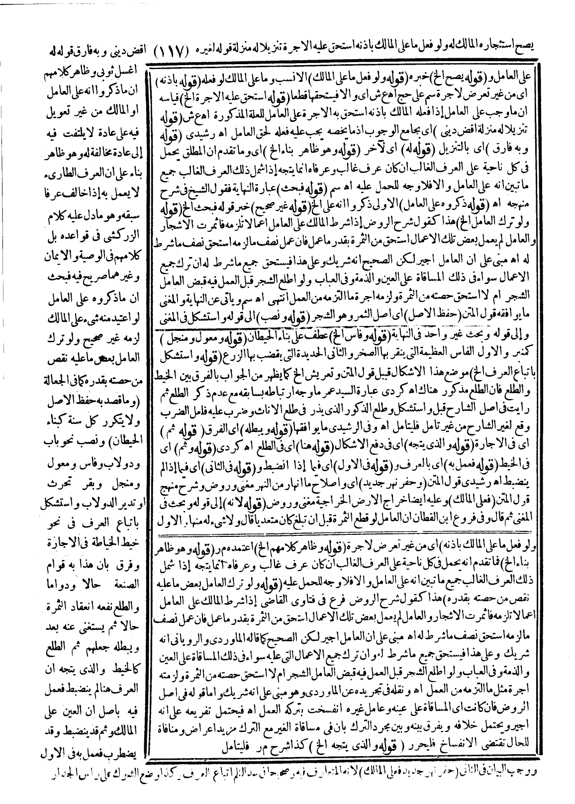 ـــــــــــــــــــــــــــــQعَلَى الْعَامِلِ وَ (قَوْلُهُ يَصِحُّ إلَخْ) خَبَرُهُ (قَوْلُهُ وَلَوْ فَعَلَ مَا عَلَى الْمَالِكِ) الْأَنْسَبُ وَمَا عَلَى الْمَالِكِ لَوْ فَعَلَهُ (قَوْلُهُ بِإِذْنِهِ) أَيْ مِنْ غَيْرِ تَعَرُّضٍ لِأُجْرَةٍ سم عَلَى حَجّ اهـ ع ش أَيْ وَإِلَّا فَيَسْتَحِقُّهَا قَطْعًا (قَوْلُهُ اسْتَحَقَّ عَلَيْهِ الْأُجْرَةَ إلَخْ) قِيَاسُهُ أَنَّ مَا وَجَبَ عَلَى الْعَامِلِ إذَا فَعَلَهُ الْمَالِكُ بِإِذْنِهِ اسْتَحَقَّ بِهِ الْأُجْرَةَ عَلَى الْعَامِلِ لِلْعِلَّةِ الْمَذْكُورَةِ اهـ ع ش (قَوْلُهُ تَنْزِيلًا لَهُ مَنْزِلَةَ اقْضِ دَيْنِي) أَيْ بِجَامِعِ الْوُجُوبِ إذْ مَا يَخُصُّهُ يَجِبُ عَلَيْهِ فِعْلُهُ لِحَقِّ الْعَامِلِ اهـ رَشِيدِيٌّ